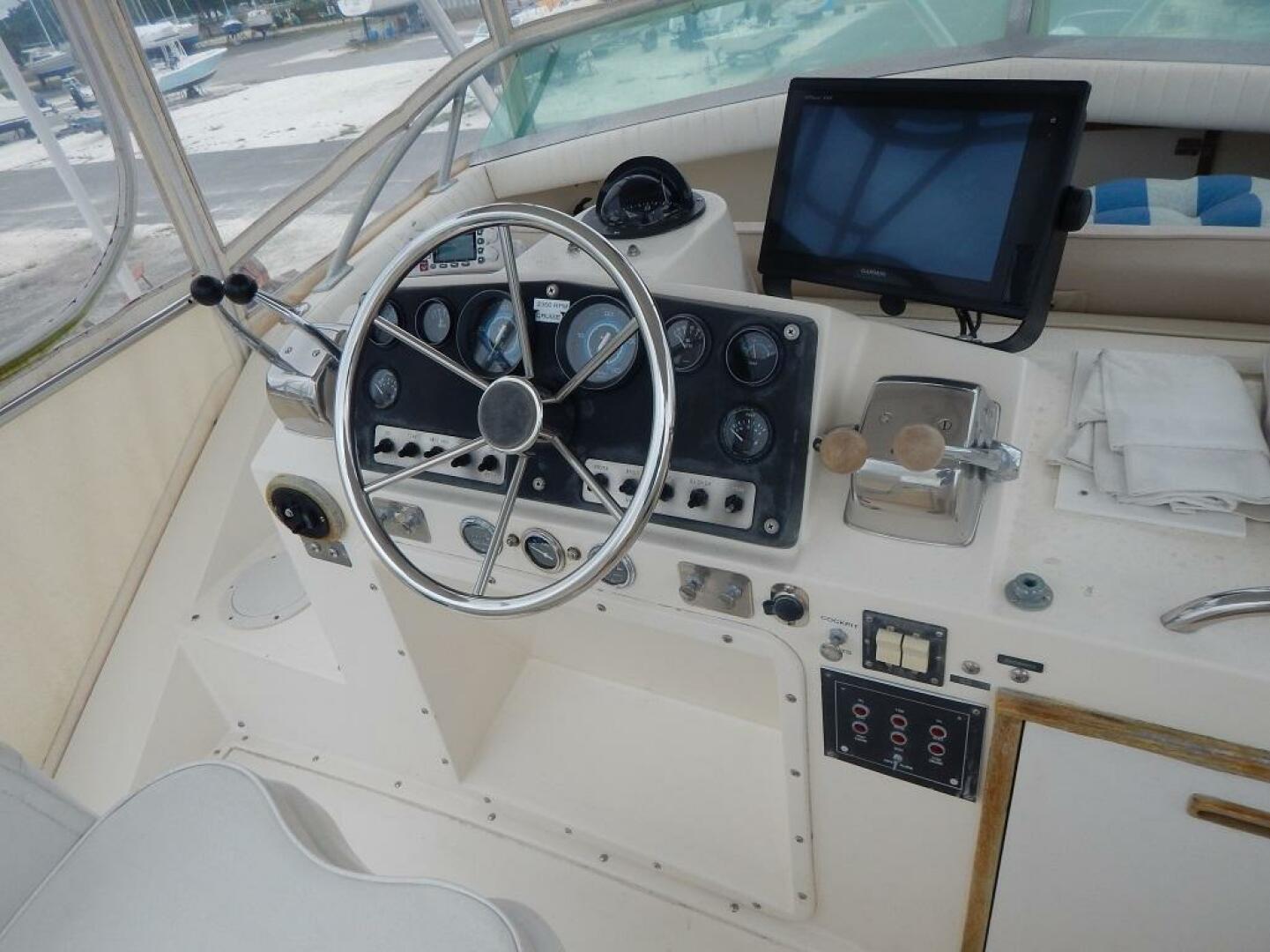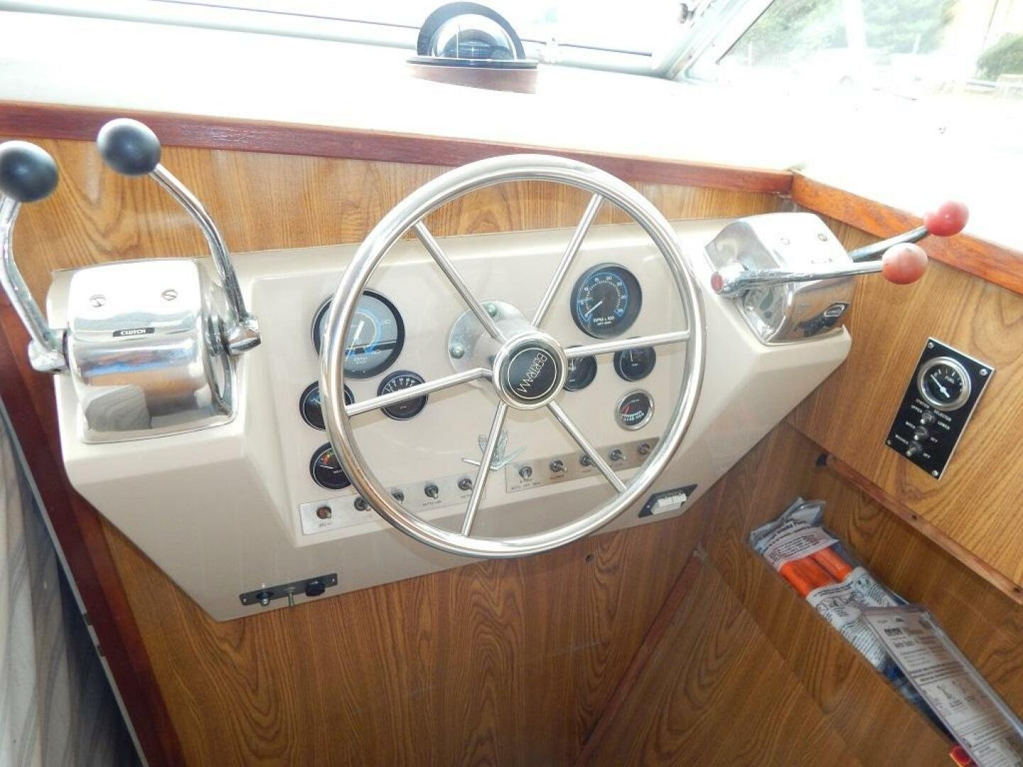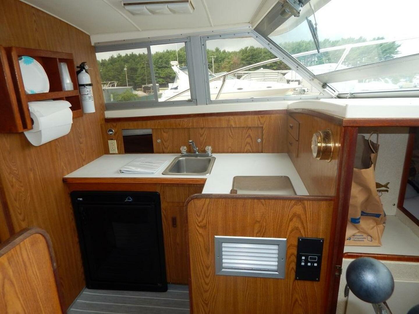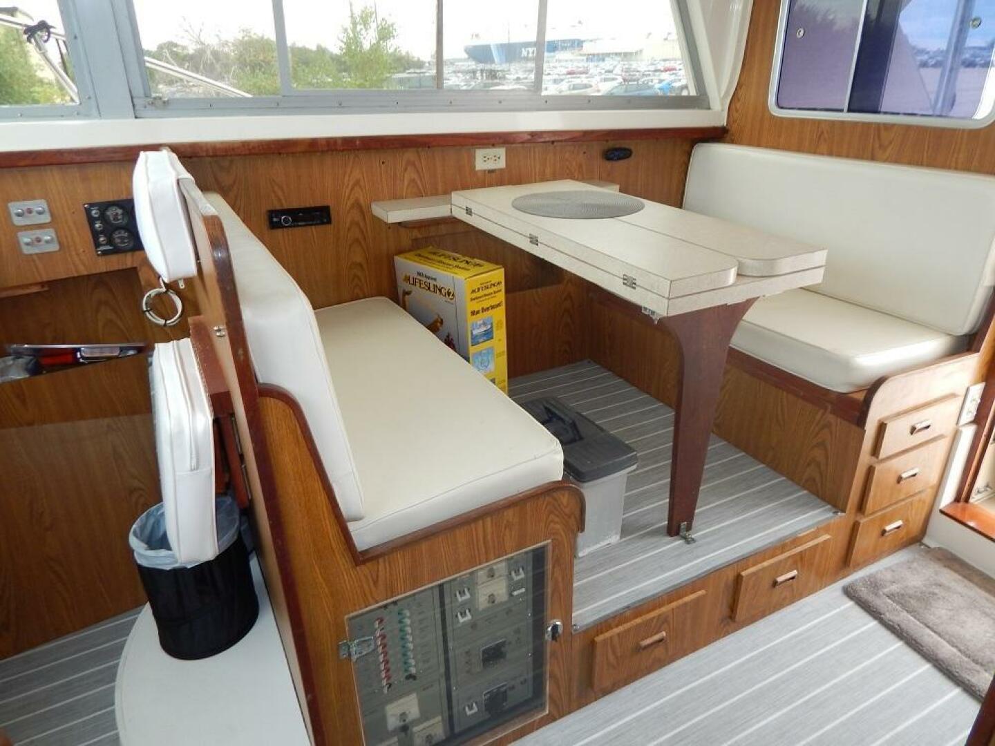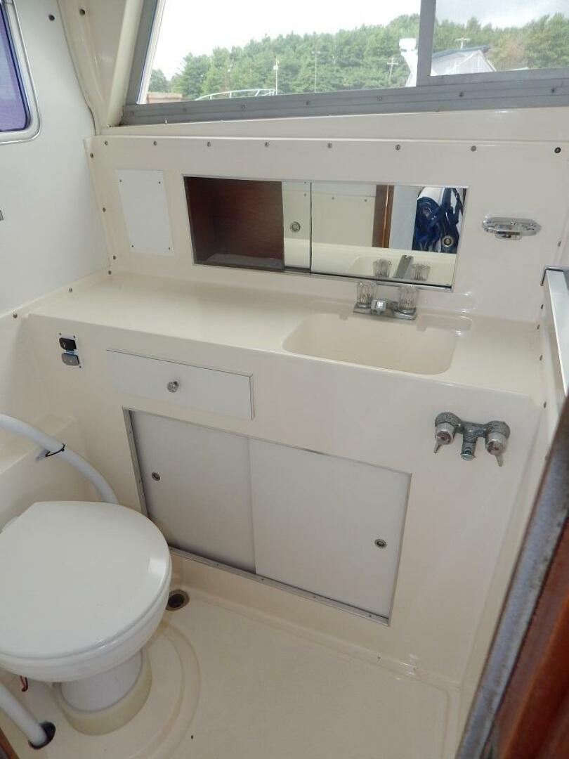 Accommodations; Starting forward is a large V-berth with cabinets and drawer storage. Next aft to port is the L-shaped galley, to port is the lower helm station. Aft to port is the enclosed head and to starboard is the convertible dinette.