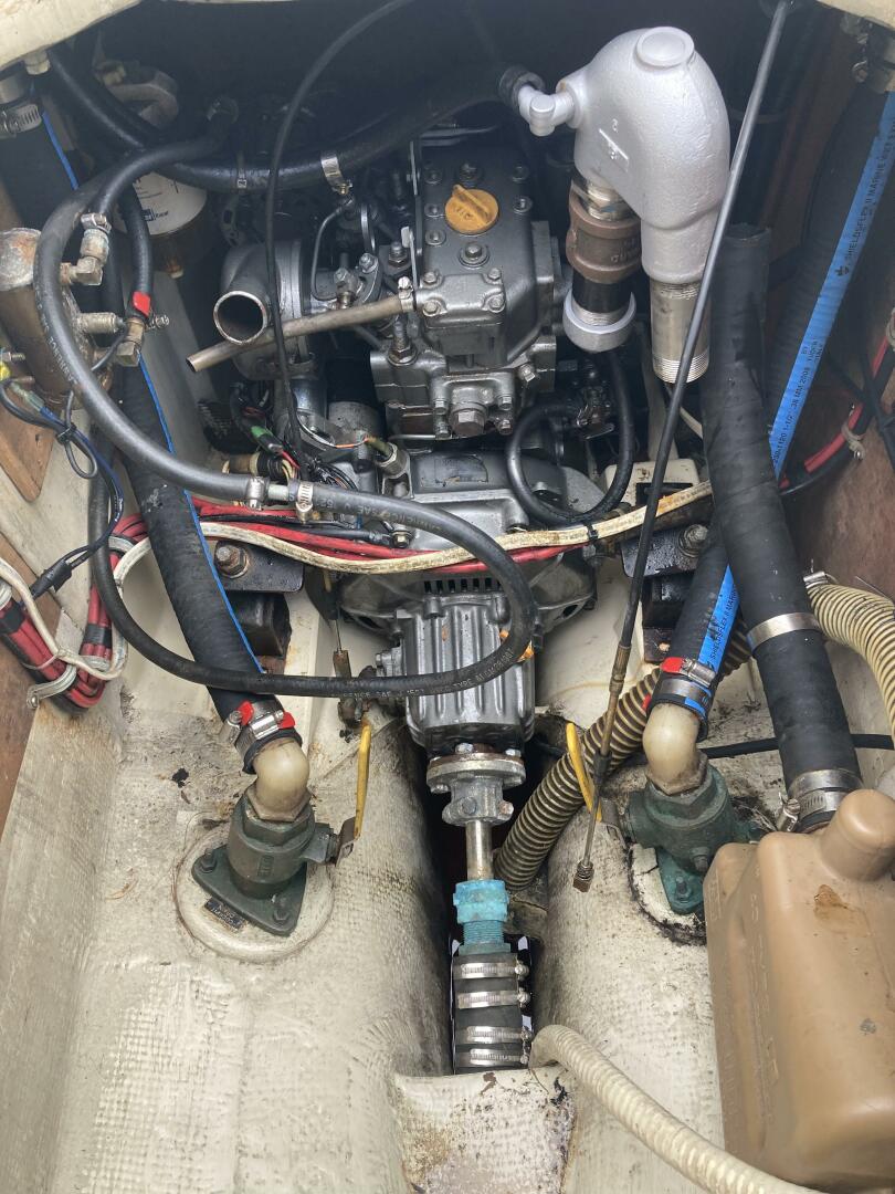 A cutter rig with 3' teak bowsprit with anchor roller, plow type anchor chain and nylon rode. Stainless steel bow and stern rails with stanchions and lifelines. Bronze cleats, chocks and opening ports. Large Bomar deck hatch. The cockpit with tiller steering can accommodate up to six adults. The cockpit bench seats are 6'3" long and 18" wide with storage below. There is a green dodger with matching cockpit cushions. A removable deck hatch in the cockpit floor provided good engine room access.