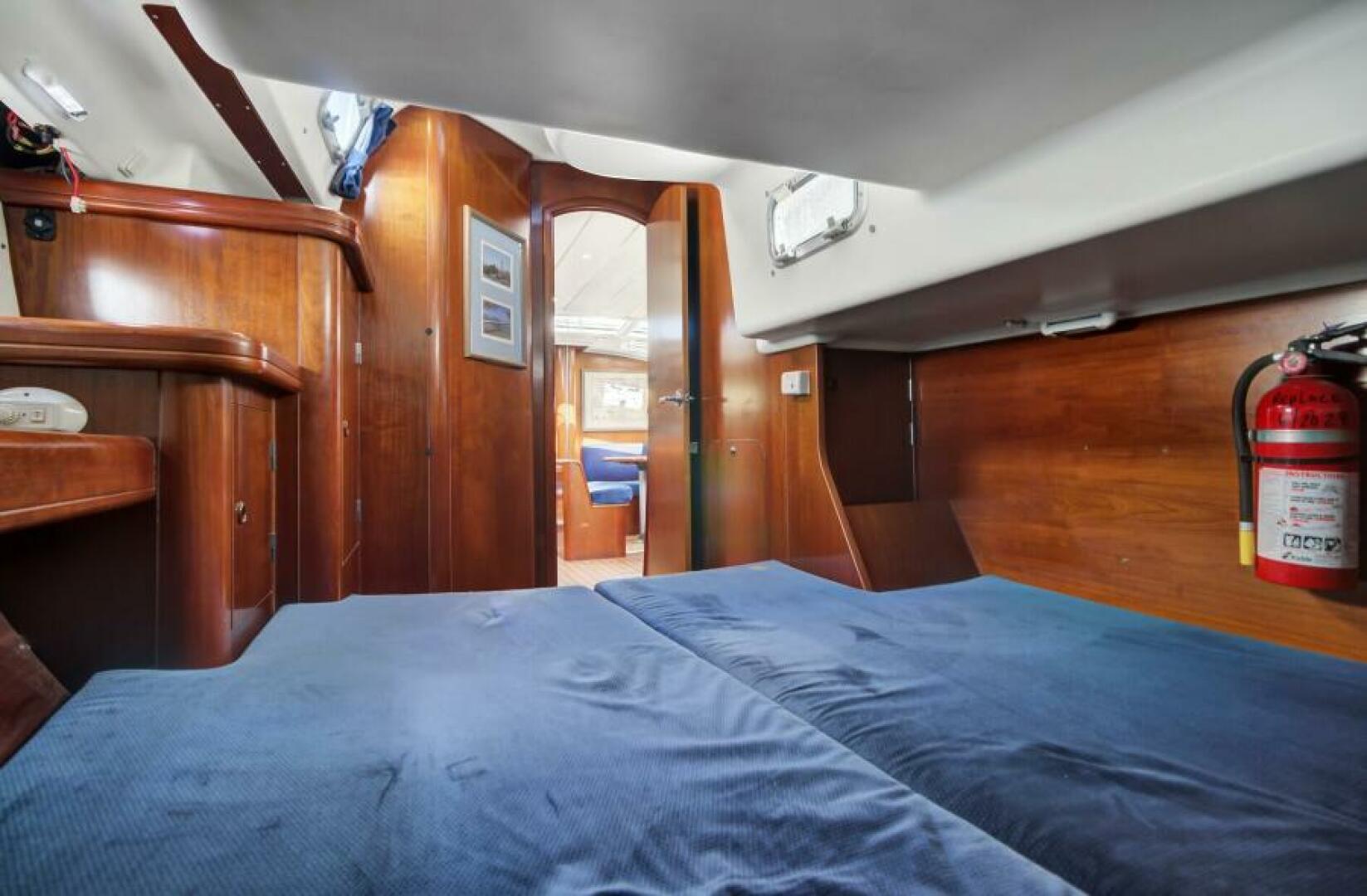 The spacious interior has a large salon with an open galley, three heads, three cabins, and a navigation station. The bright and comfortable space features attractive cherry joinery and blue upholstery. There are fixed windows, opening ports, and opening hatches throughout the space.