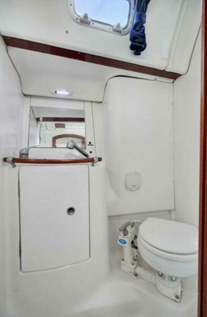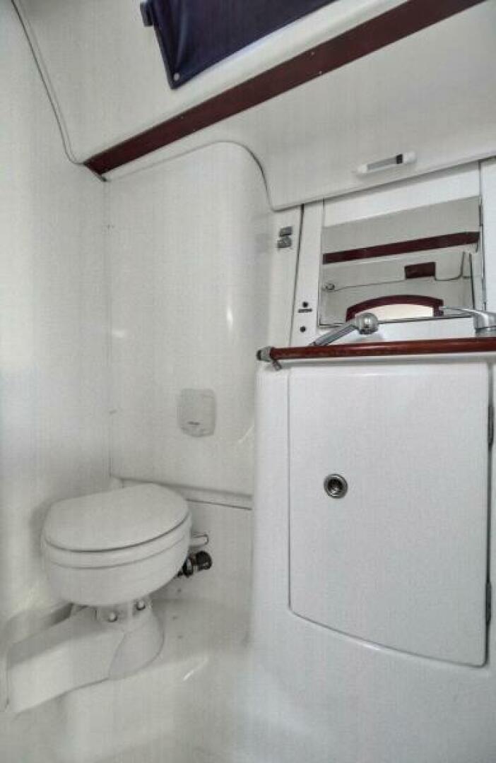 The Forward Head is located on the starboard side. It is accessible from the owner's cabin. The head has a separate shower with folding doors, Raritan Marine Elegance fresh-water electric flush toilet (2012), 30-gallon holding tank, mirror–fronted cabinet, one opening hatch, and a cabinet under the sink.