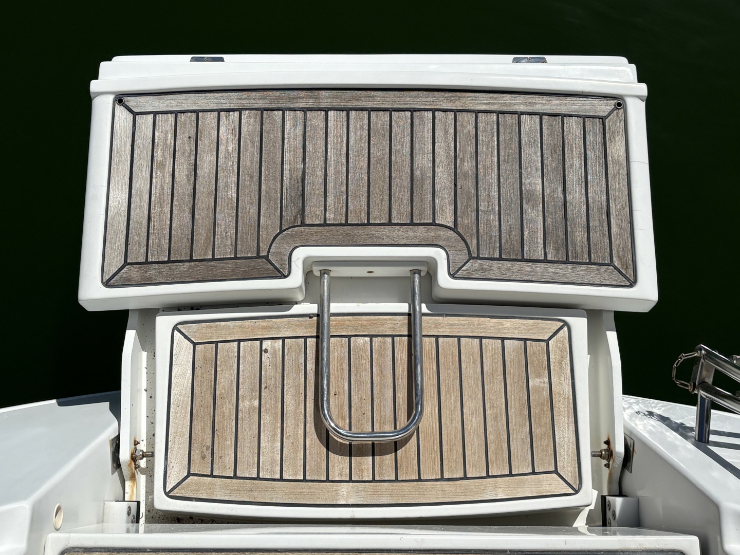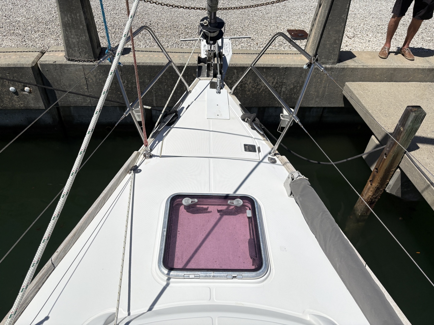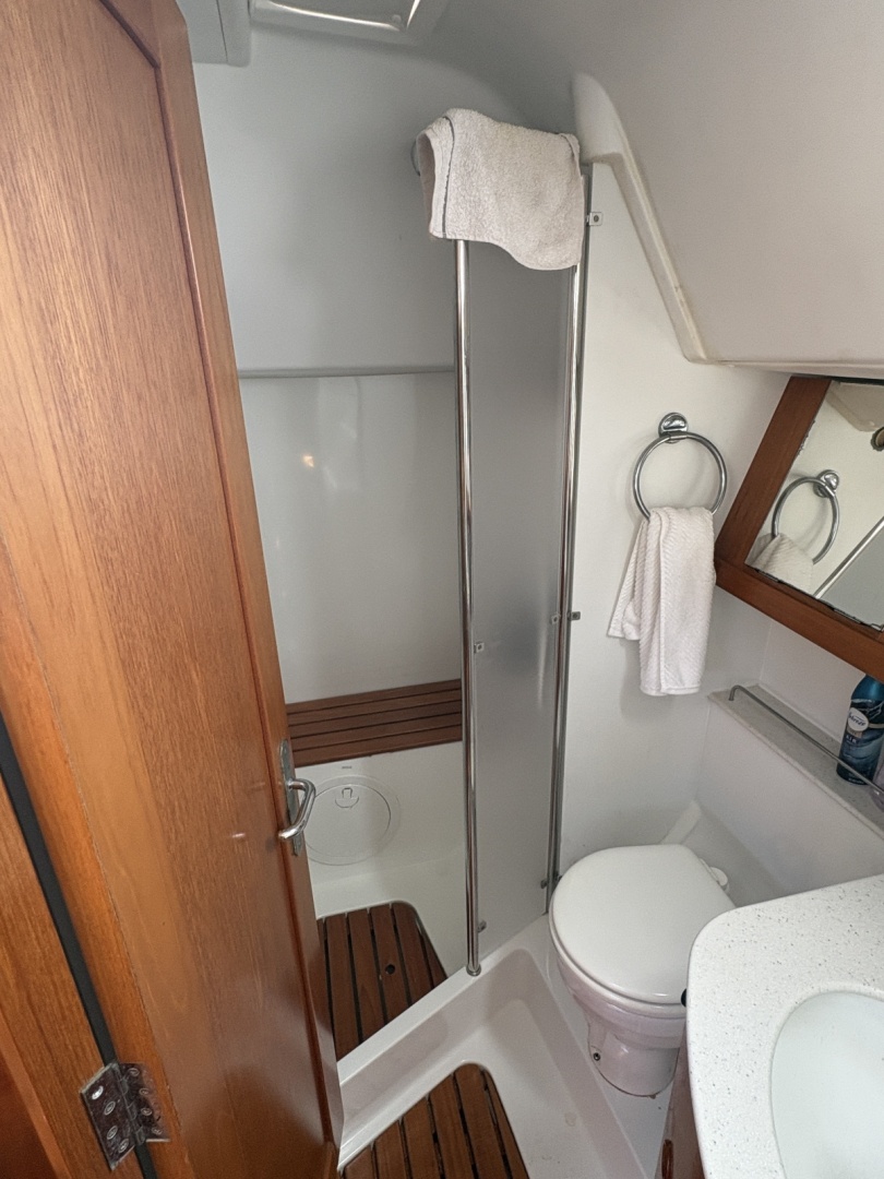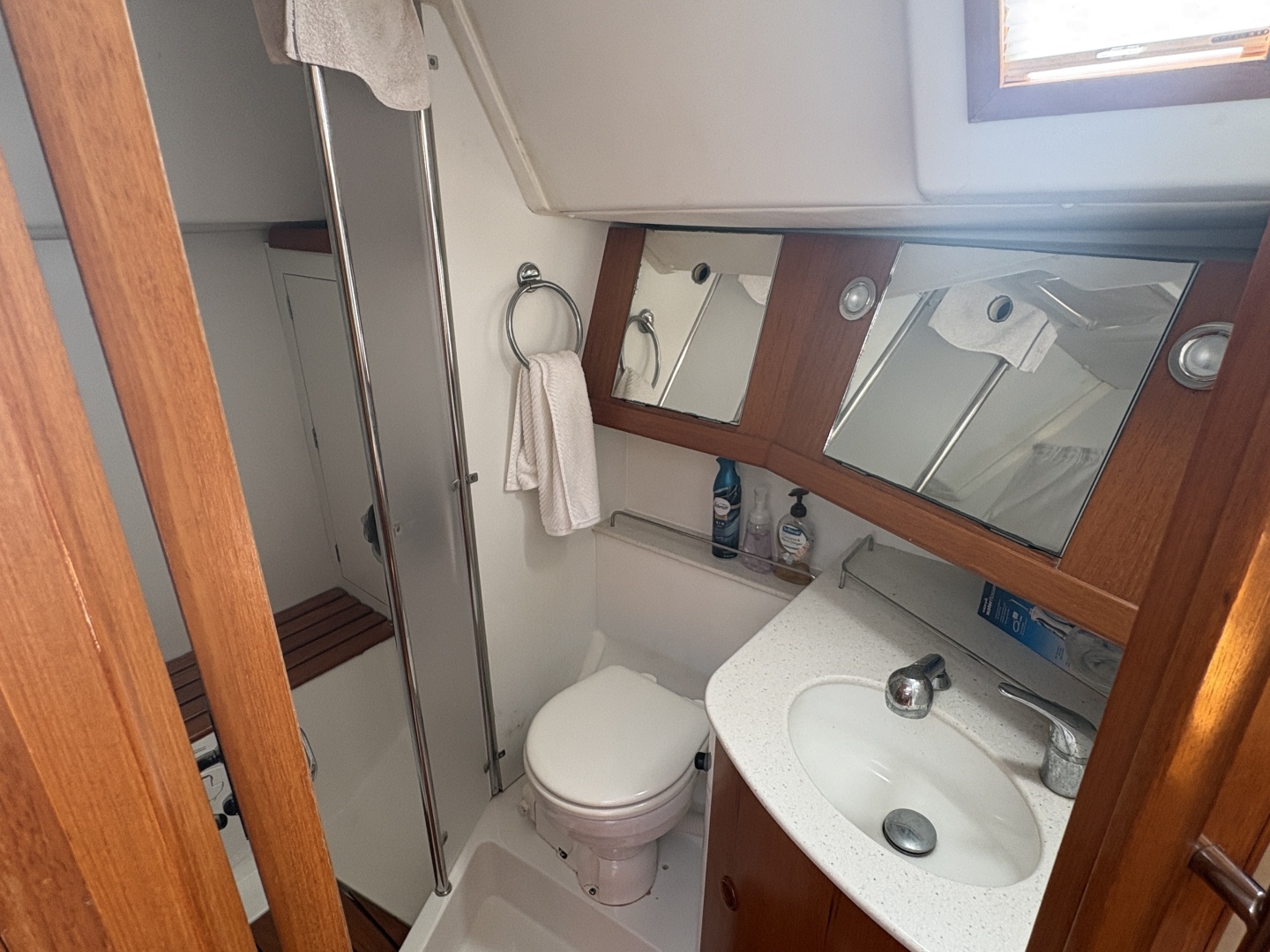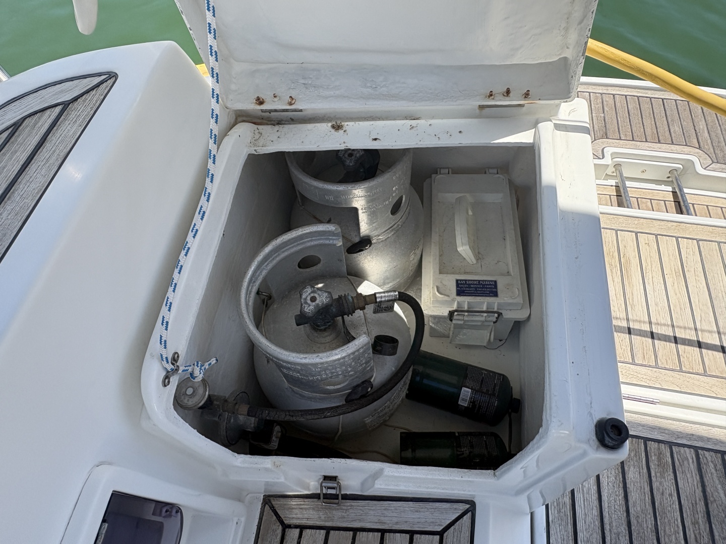 - Teak cockpit with one deep lazarette, one shallow lazarette, a propane locker, a small locker, a dedicated life raft storage area aft, and a line storage compartment near the companionway.