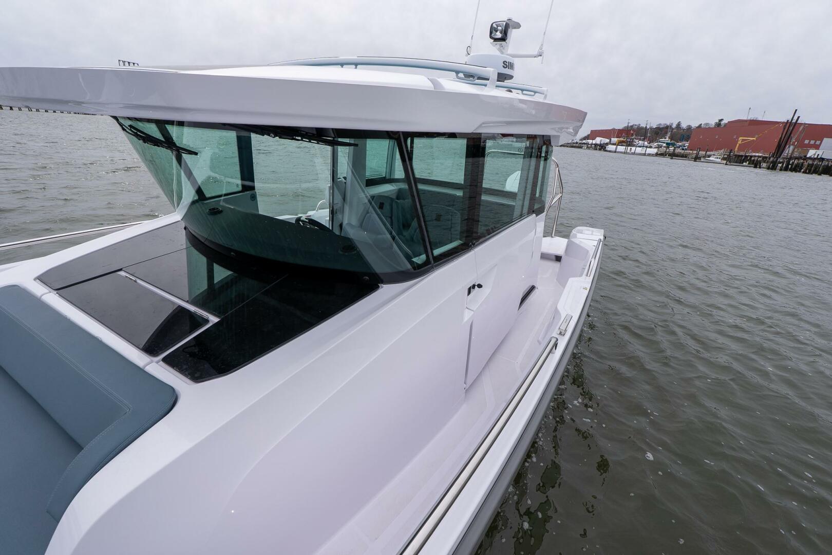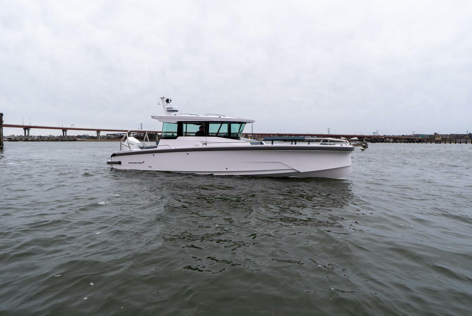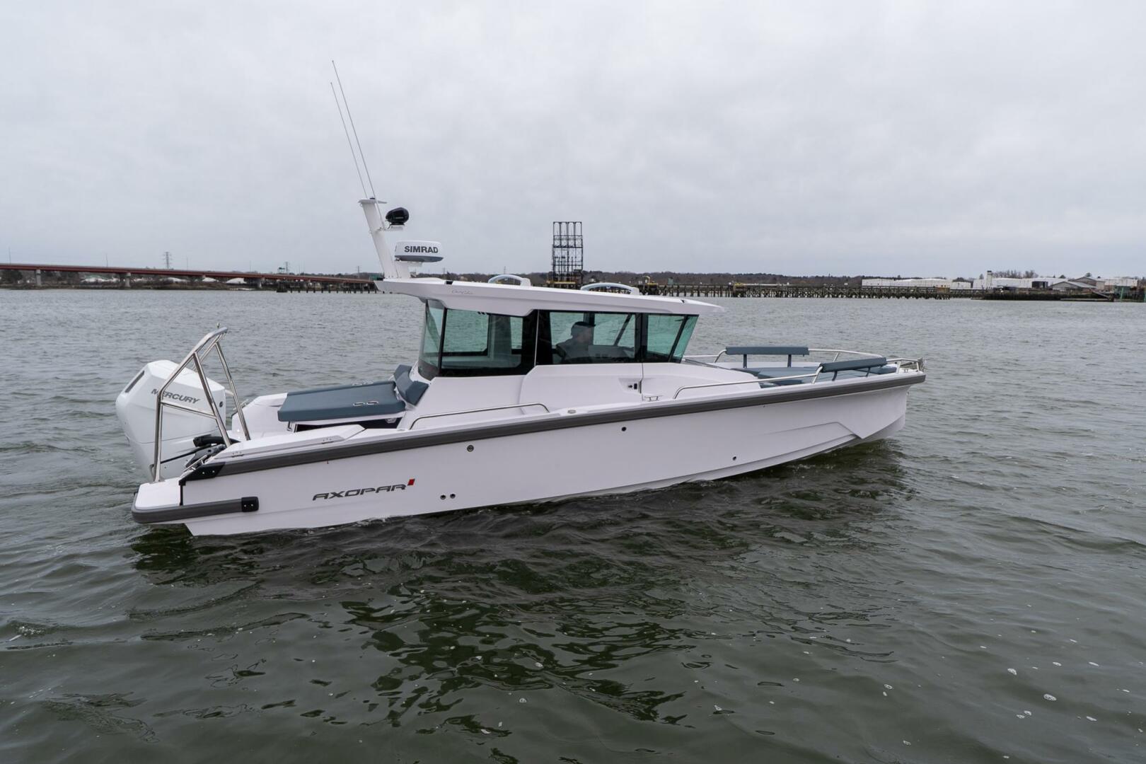 2026 Axopar 29 Cross Cabin XC available now in Maine. Powered by a Mercury Verado V10 400 hp outboard, this boat is configured with the aft cabin, multicabin upgrade, front U-sofa package, electric sliding roof, bow anchor windlass, shore power, Webasto heating, refrigerator, solar panel trickle charger, battery monitoring system, premium JL Audio, twin 12" Simrad displays, Simrad Halo 20+ radar, Simrad RS40 VHF, pilothouse table, roof racks, waterski frame, remote-controlled search light, lighting package, and grey antifouling.