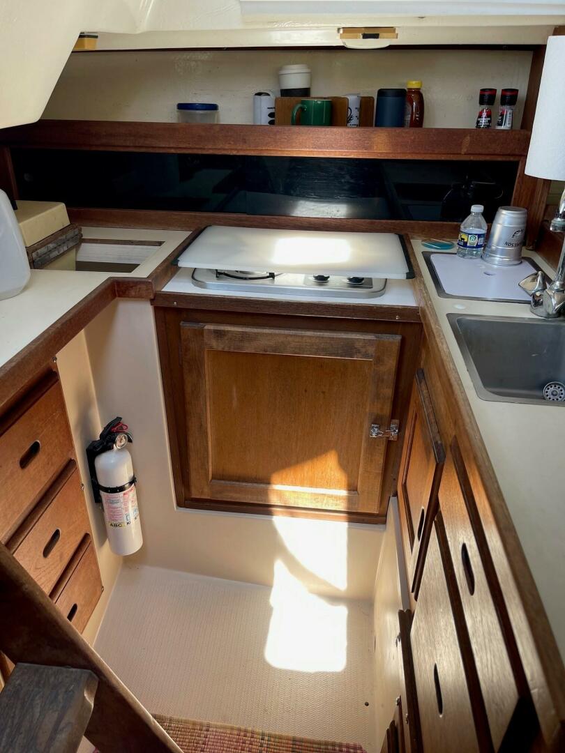 The Catalina 30 is powered by an inboard diesel engine that provides reliable and economical propulsion. She has a Universal M-25 three-cylinder diesel engine that produces 21 horsepower. The engine is located under the companionway steps and can be accessed from both sides for maintenance. The engine drives a two-blade fixed propeller through a shaft and strut system. The boat has an aluminum fuel tank that holds 18 gallons of diesel.