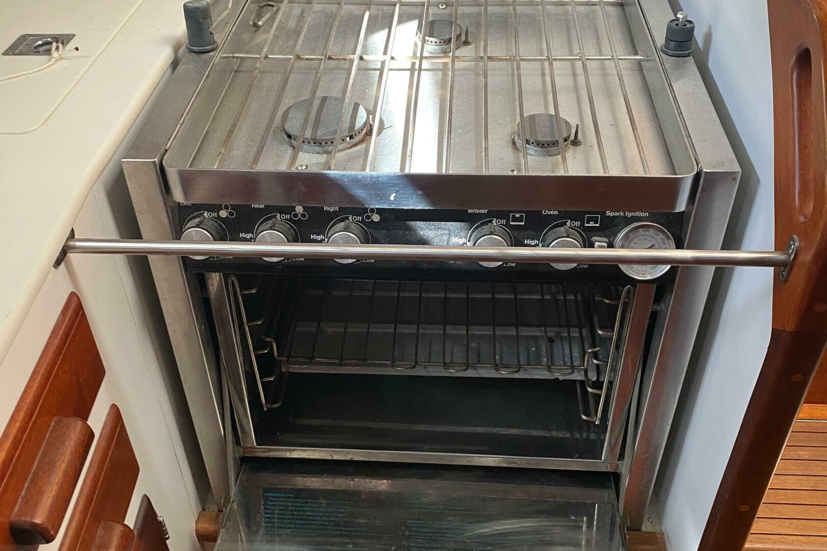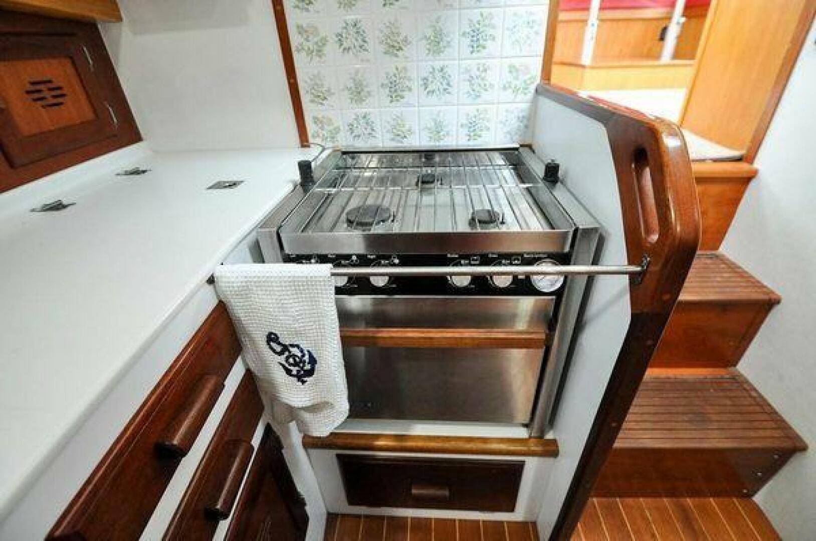 Across from the head and office cabin is a large elongated U-shaped Galley featuring expansive Corian counters with double basin stainless steel sink with superb storage in numerous lockers and drawers. Equally abundant storage for chilled food stuffs with two front loading refrigeration boxes and a top loading freezer while cooking is handled on a Force 10 3 burner CNG stove with oven while re-heats are handled in a GE Microwave.