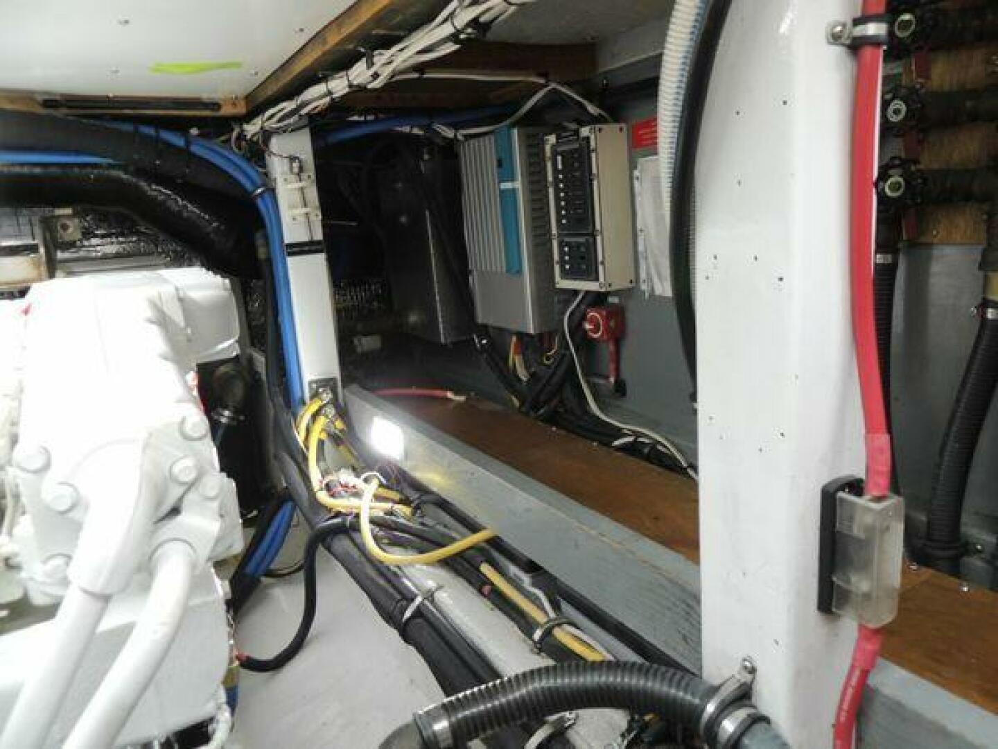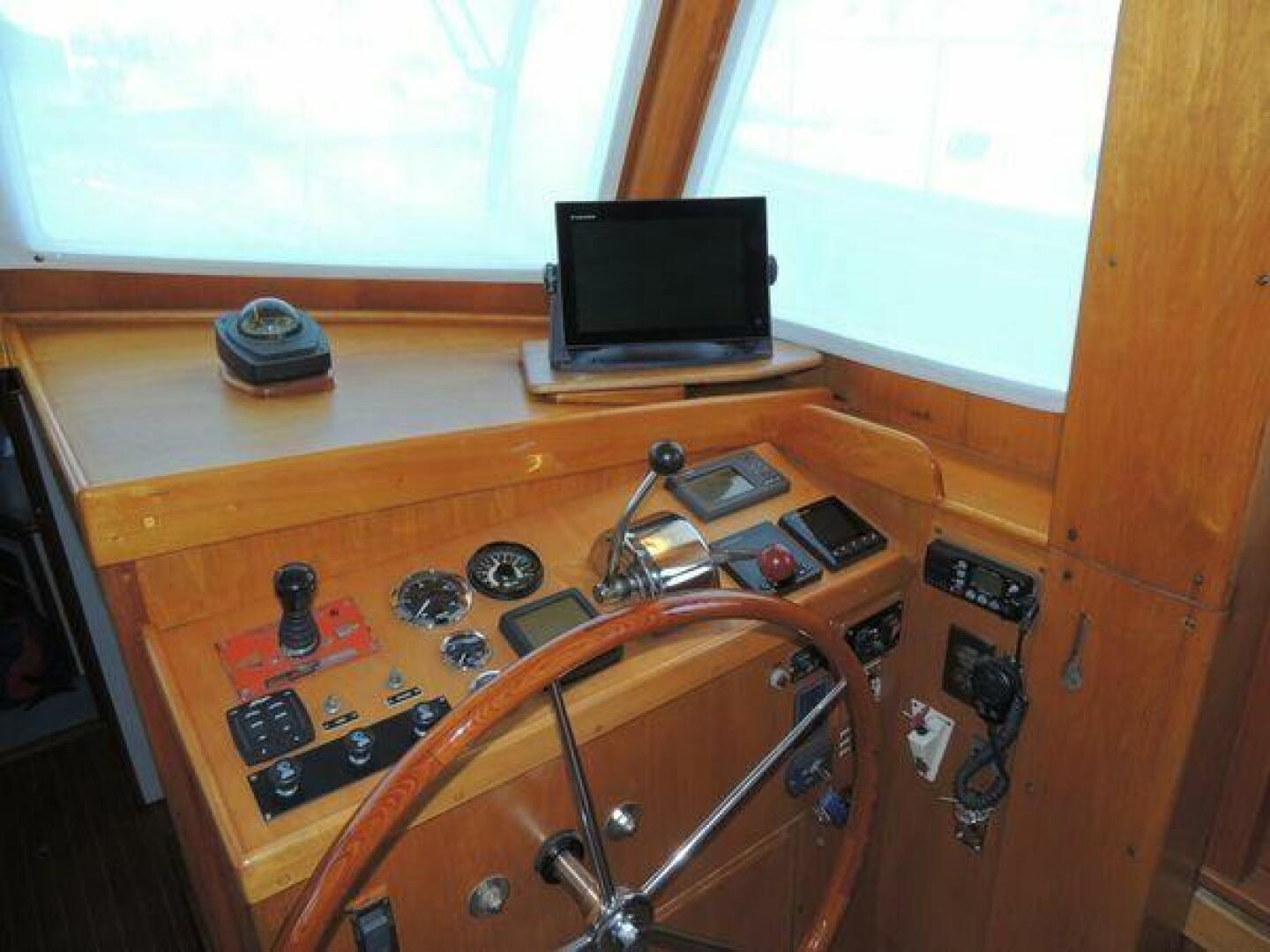 Up three steps to the wheelhouse/main salon. As you rise, the electrical panel is on the port side and you enter into a spacious saloon and wheel house that is exquisitely finished in Butternut. The lower helm station is on starboard with the large nav station across on port with loads of storage under including a chart drawer and ice maker. The custom dinette includes a drop down table in the L-shaped settee that converts to a double berth. Engine access hatches (2) allow access under the main salon. Sliding doors both port and starboard allow for easy deck access. Next aft in the main salon, on starboard, is a stairway to the boat deck with steadying sail and bridge access. To the right of the stairway is companionway access to the aft stateroom.