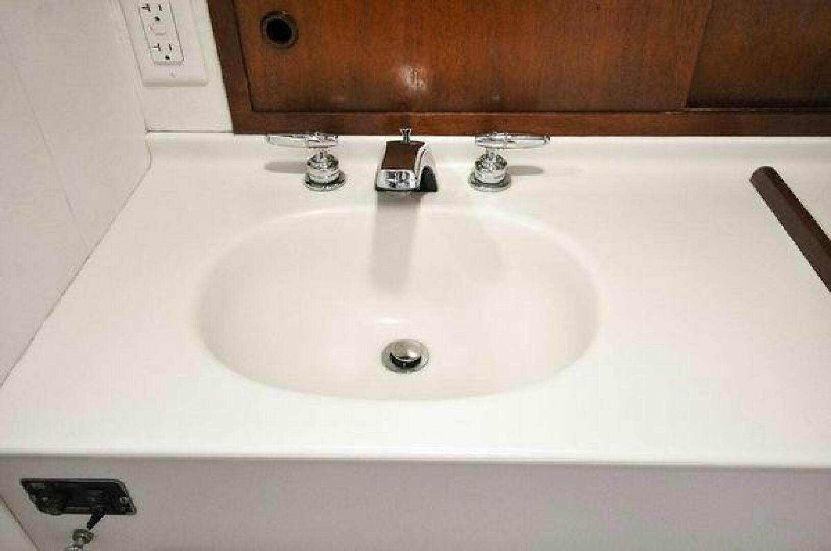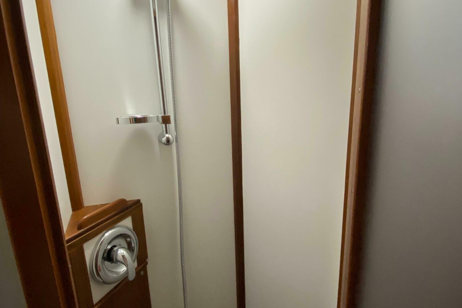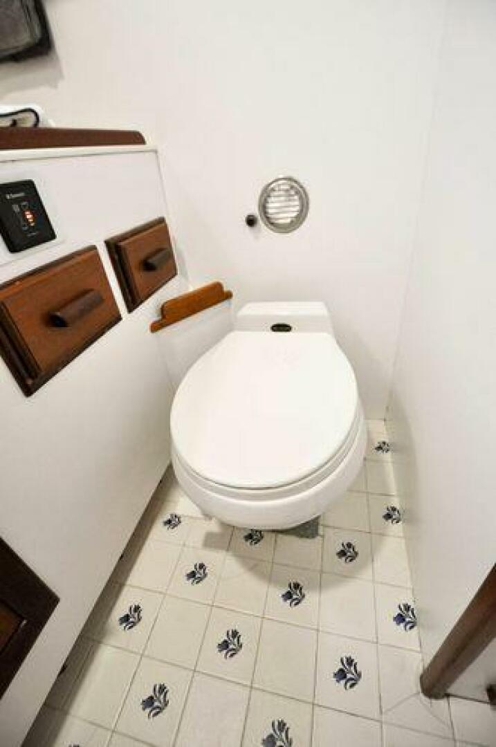 Next aft on port is an enclosed head with a Dutch tiled sole, Vacuflush head and separate shower stall. A large vanity with sink provides an abundance of storage.
