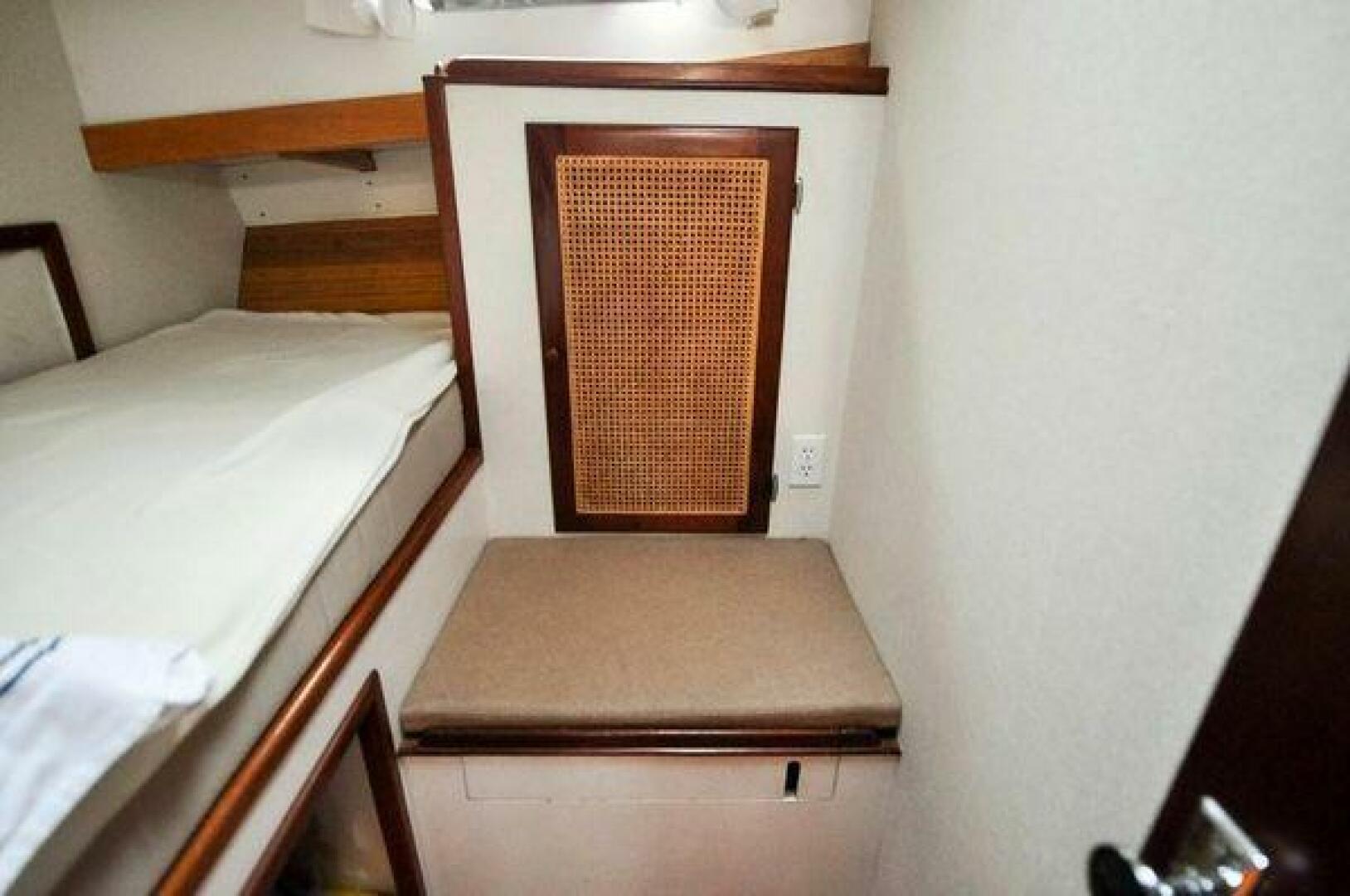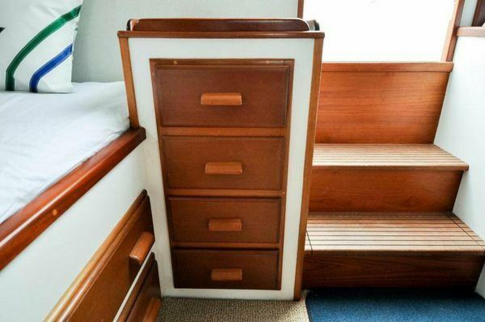 Aft to port is a unique cabin "dual purpose" can easily accommodate another single sleeping berth for children, guest or a captain, again with plenty of storage in hanging locker and other lockers. This can easily be converted to an office should one so choose. The berth is desk height top and there is a built in knee well so that one can comfortably sit there.