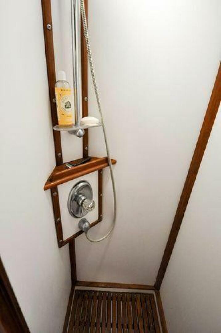 A wonderfully bright and airy interior finished "Herreshoff Style" below decks with varnished Mahogany trim on white flat panels while the Salon is finished in a warm varnished Butternut. The Salon was reworked as part of the 06/07 refit and the settee is new and helm station joiner work is new. Tons of natural light and ventilation with ten opening ports, three large hatches and several large wheelhouse windows, many of them sliders with screens as well as the aft companionway and P&S side doors. Generous artificial light with reading lamps at all settees and berths and numerous dome style lamps and decor lamps. When the weather is too warm, her air conditioning units keep the interior at a comfortable temperature.