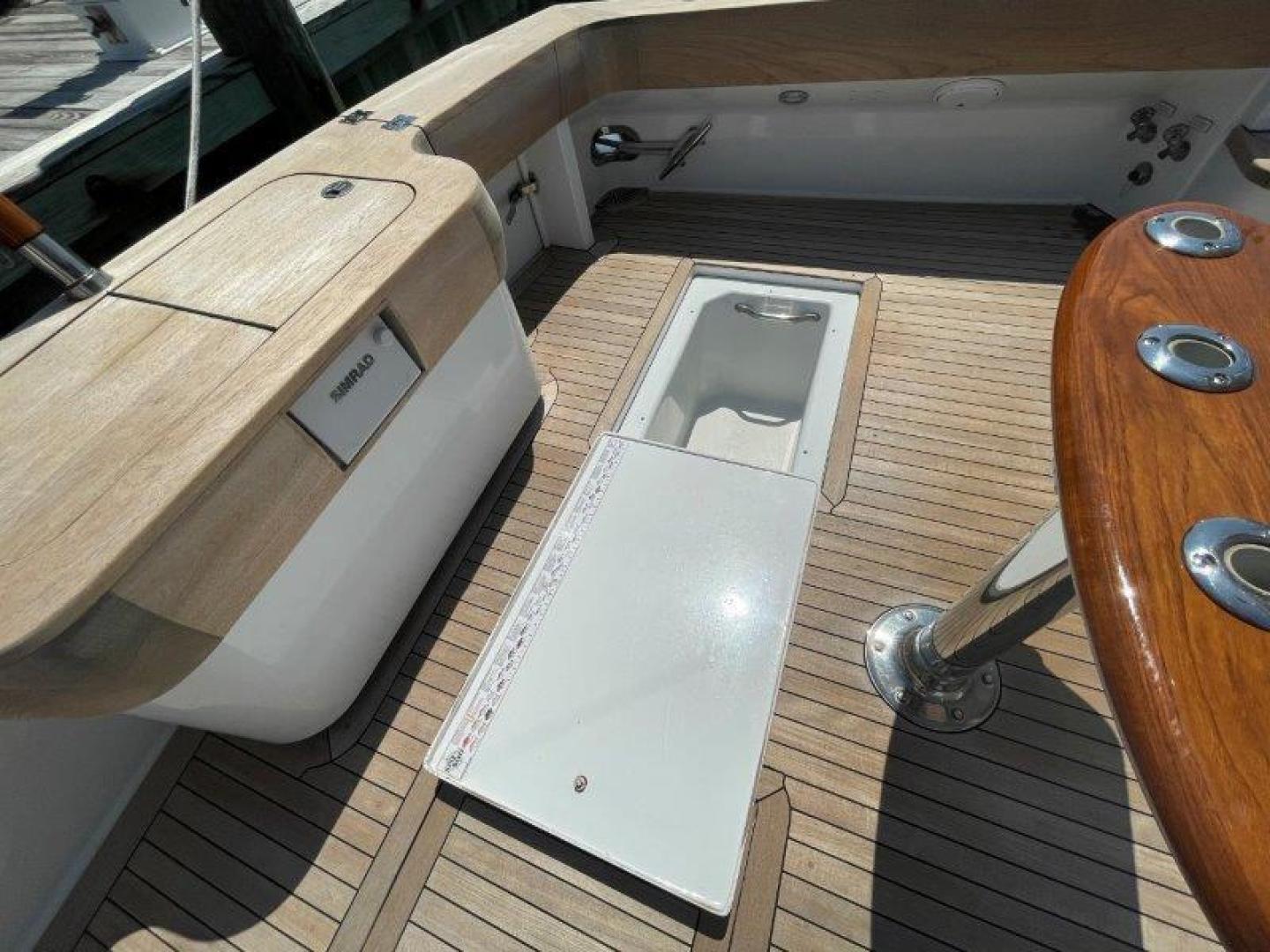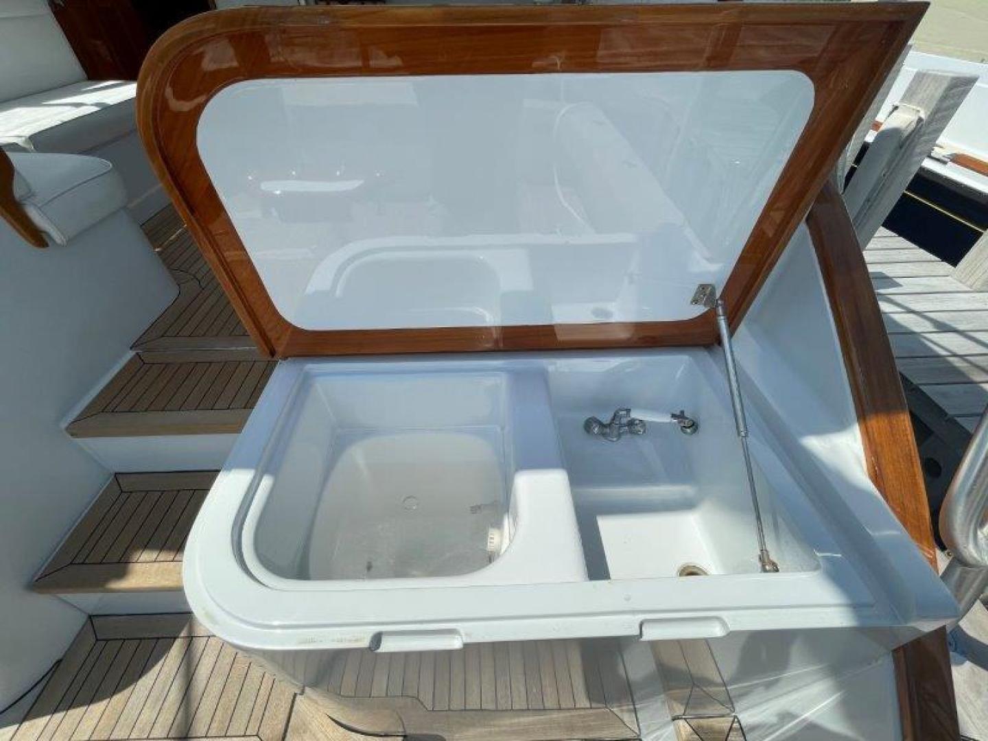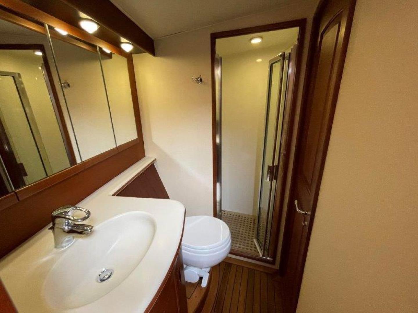 underneath the double berth. Head with shower. The fully equipped galley has a sink with pressure water