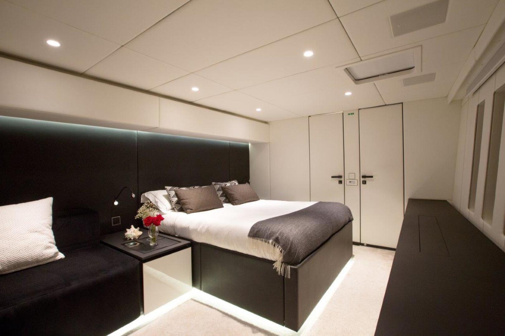 / 3600 ft2 of living space offering an unmatched level of comfort. The yacht provides impressive accommodations for 8 guests in 4 stylish en suite staterooms designed in modern and low maintenance yet sophisticated combination of black and white lacquered wall finishes with all LED lighting and stainless steel accents. Crew accommodations are aft in 2 double cabins plus one overflow crew area in the bow area on Starboard. All accommodations are on the lower deck level and have climate controls and natural ventilation as well as large fixed portlights in the topsides allowing natural light in and visibility out to the ocean views.