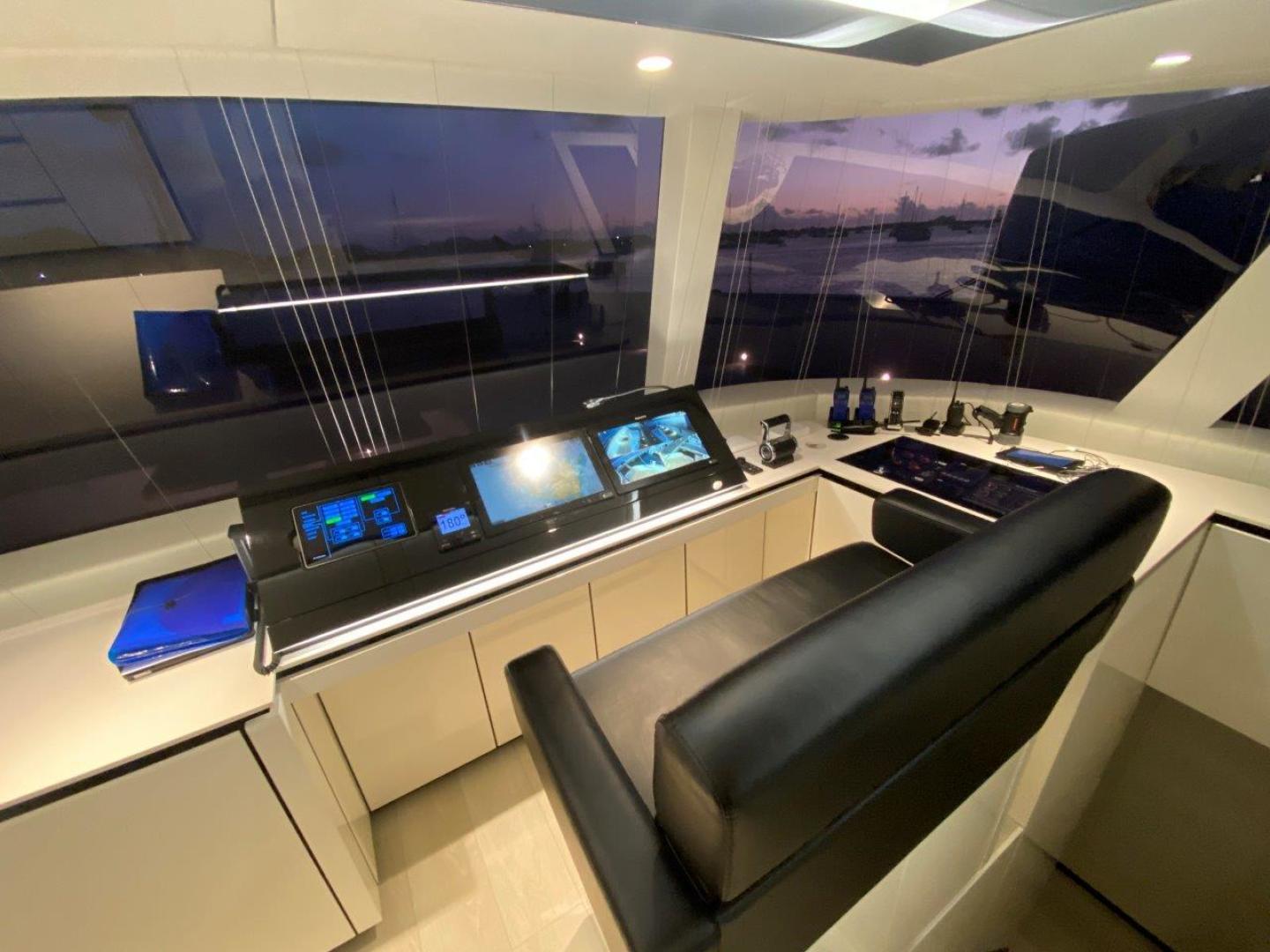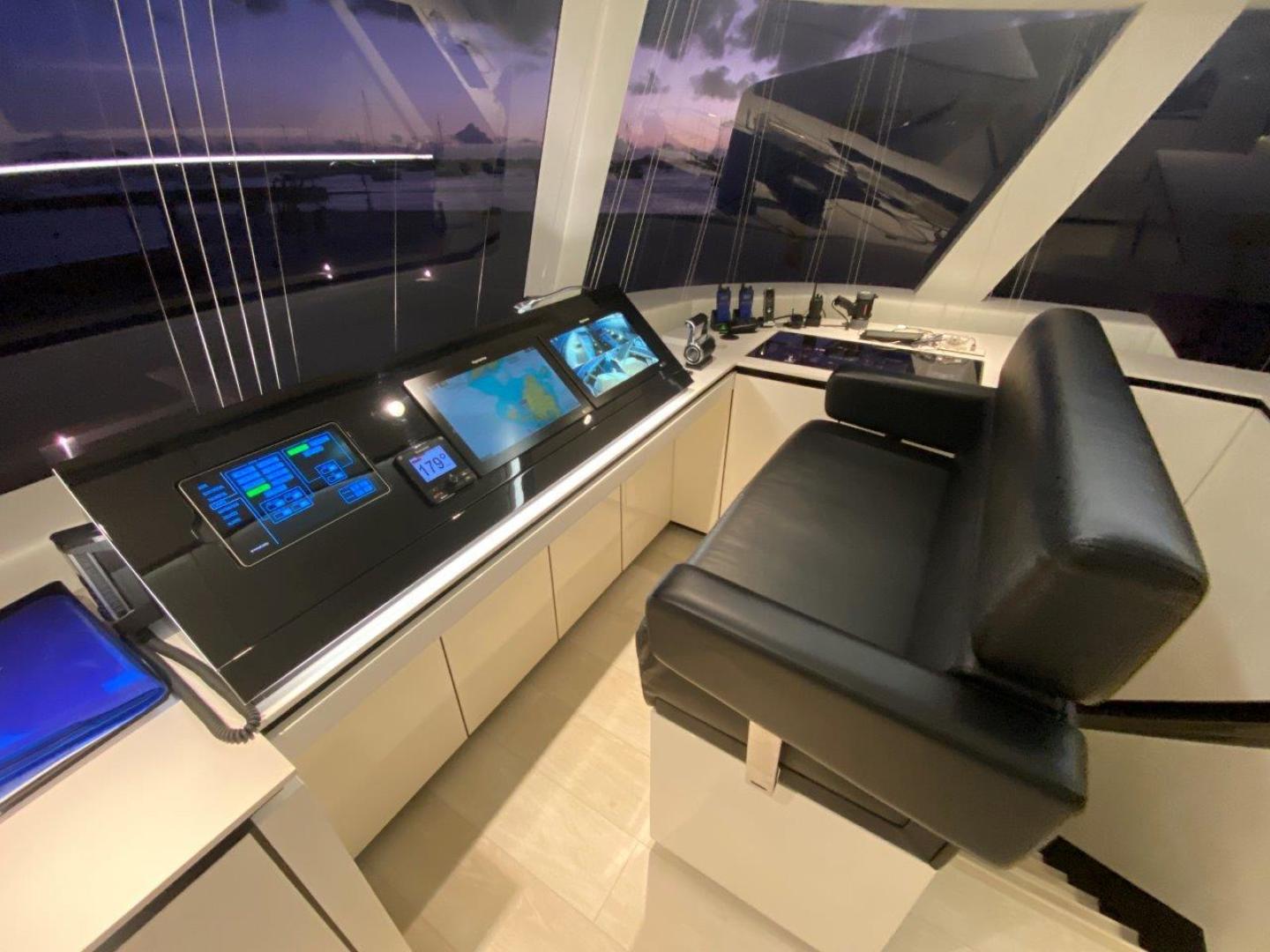 The spacious flybridge is accessed via stairs up on port side with a large settee for alfresco dining, lounging in the sun or relaxing in the shade. The flybridge is enormous and equipped with movable furniture, a Jacuzzi, fully equipped wet bar, a barbecue and large sunpads. A robust hard top partially covers the flybridge with Eisen glass curtains to enclose this area in inclement weather. Solar panels are mounted on the hard top. A full ship’s control station is located on the starboard side forward.