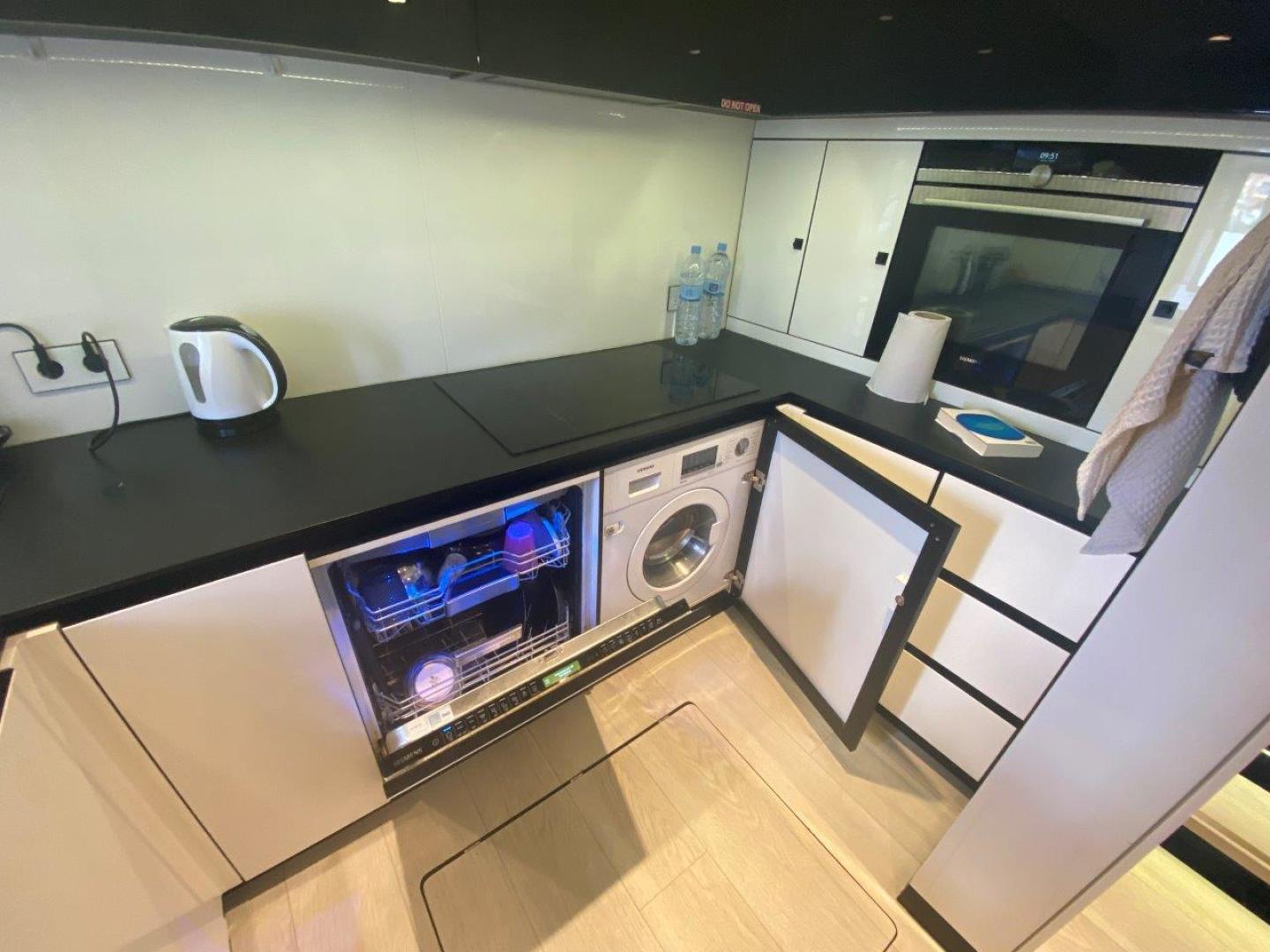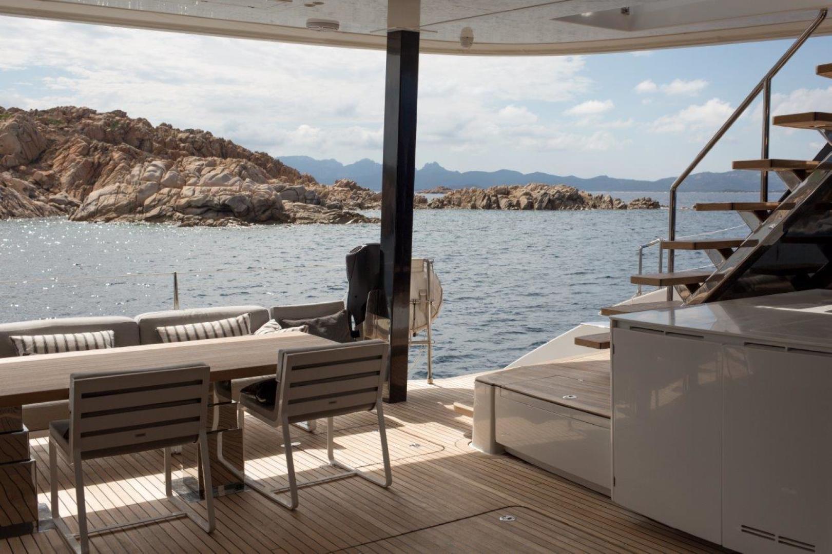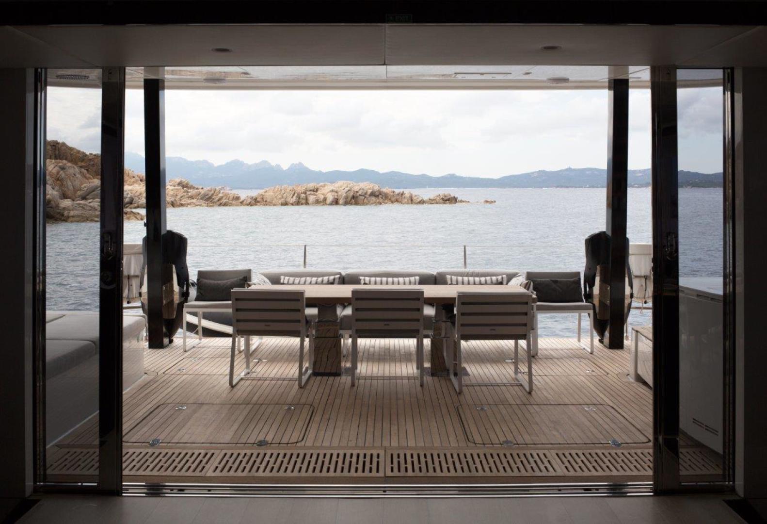 The main deck is on one level from the aft cockpit through to the large saloon / dining area and forward to the foredeck through the push button opening watertight door. The entire main deck is enormous with no steps or thresholds to navigate. The saloon offers an astonishing panoramic view with seated lounging area on starboard and an imposing dining area with a table for 10 guests and a comfortable sofa to port. The hydraulic tender platform aft expands the main deck space when the tender is deployed creating a private beach for the guests to enjoy. The large aft deck dining table and settee lowers to a sunbed and there are lounging beds on either side of the aft deck. Crew service is via the galley located to port on the lower deck aft for easy guest servicing.