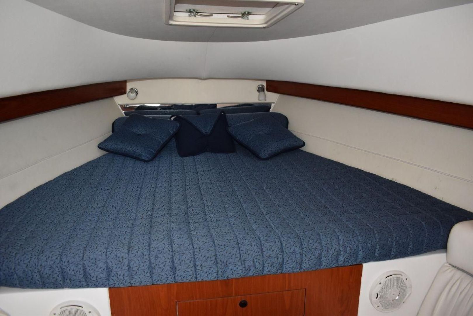 This one owner boat offers the features of a performance Center Console, off shore fishing boat, and a cruiser with space for two for longer trip. Like all Donzi boats, the 38 ZSF rides on a high-performance stepped Hull known for its superior rough-water handling characteristics. While she's certainly capable of serious fishing activities, the Cockpit of the ZSF offers good fishing access with two fish boxes and a cleaning station, and a 65 gallon live well. If the sun becomes too much you have a large top to get under. A nice mid ship seating area, which is protected from sun and rain. If needed, you can go below to an air-conditioned cabin, powered with the Westerbeke low hour generator. Later if you want there is a full galley with an electric cook top, refrigeration with Ice maker, and microwave to prepare the days catch. For overnight trips, the V-berth and a large Head with sink and shower. Between the opposite seating below, is a removable table for evening meals. The walkways of the 38 ZSF are wide enough for easy bow access, with good grab areas to stabilize yourself in rougher weather. The visibility from the raised Helm position is excellent, giving you sight to all corners of the boat