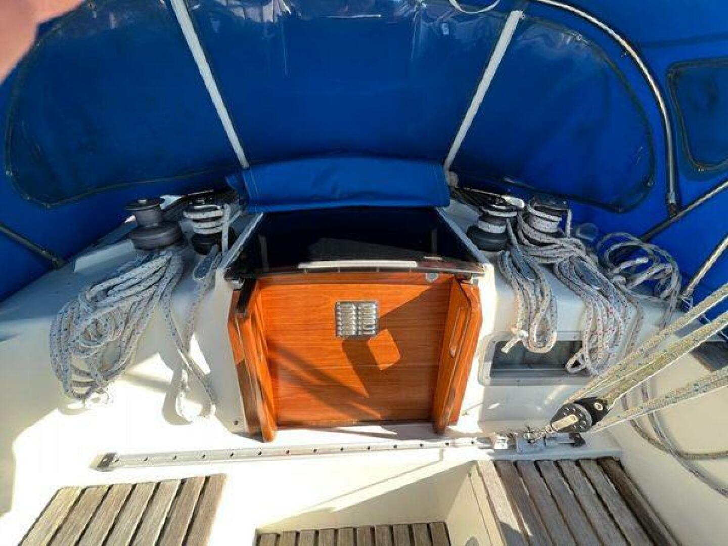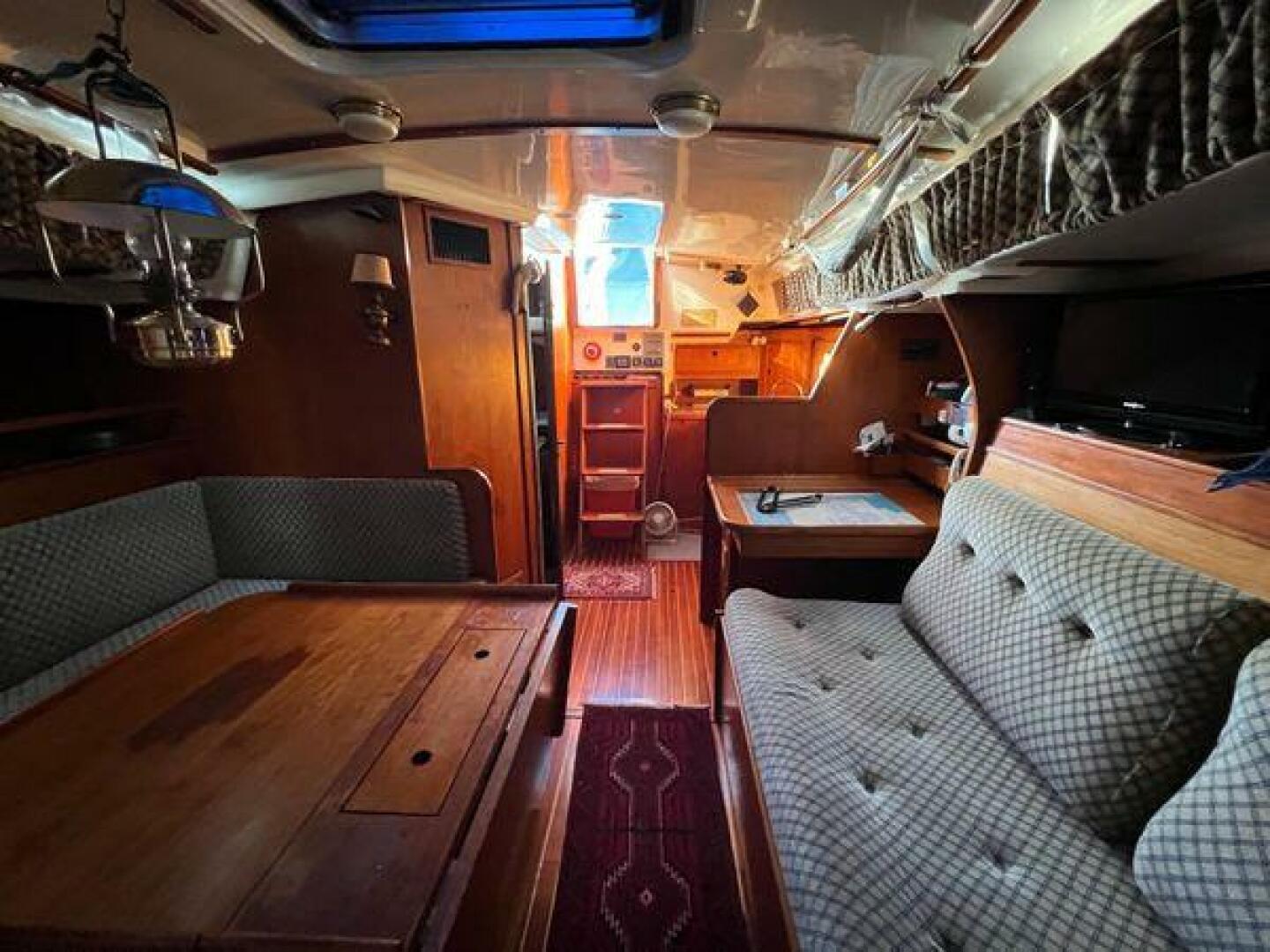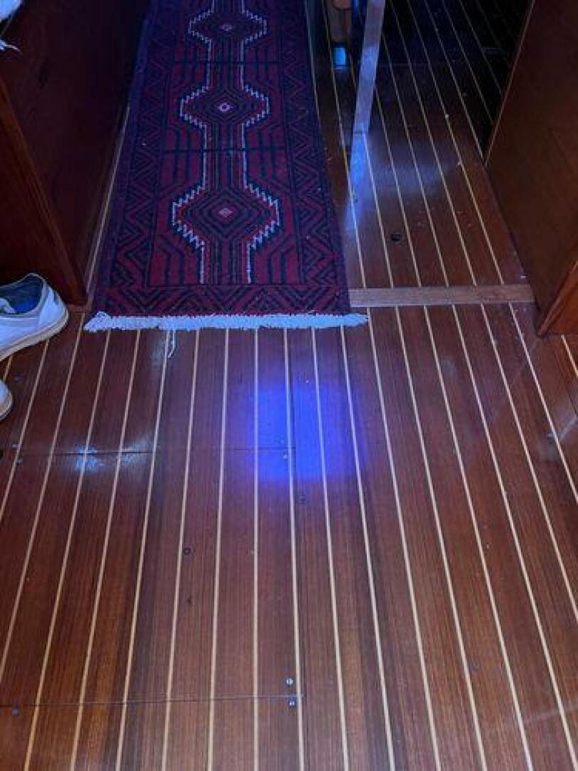 All the teak joinery, cabinets, teak and holly sole as well as her upholstered seating are in great condition and add to her warmth below. Matching curtains are black out curtains for privacy. Engine access is via the companionway steps.