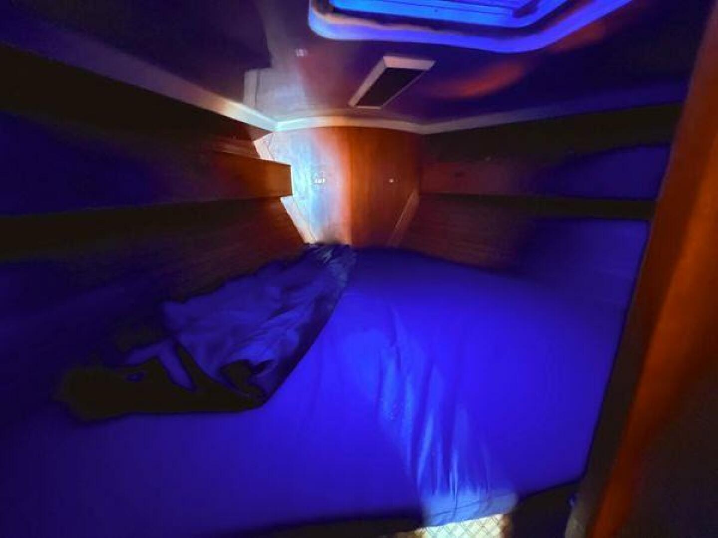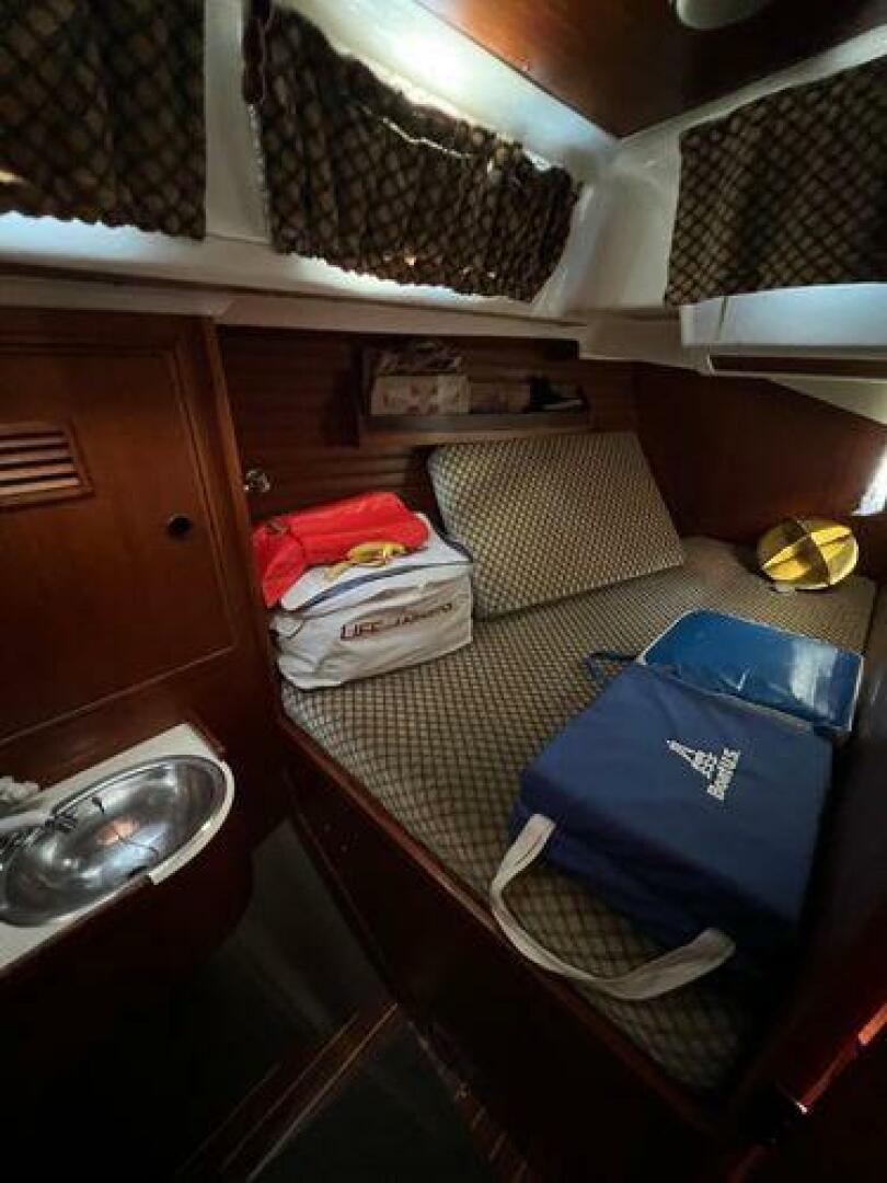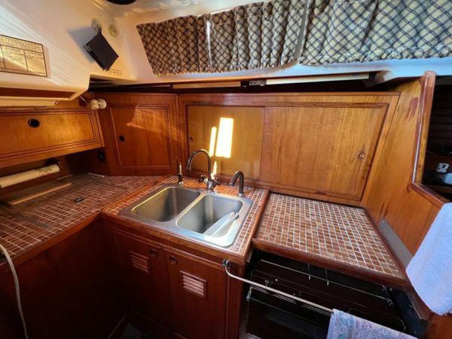 All the way aft and to port of the companionway is a large L-shaped galley with an Italian tile counter. To starboard of the companionway is the aft stateroom with a double quarter berth, stainless steel round sink, plenty of cabinets and lockers as well as multiple ports for additional light.