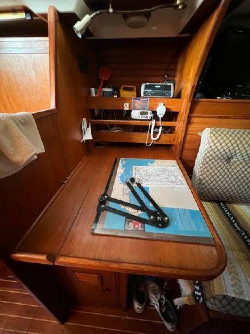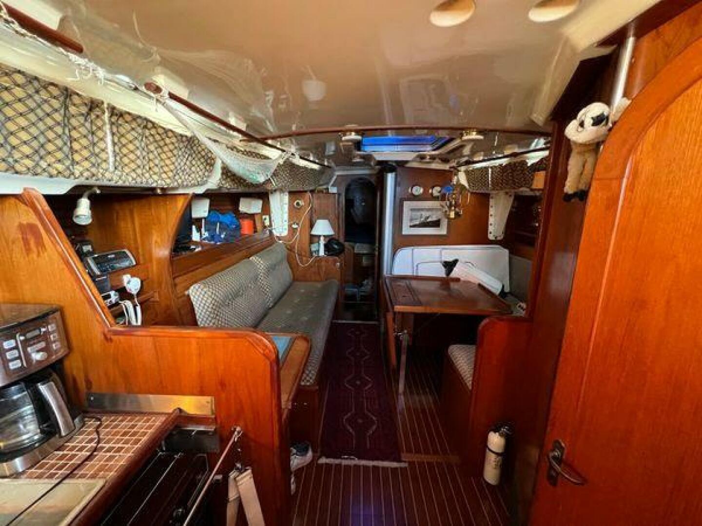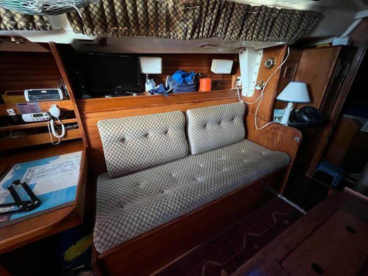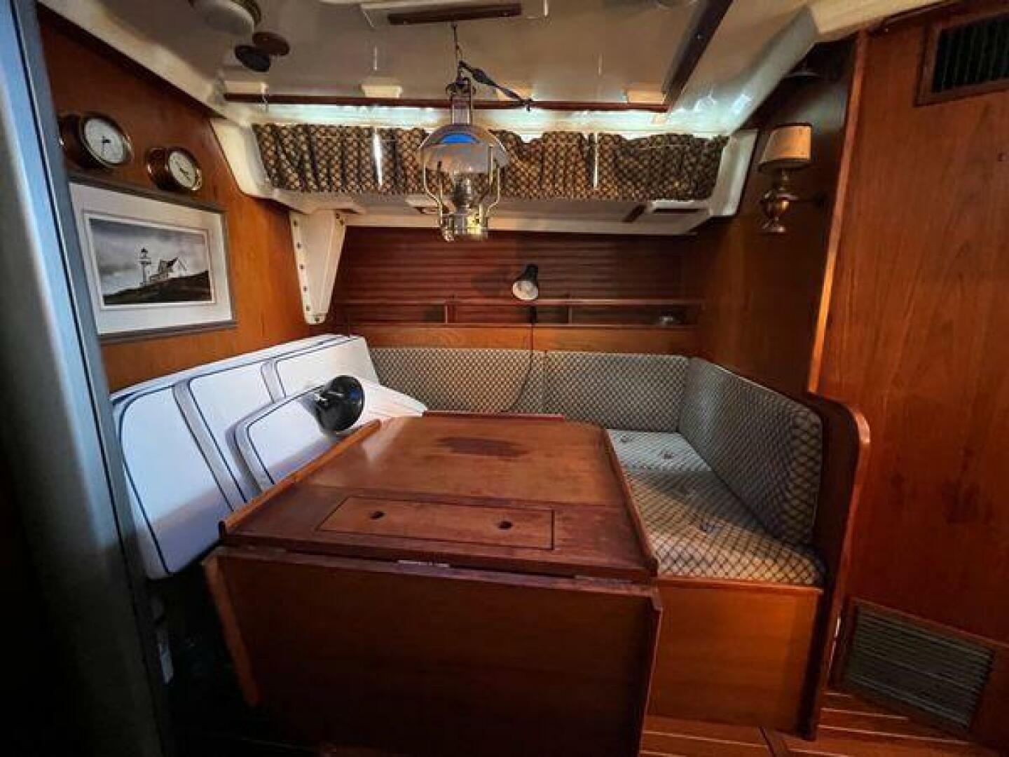 Heading aft there is a second head access for day use. She has an attractive salon with a U-shaped dinette to starboard with shelving outboard. Opposite to port is a settee also with shelving outboard and an aft facing navigation station. There is a fixed centerline table with large drop leaves allowing for dining from both sides of the vessel. The dinette can convert to a double berth when needed.. Teak ceiling strips line the hull sides and beautiful teak and holly sole add to her warmth below.
