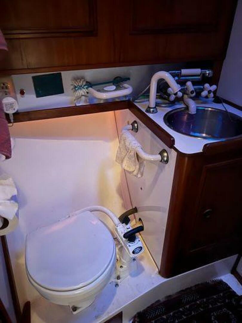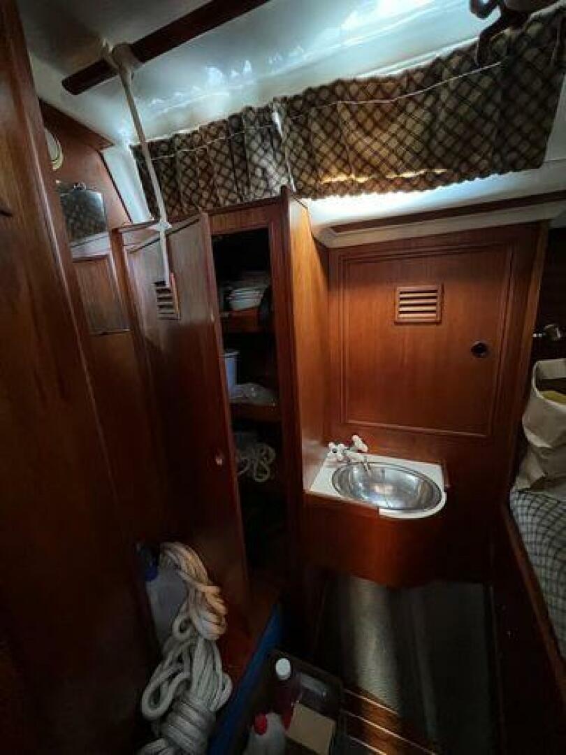This is a lovely Bluewater cruiser that will enable you to cruise in comfort. Two private staterooms, a large convertible dinette and port side settee can sleep up to 7 people. Starting forward is the first stateroom with large double V-berth, shelves outboard, hatch above, lockers to port and private head access to starboard. The stateroom is surrounded in lovely teak for a warm and inviting space.