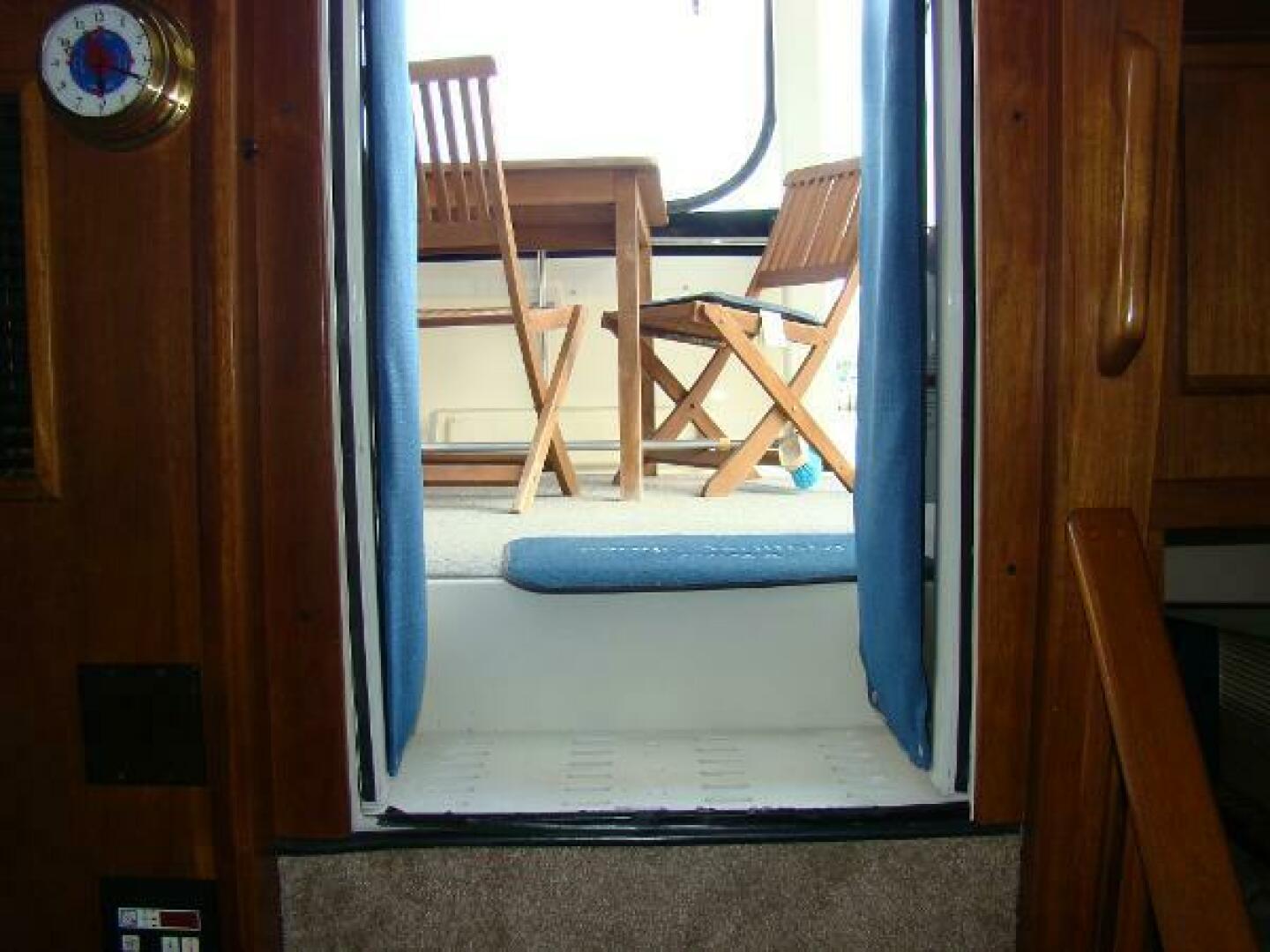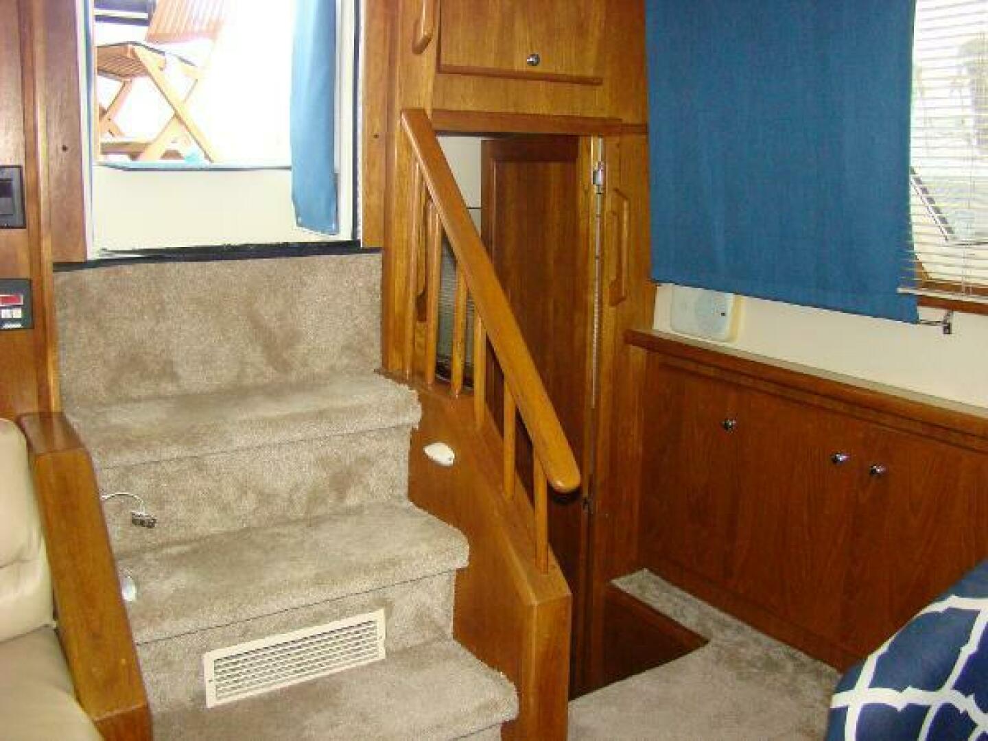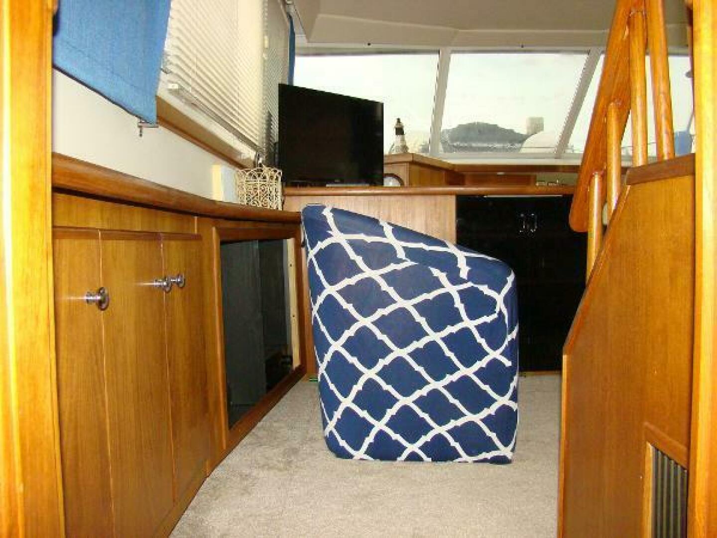 The Carver 430 Cockpit Motor Yacht is known for its ease of boarding and moving around the boat. With a swim platform leading through an opening transom into a spacious cockpit, it is easy to enter the aft cabin through a sliding door. There is also a gentle ladder up to the sundeck. The light and airy sundeck gives you access to the entrance to the main salon, forward to the front deck or up a few steps to the flybridge.