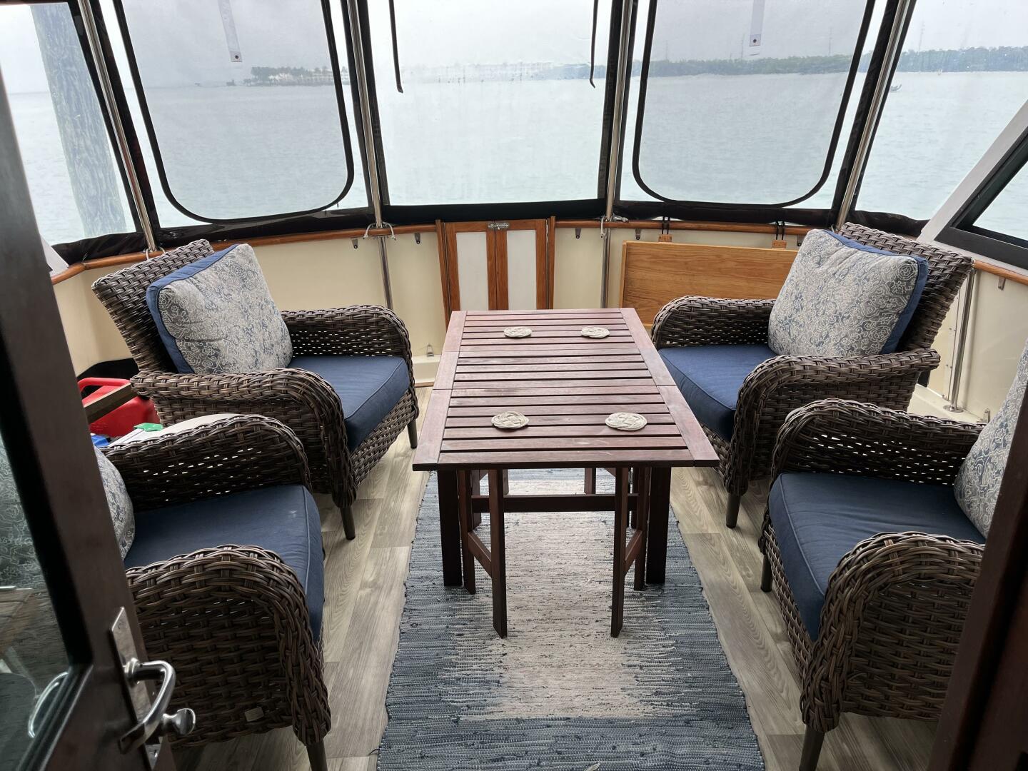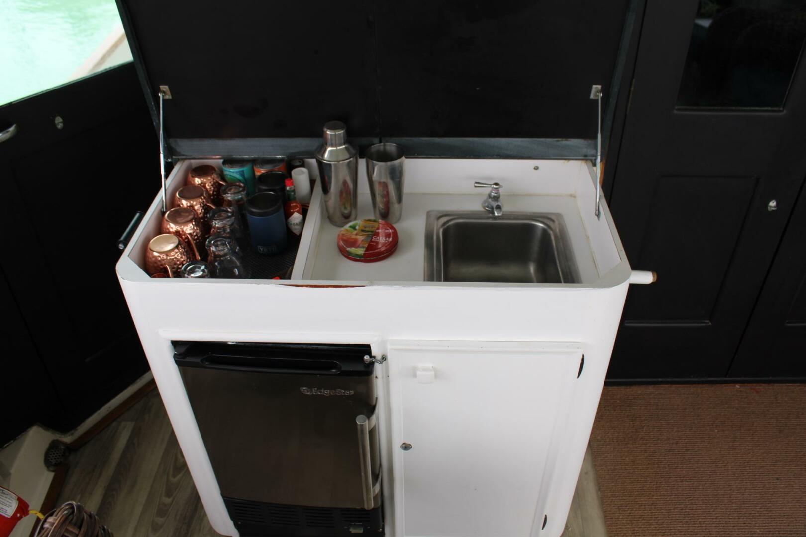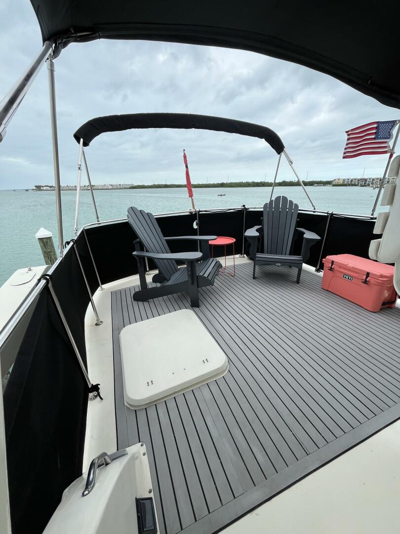 The large aft deck is the perfect location for enjoying sunset cocktails with family and friends. It has a full plexiglass enclosure with four U-shaped screens for fresh air, or roll-up the back panels and enjoy your backyard paradise! Alternatively, there is full 16k btu a/c independent unit for those hot summer days. There is a wet bar with a liquor cabinet below, along with an EdgeStar ice maker and a can crusher. The aft deck has four outdoor “comfy” wicker style chairs, two small round foldable tables in between, and a foldable dining table for those days with guests and of course music from the two speakers to complete a perfect day on the water. Access the swim platform through the half double doors that open up to a custom-made stainless-steel spiral staircase that leads you to the custom 4’ swim platform for added safety and comfort for those who love to anchor out or have pets that need to dinghy to shore. Heading up to the flybridge there is an additional storage cabinet that is located on the stbd side, beneath the ladder.