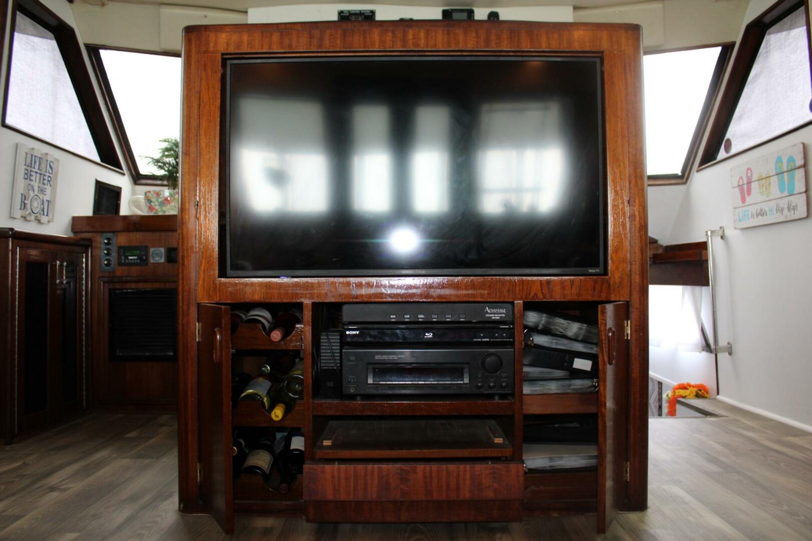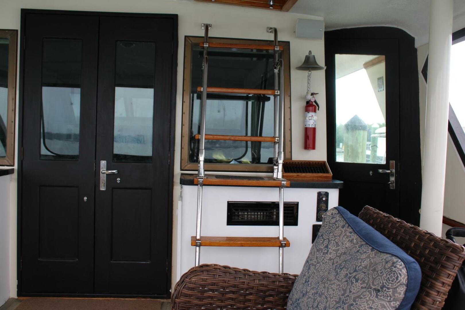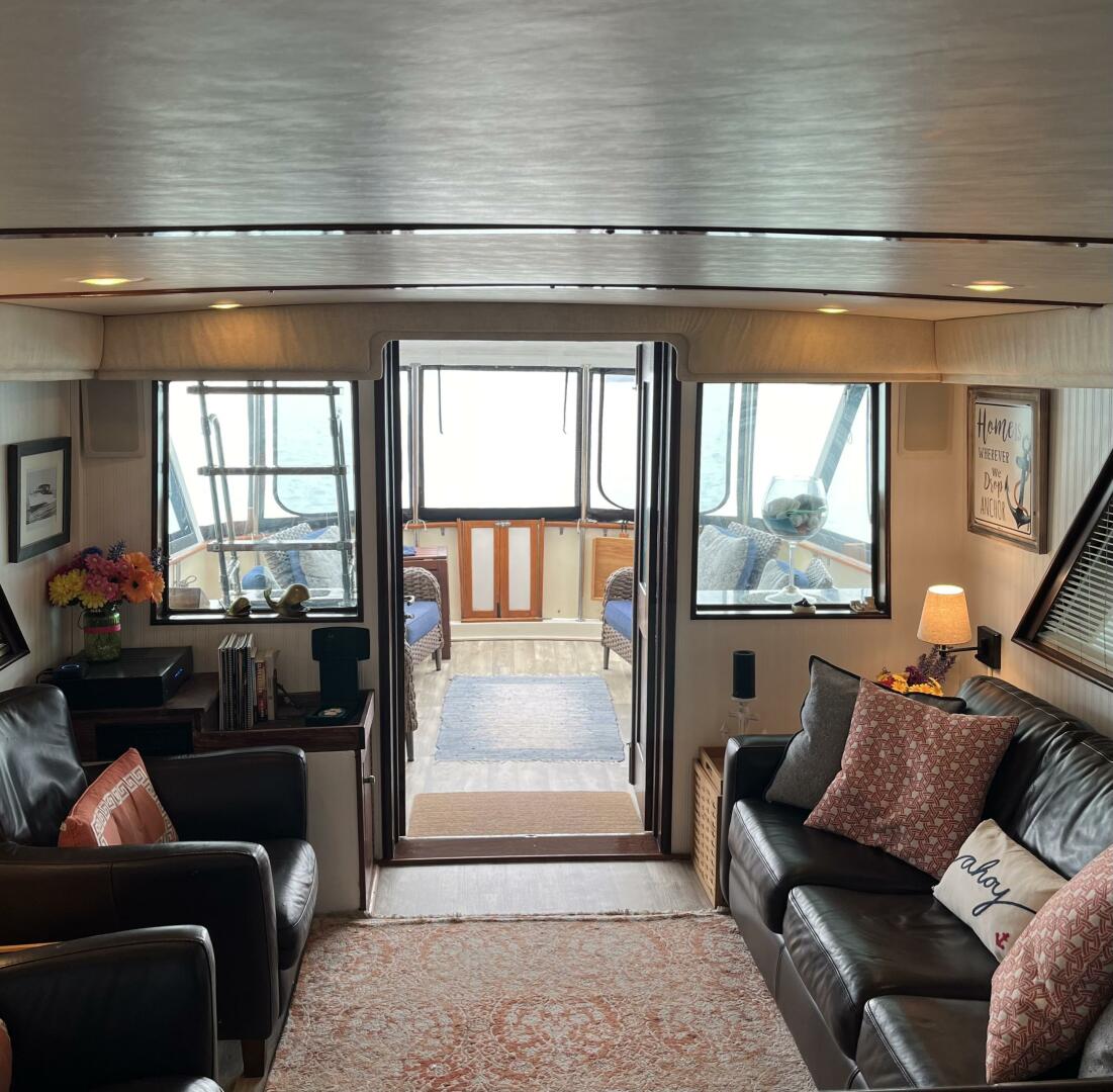 The large aft deck is the perfect location for enjoying sunset cocktails with family and friends. It has a full plexiglass enclosure with four U-shaped screens for fresh air, or roll-up the back panels and enjoy your backyard paradise! Alternatively, there is full 16k btu a/c independent unit for those hot summer days. There is a wet bar with a liquor cabinet below, along with an EdgeStar ice maker and a can crusher. The aft deck has four outdoor “comfy” wicker style chairs, two small round foldable tables in between, and a foldable dining table for those days with guests and of course music from the two speakers to complete a perfect day on the water. Access the swim platform through the half double doors that open up to a custom-made stainless-steel spiral staircase that leads you to the custom 4’ swim platform for added safety and comfort for those who love to anchor out or have pets that need to dinghy to shore. Heading up to the flybridge there is an additional storage cabinet that is located on the stbd side, beneath the ladder.