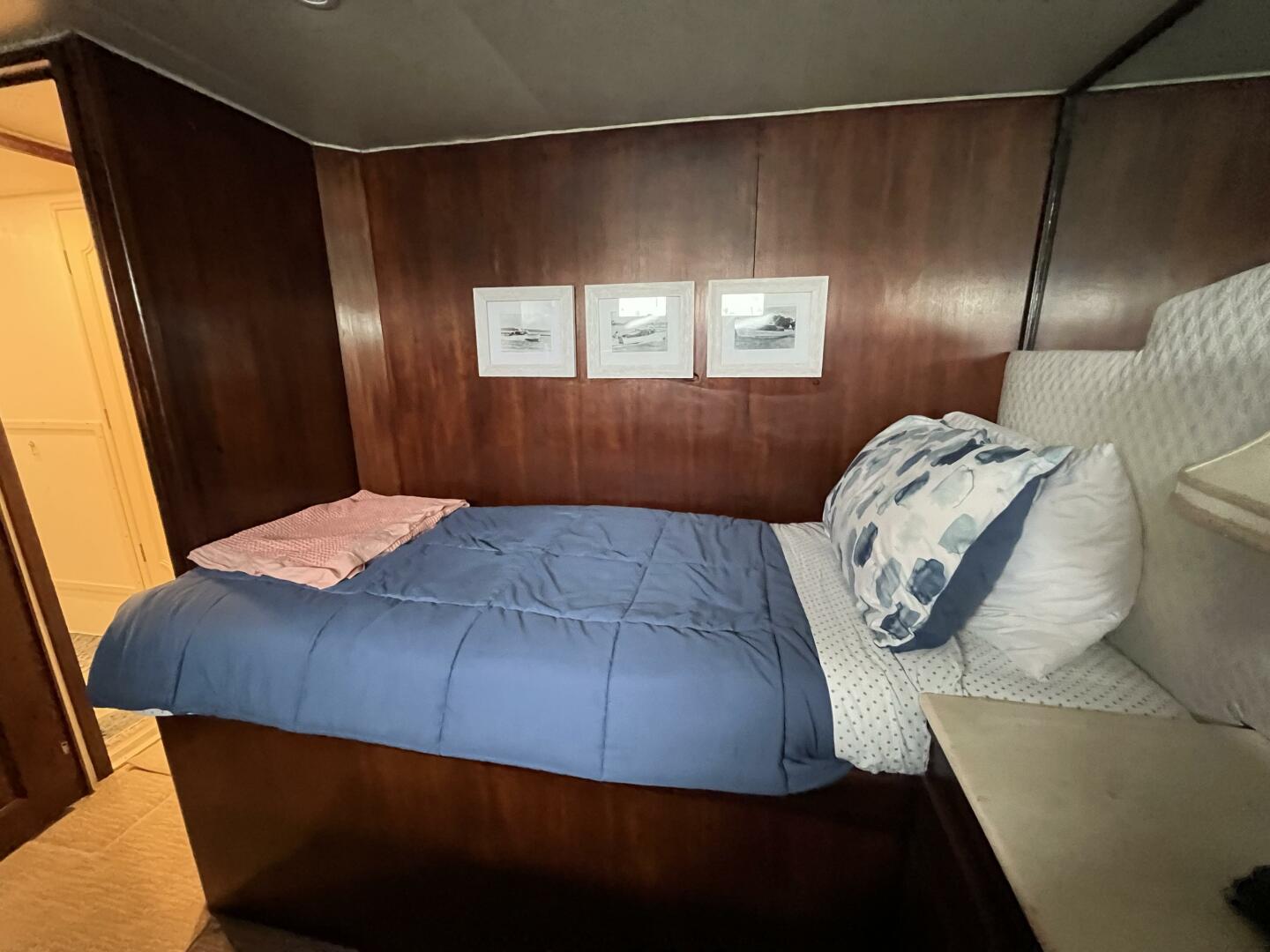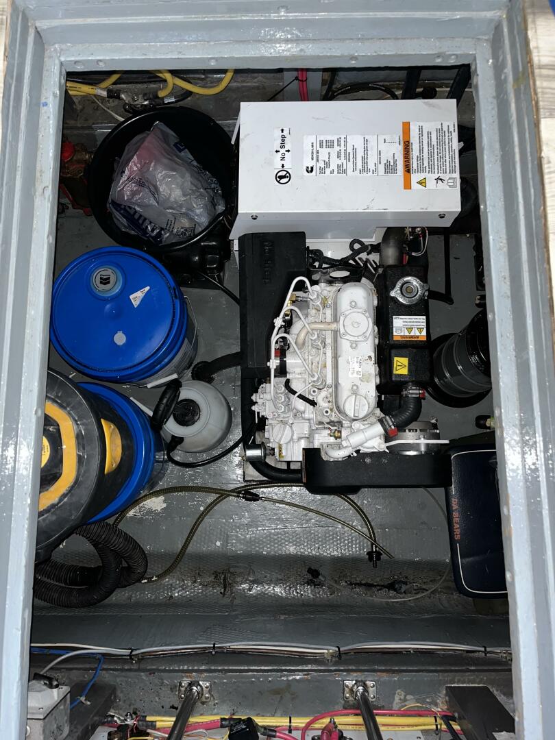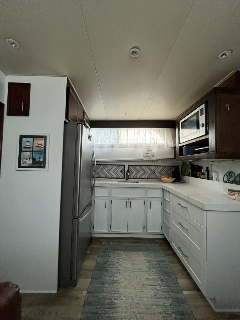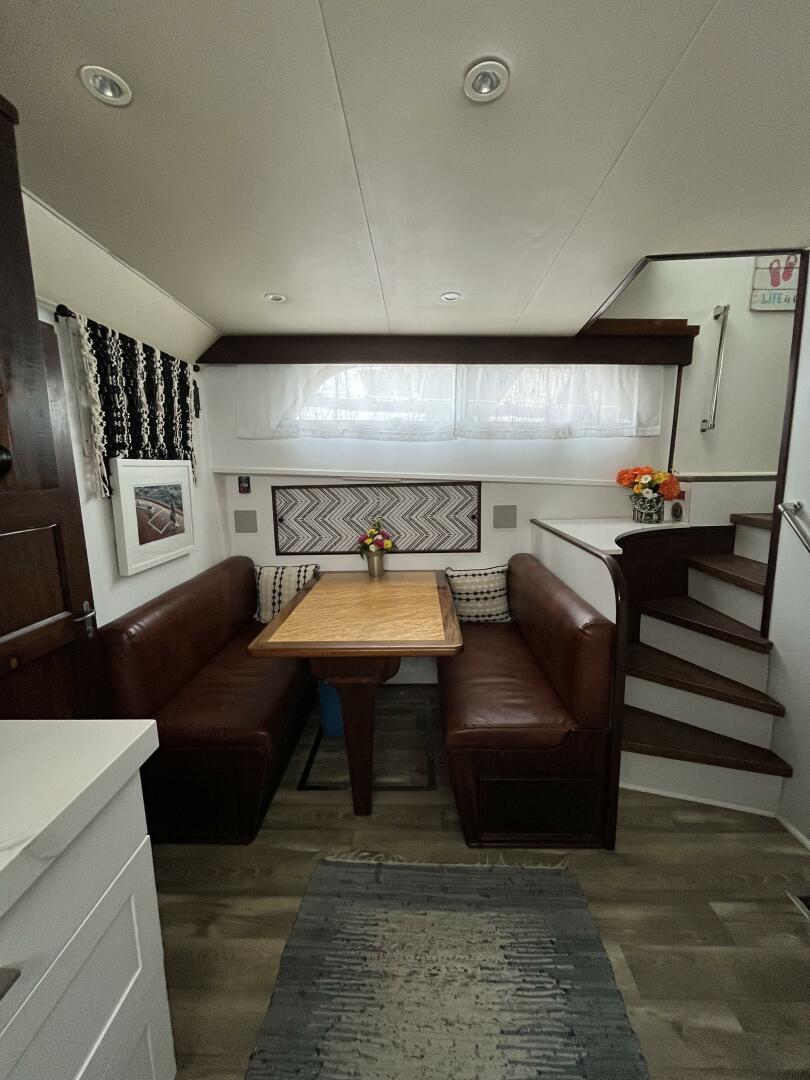 Down several steps on the stbd side and you will enter the galley and dinette area with slider cabinet space and drawers below the seating. Port side has the updated galley with the new L-shaped Corian countertop with a s/s sink and faucet. The overhead cabinet houses the Panasonic convection/ microwave/ air fryer, and Cuisinart two burner 110v countertop cooktop. Below are three large storage drawers for pots/pans and additional drawers and cabinet space for all your cooking essentials. Aft facing is the full-size Whirlpool refrigerator with bottom freezer drawer. The galley flooring has been updated with faux vinyl flooring. There is another independent a/c unit in the galley. The generator room is located under the galley floor which comprises a new Cummins Onan 10kW with approximately 130 hrs, 2x 32v engine battery banks, 24v windlass and bow thruster battery system, 24v AGM (Rolls Surette) house batteries, 3500W Magnum Inverter/ Charger and the Victron SmartSolar charge controller (MPPT 100/50).