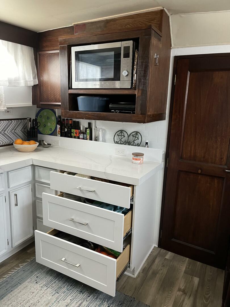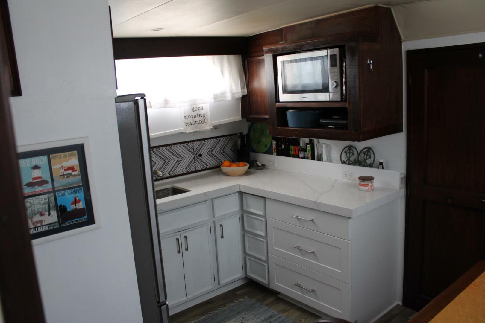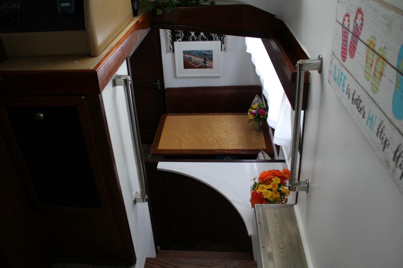 Down several steps on the stbd side and you will enter the galley and dinette area with slider cabinet space and drawers below the seating. Port side has the updated galley with the new L-shaped Corian countertop with a s/s sink and faucet. The overhead cabinet houses the Panasonic convection/ microwave/ air fryer, and Cuisinart two burner 110v countertop cooktop. Below are three large storage drawers for pots/pans and additional drawers and cabinet space for all your cooking essentials. Aft facing is the full-size Whirlpool refrigerator with bottom freezer drawer. The galley flooring has been updated with faux vinyl flooring. There is another independent a/c unit in the galley. The generator room is located under the galley floor which comprises a new Cummins Onan 10kW with approximately 130 hrs, 2x 32v engine battery banks, 24v windlass and bow thruster battery system, 24v AGM (Rolls Surette) house batteries, 3500W Magnum Inverter/ Charger and the Victron SmartSolar charge controller (MPPT 100/50).