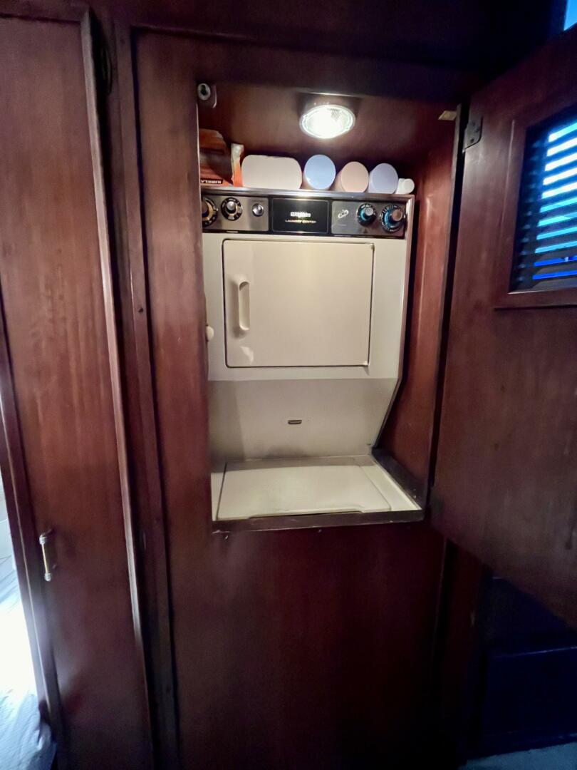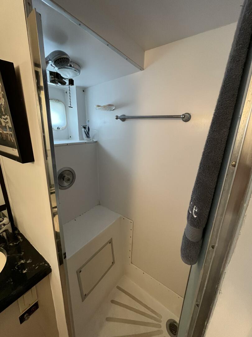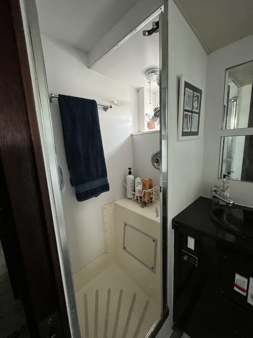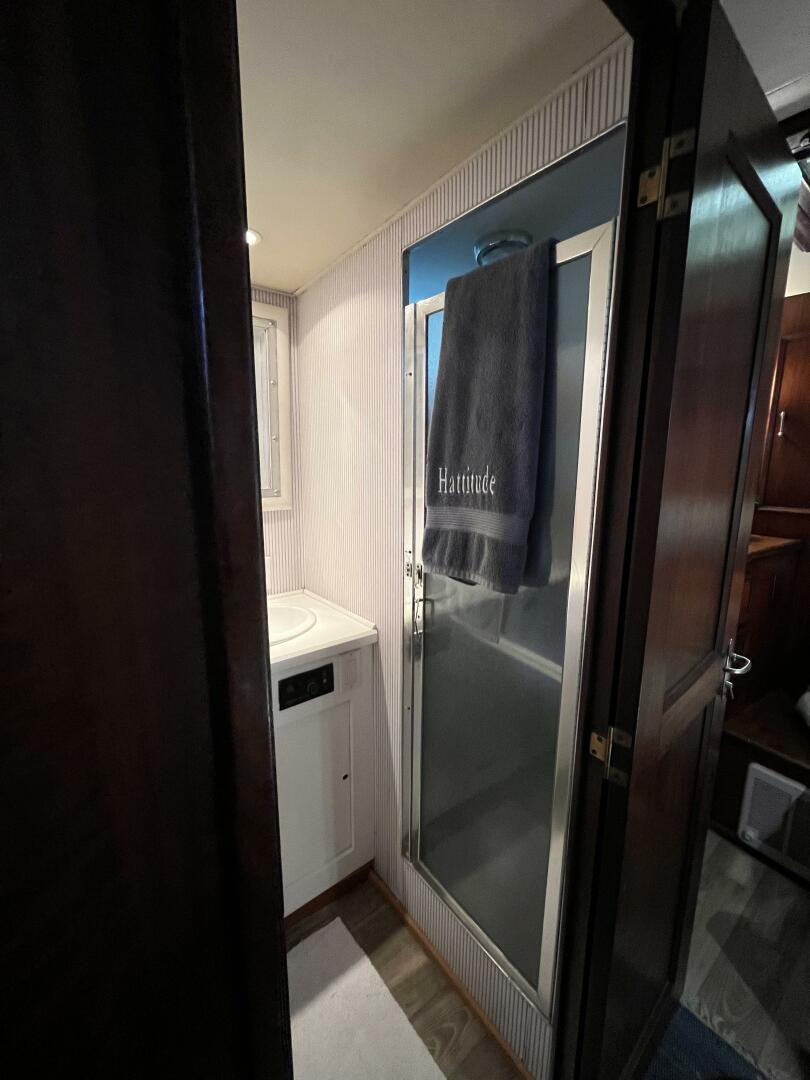 Forward of the galley is the v-berth with two bunks stbd side, each with reading lamps. Two speakers, two porthole windows and a large overhead hatch. Large counter space with two drawers and bottom cabinet. The windlass chain locker is forward and houses 300 ft of anchor rode (200 ft of 3/8 chain + 100 ft of twisted rope). Located aft is the head with a Galley Maid toilet, countertop with sink, cabinet space below and a shower stall. Directly across to the stbd side is the Frigidaire stacked washer/dryer and closet.