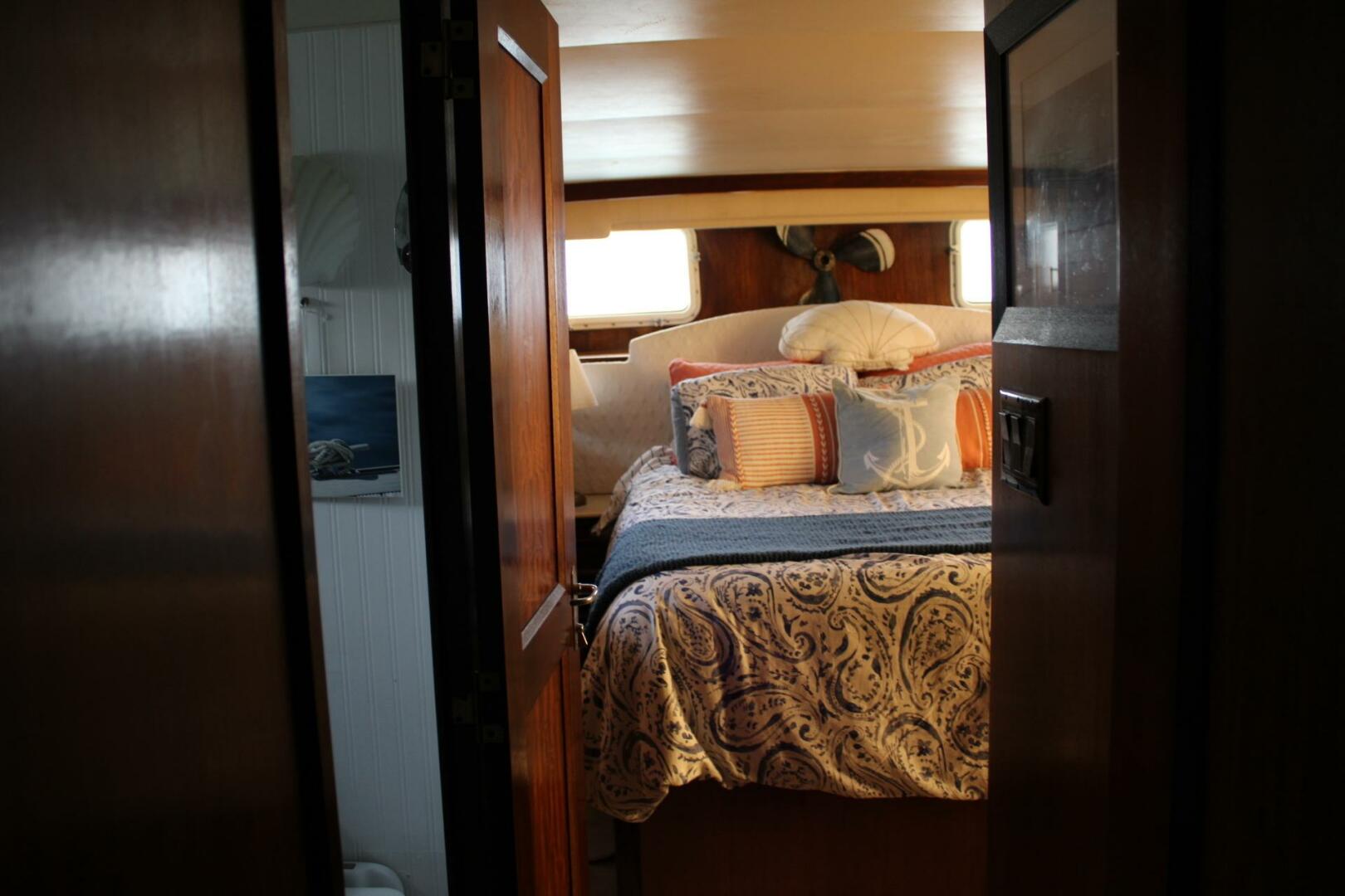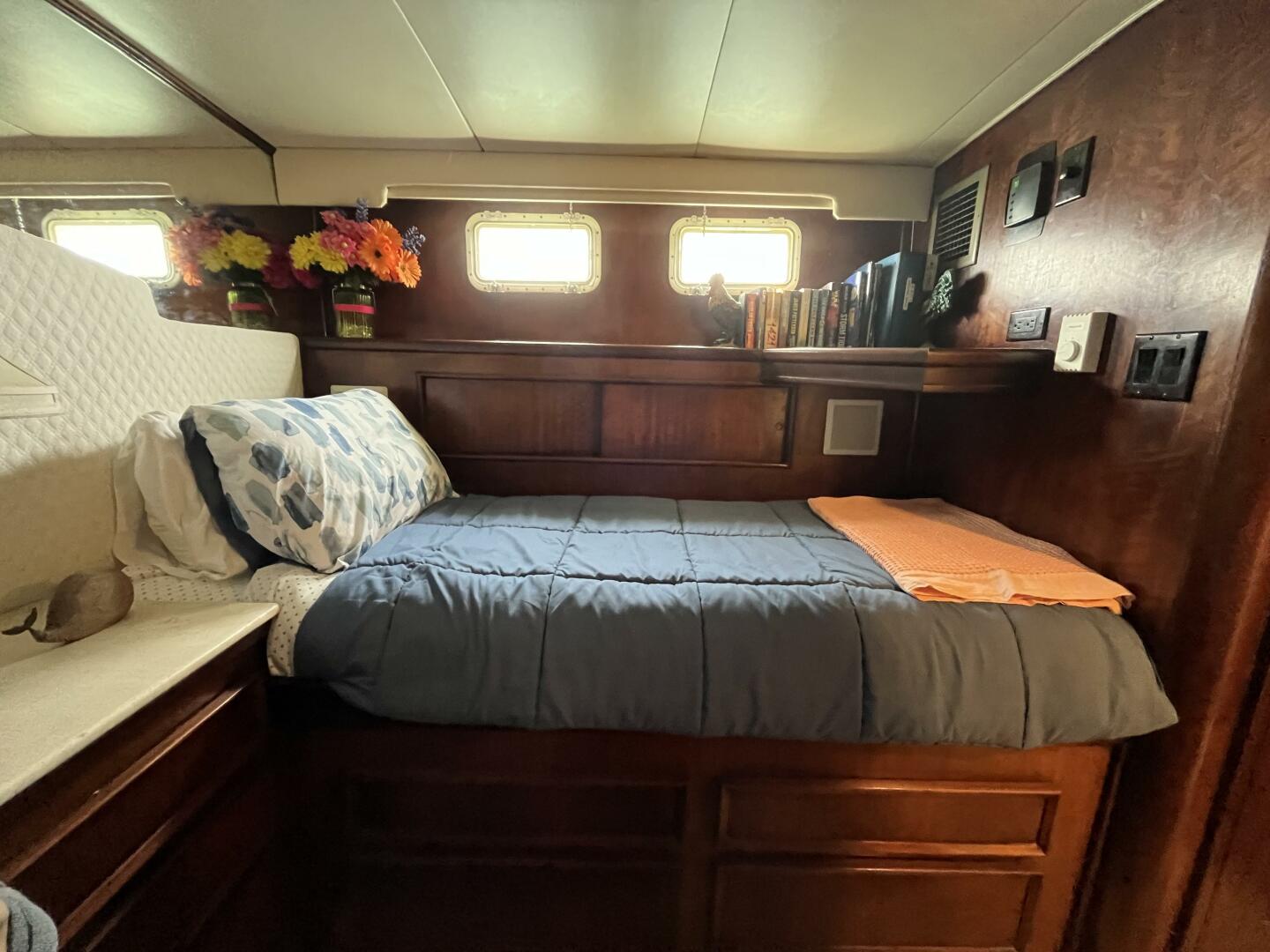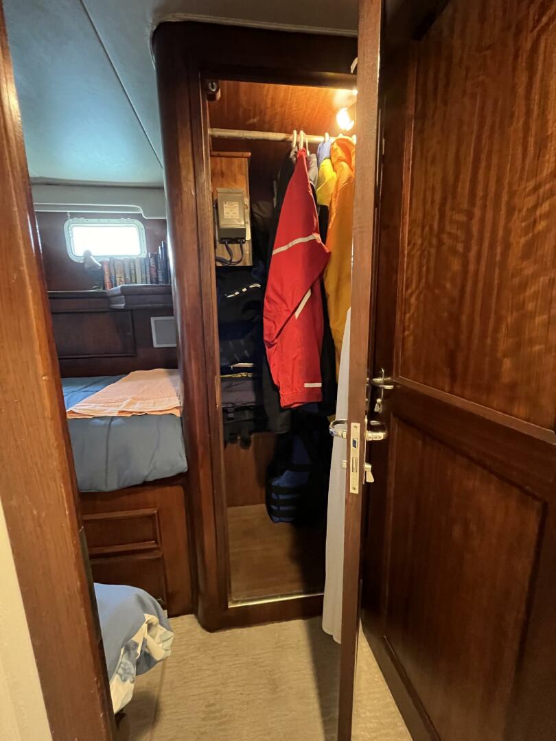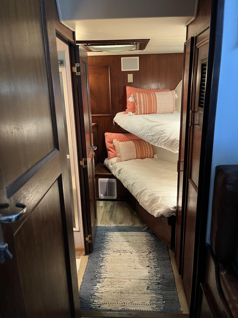 Forward of the galley is the v-berth with two bunks stbd side, each with reading lamps. Two speakers, two porthole windows and a large overhead hatch. Large counter space with two drawers and bottom cabinet. The windlass chain locker is forward and houses 300 ft of anchor rode (200 ft of 3/8 chain + 100 ft of twisted rope). Located aft is the head with a Galley Maid toilet, countertop with sink, cabinet space below and a shower stall. Directly across to the stbd side is the Frigidaire stacked washer/dryer and closet.