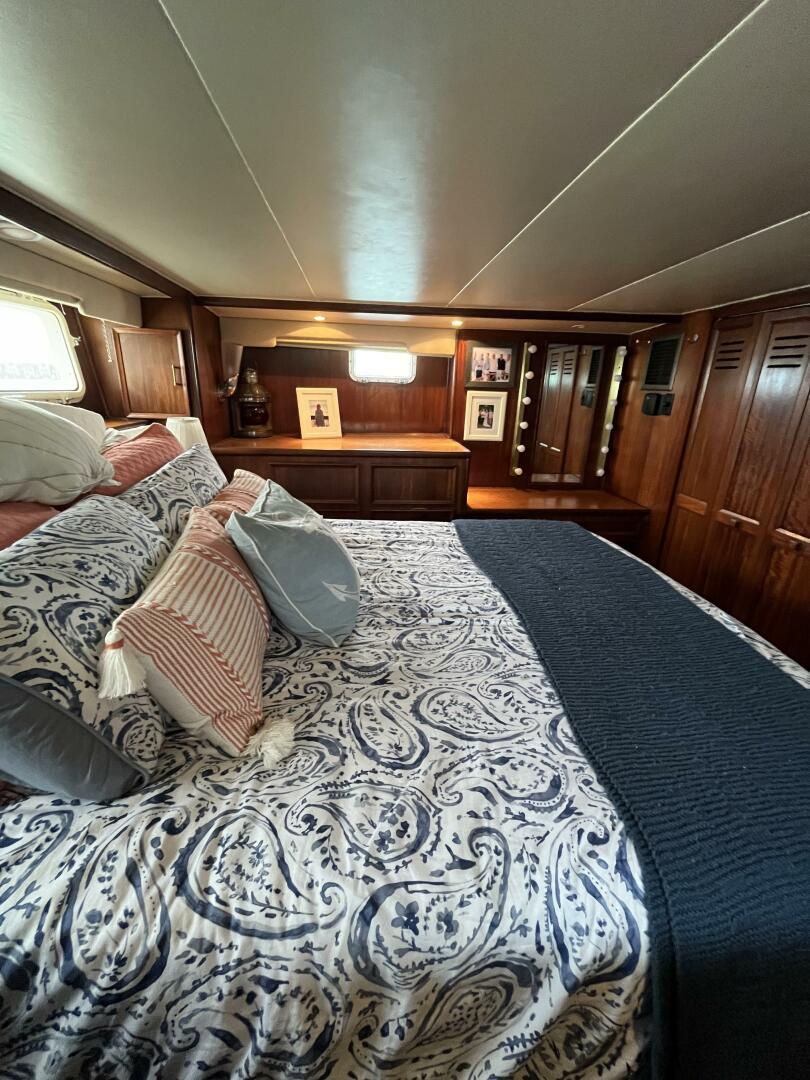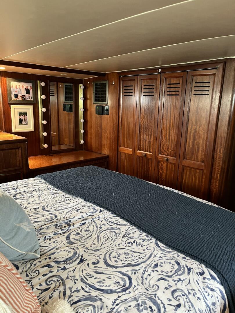 Further aft is the master stateroom with an ensuite head. The stateroom is comprised of a centerline queen berth, nightstand on both sides along with lamps. There is an abundant amount of dresser drawer space throughout the stateroom. A vanity is located portside and forward of that are the bi-fold doors that open up to a large closet.
