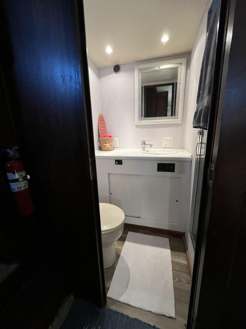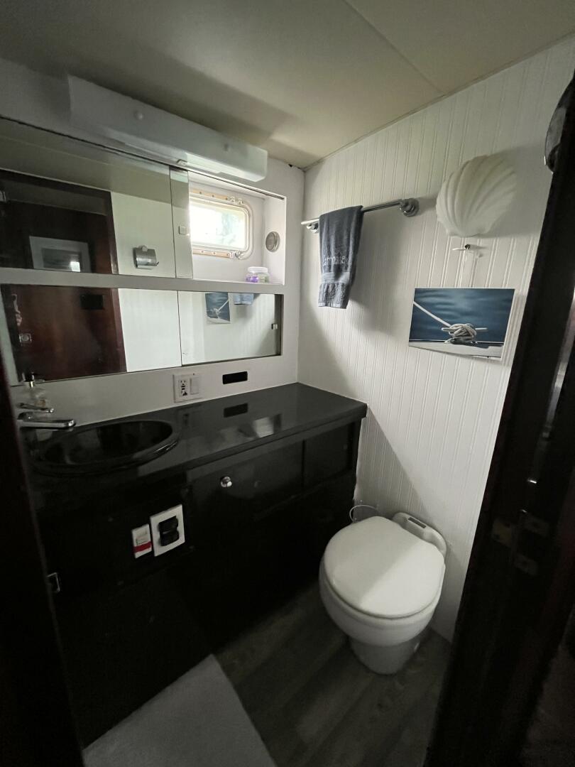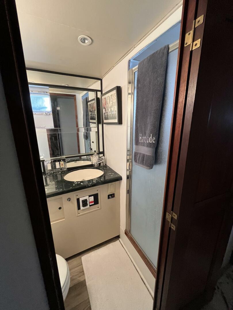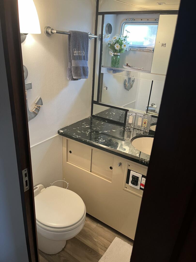Across the hallway on the stbd side is the guest head that contains a Raritan Elegance vacuflush toilet with setting to draw sea or tank water, stone countertop with sink, ample storage above and below the countertop, and a shower stall.
