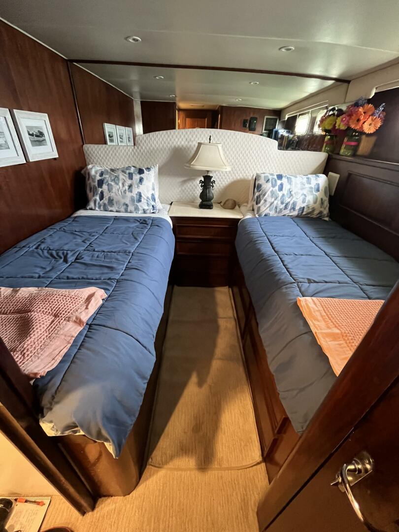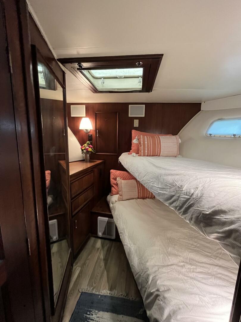 The midship port stateroom includes two twin berths with a nightstand in between with several drawers below. The outboard berth has a full-length shelf with a/c controller, speaker, slider cabinet for additional space, and four drawers below. A large hanging locker is located at the foot of the bed.