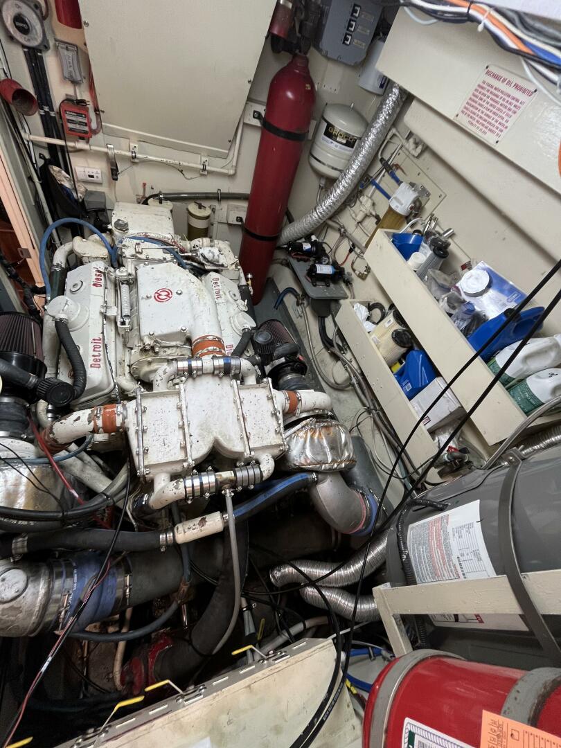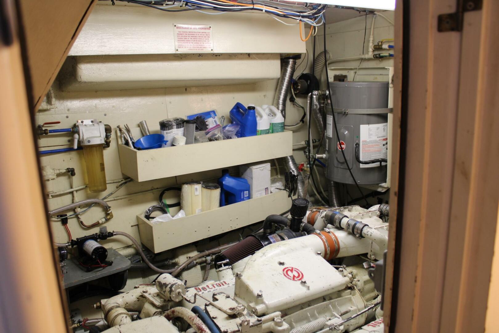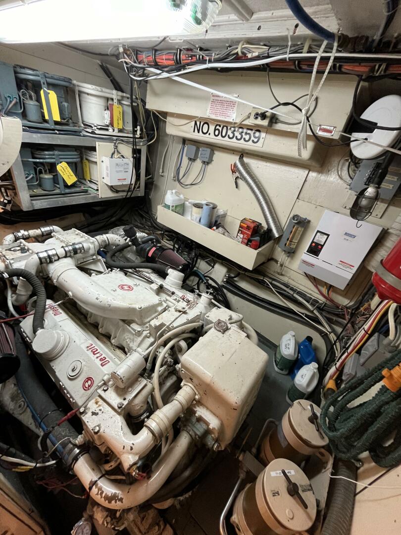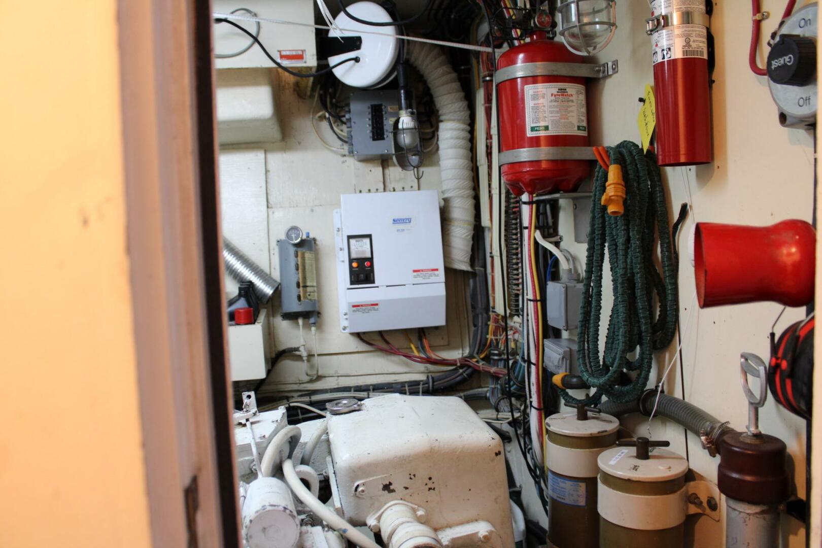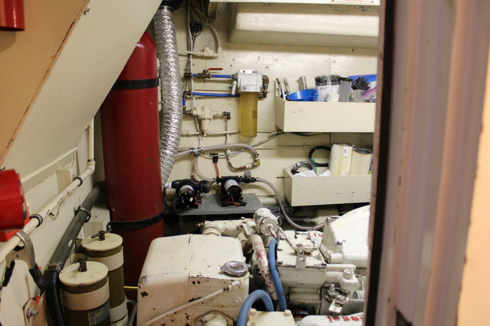 Moving aft of the galley are the two engine rooms. Port side includes the Detroit Diesel 8v71TI engine, Kidde carbon monoxide alarm, Kidde Mariner Fyre Watch suppression system, Sentry battery charger, four Cruisair reverse cycle a/c units. Starboard engine room has the Detroit Diesel 8v71TI engine, fire extinguisher, ProSafe FS60 FailSafe Galvanic Isolator, Groco pressure storage tank, Jabsco wash down, Pentair Shuffle Aqua King II, Rheem hot water heater, and Naiad stabilizer system.