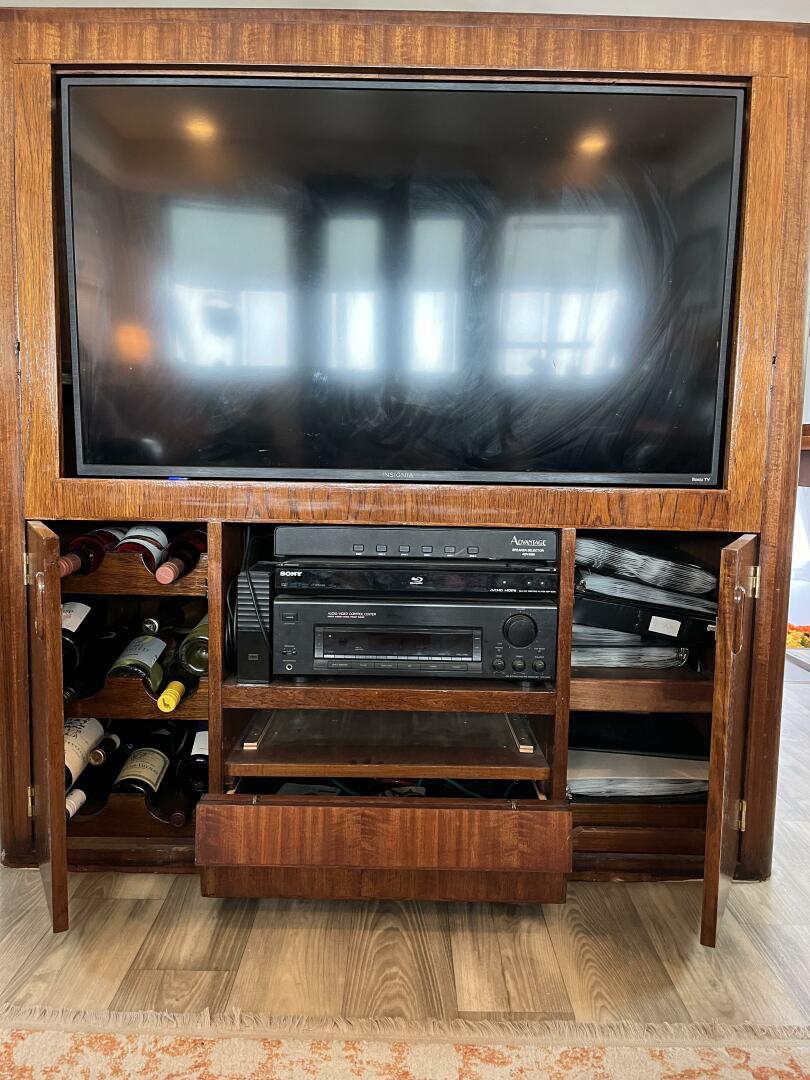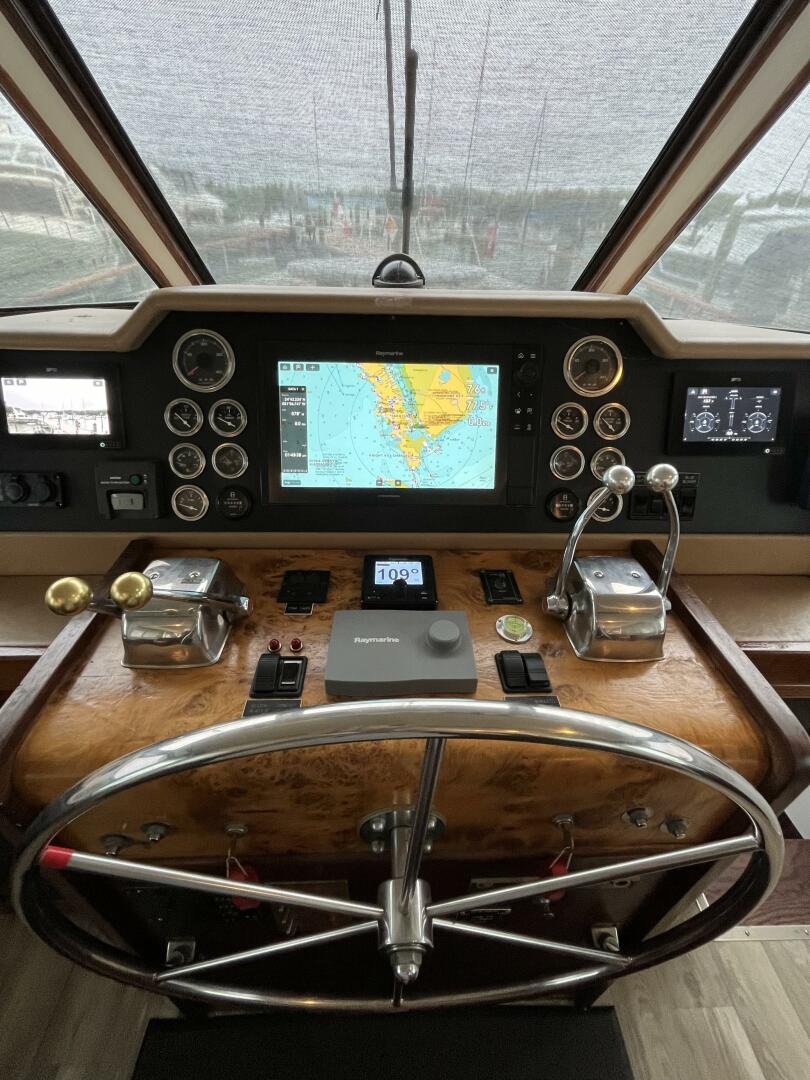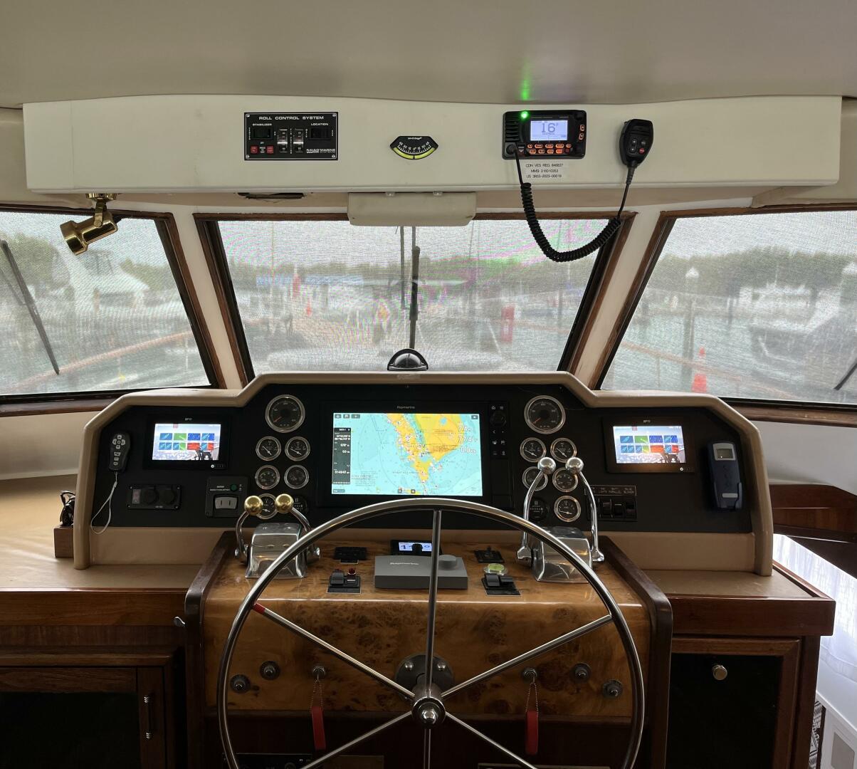 Continuing forward from the aft deck you’ll enter the spacious main salon area. The 360 degrees of panoramic views provide a great feeling of openness and excellent visibility. The aft stbd side cabinet houses the encased a/c unit with the stereo amplifier and speaker controls with a storage cabinet below. Forward are two leather bucket chairs with a table in between and a mounted swing arm reading lamp. Portside has a leather couch with end tables at each end, a mounted swing arm reading lamp in the aft corner and a storage shelf forward. Center is the Insignia flatscreen tv, dvd player, and speaker selector. The bottom left side is a wine cabinet, center provides a pull-out drawer, and shelving on the right side. The front side has bench seating for the captain and provides storage in both armrests. The helm station consists of all new Raymarine electronics. The portside contains the Marino spotlight remote, an Axiom 7” screen, 12v USB plugs, Vetus bow thruster controls and engines gauges. Center is the Axiom 16 “Master” MFD, and mounted below it is the autopilot. Stbd side includes gauges, another Axiom 7” screen, and Lofrans windlass remote. All mechanical gauge data is digitized and fed into the NEMA 2000 backbone that runs to the upper helm. Overhead includes the ICOM VHF radio and Naiad stabilizer control panel. The 32v DC panel is located outboard port side and next to it is the 110v and 220v panel. Above the circuit panel are the a/c controls, Magnum Inverter/ Charger monitor, Victron panels, and an 110v electrical outlet.