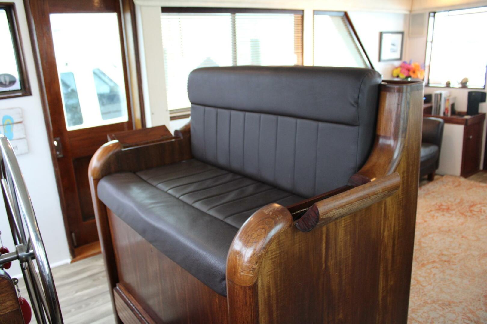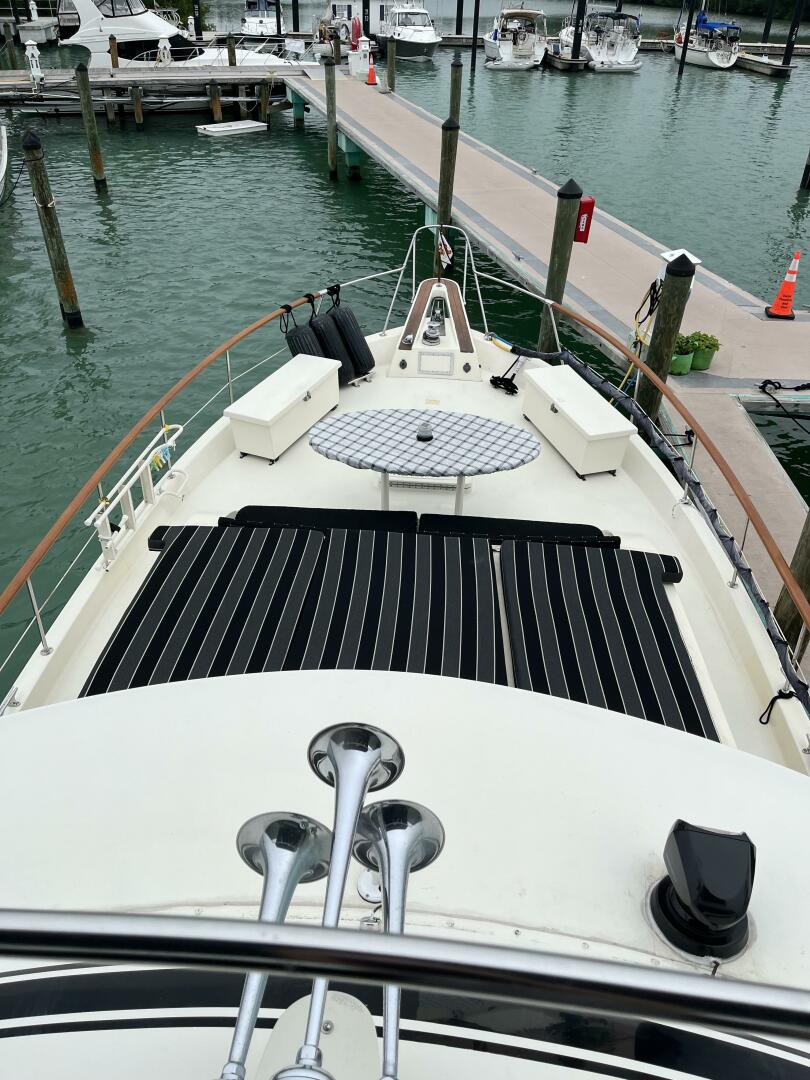 The flybridge has new EVA flooring in the aft seating area with two Adirondack chairs and table. Forward is the helm station that has duplicate electronics as the lower helm and two captains’ chairs. The helm station and both captains’ chairs have new custom Sunbrella covers. A long cushioned bench for seating several guests is directly in front of the helm. Two new Sunbrella biminis attach to the arch (for the main and aft areas). The Marquis davit is located stbd, and aft of the arch.