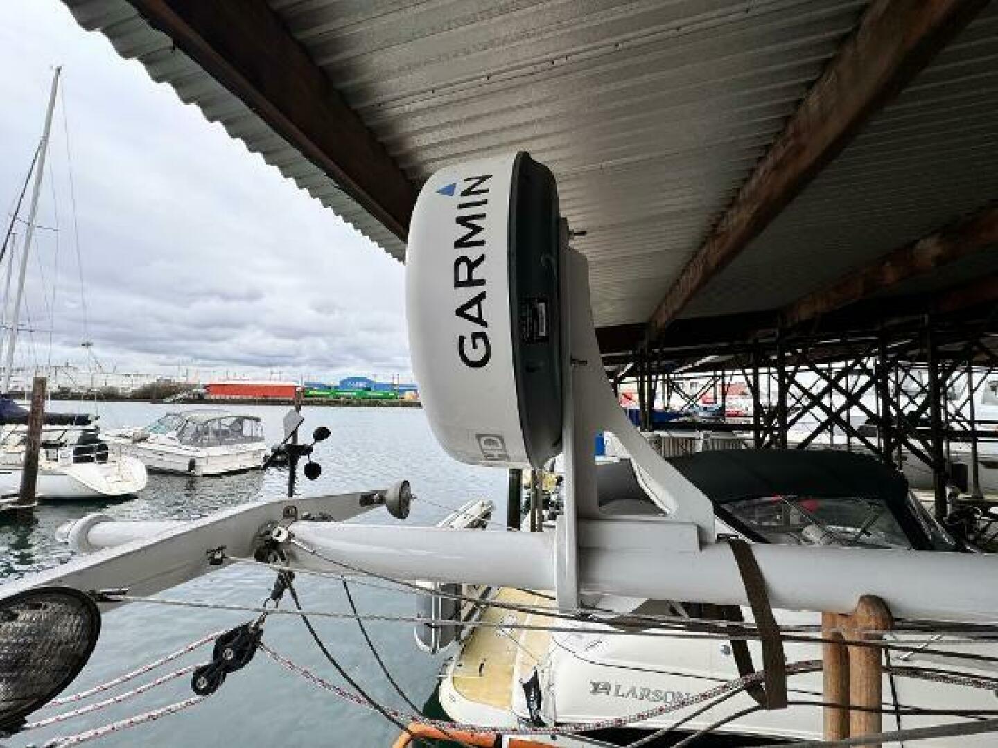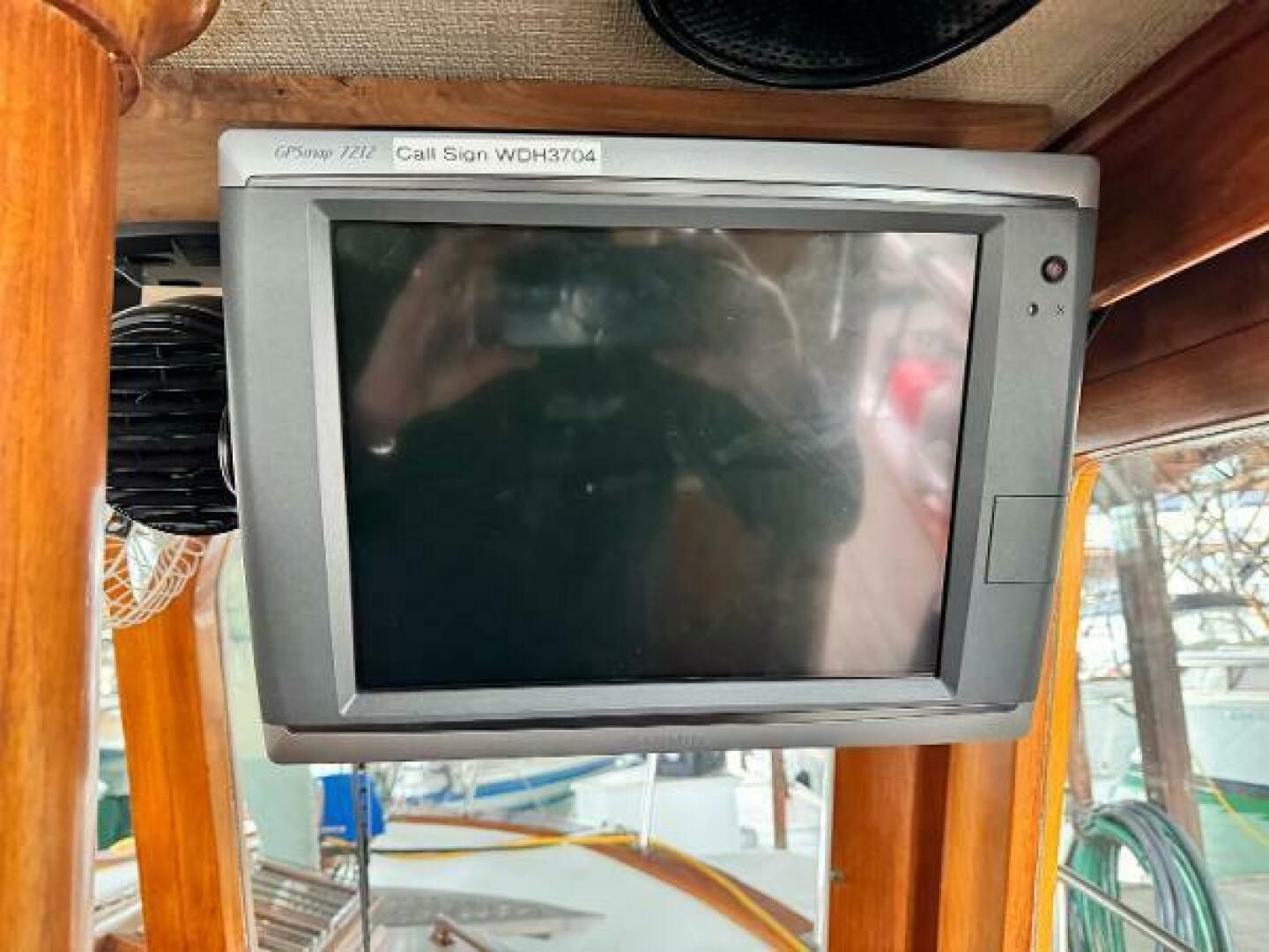 - Garmin 7212 touch screen plotter with radar/sounder interface at helm