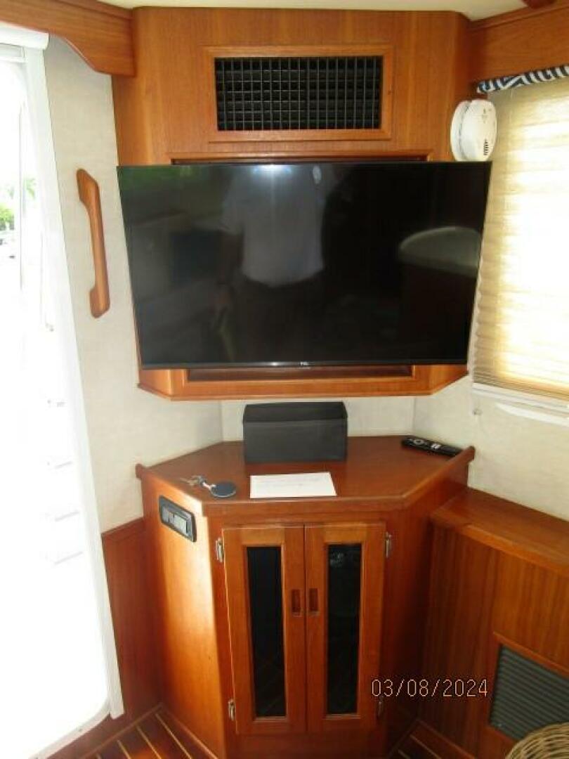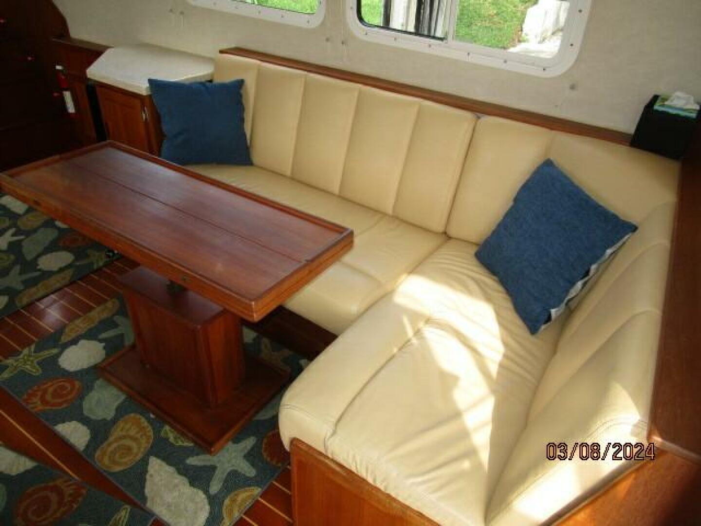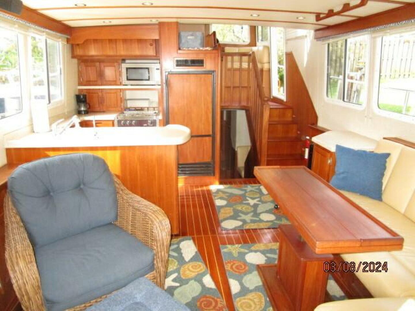 The salon offers L-shaped seating with storage (Converts to a double size berth) and a hi/lo folding teak table starboard aft, entertainment center and storage cabinetry port aft, lounge chair and ottoman with storage to port, U-Line icemaker (2023) and storage cabinet to starboard, opening side windows with screens and blinds, aft window with blinds, teak & holly sole