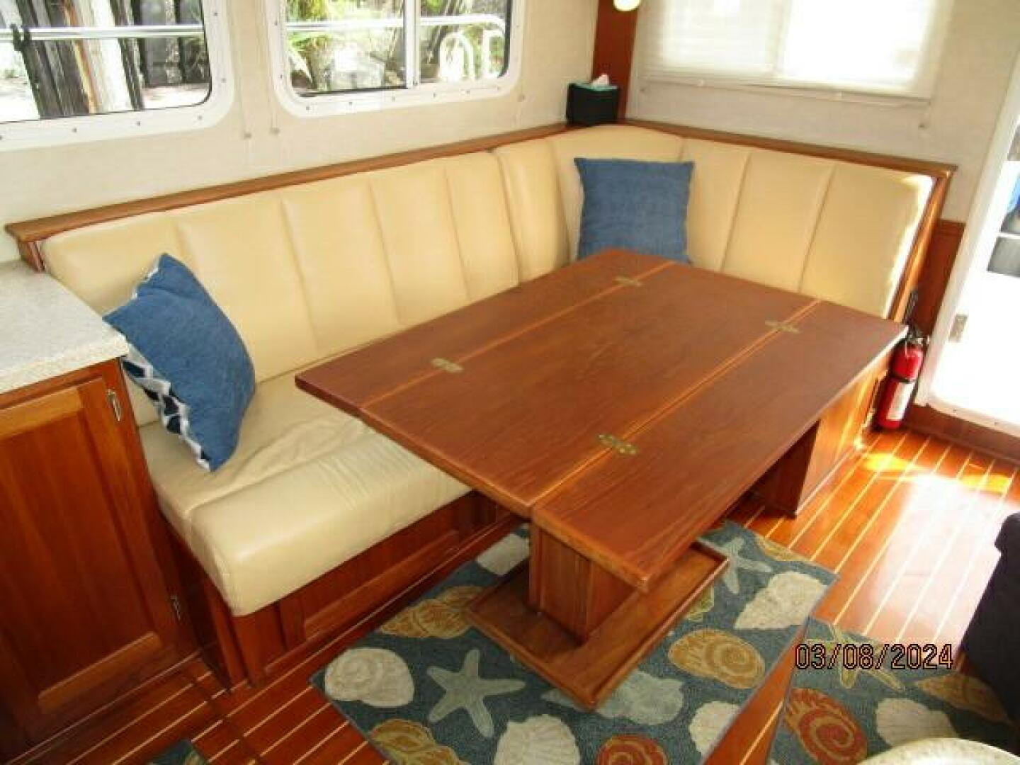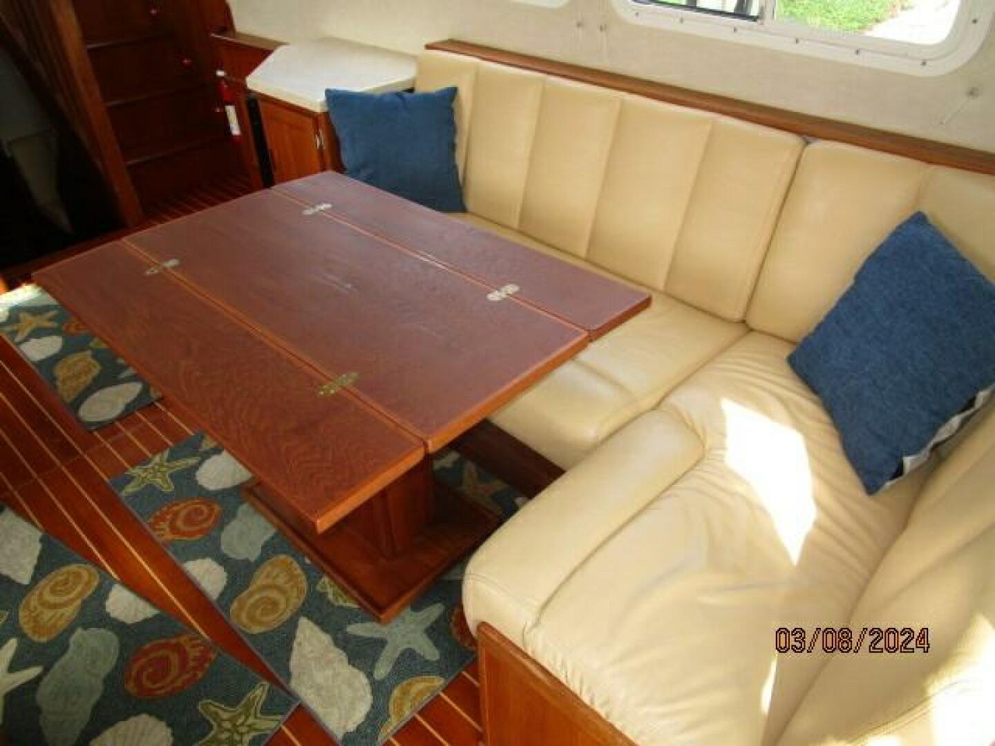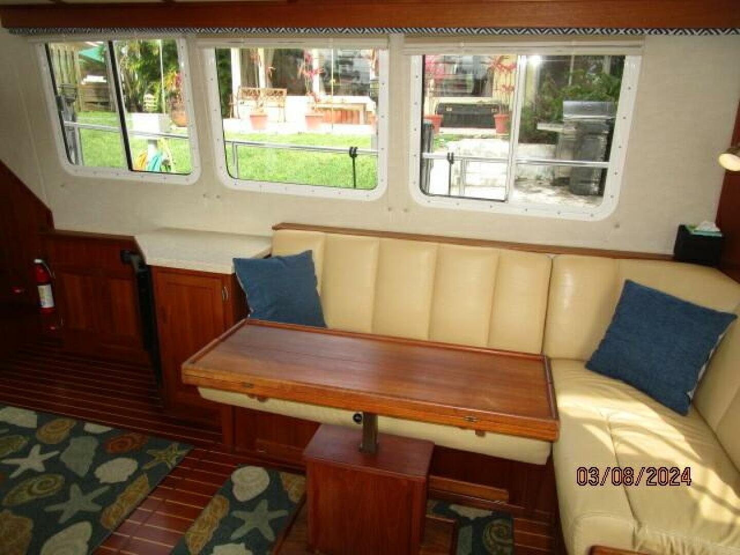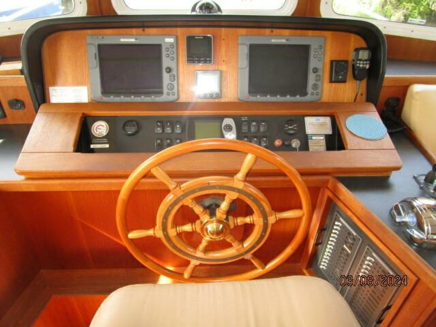 The raised pilothouse offers a side deck access door on each side, full helm, opening side windows with screens and blinds, opening aft windows with screens, benchseat and table port aft, teak & holly sole, Lebroc helmseat, benchseat starboard forward, storage cabinet and drawers and a chart book counter.
