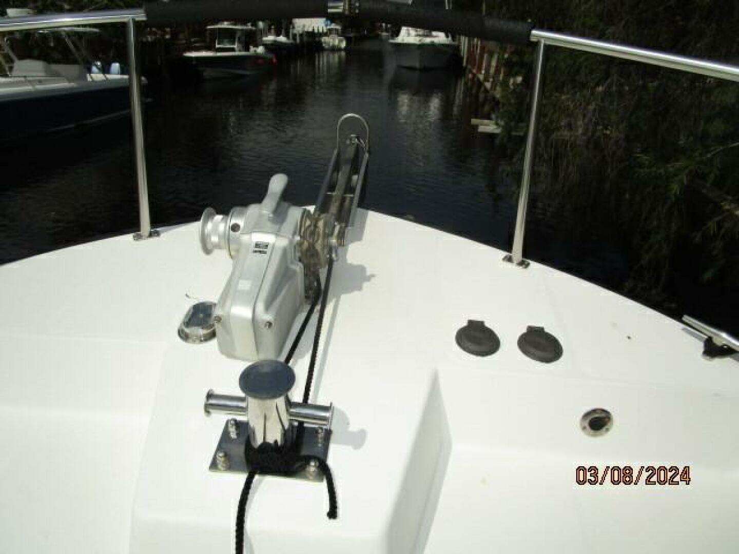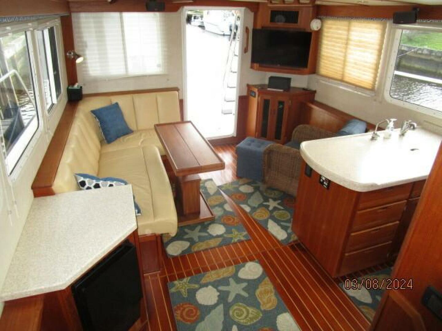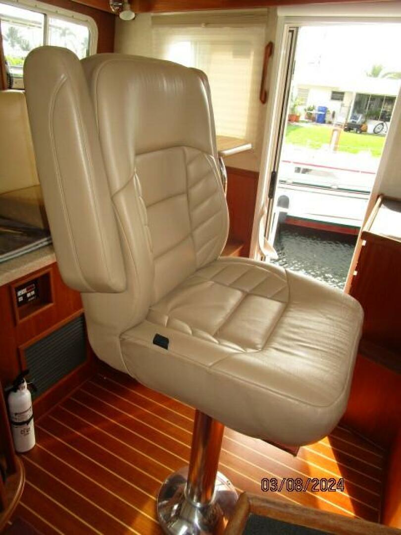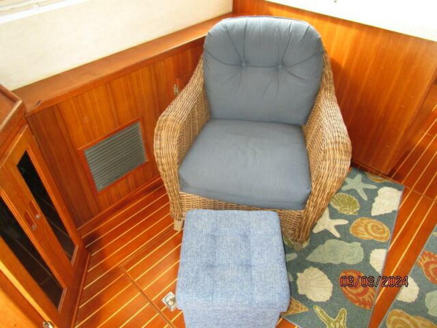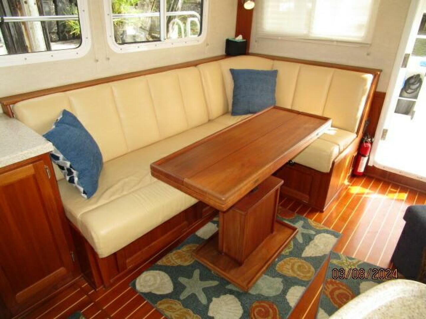 The raised pilothouse offers a side deck access door on each side, full helm, opening side windows with screens and blinds, opening aft windows with screens, benchseat and table port aft, teak & holly sole, Lebroc helmseat, benchseat starboard forward, storage cabinet and drawers and a chart book counter.