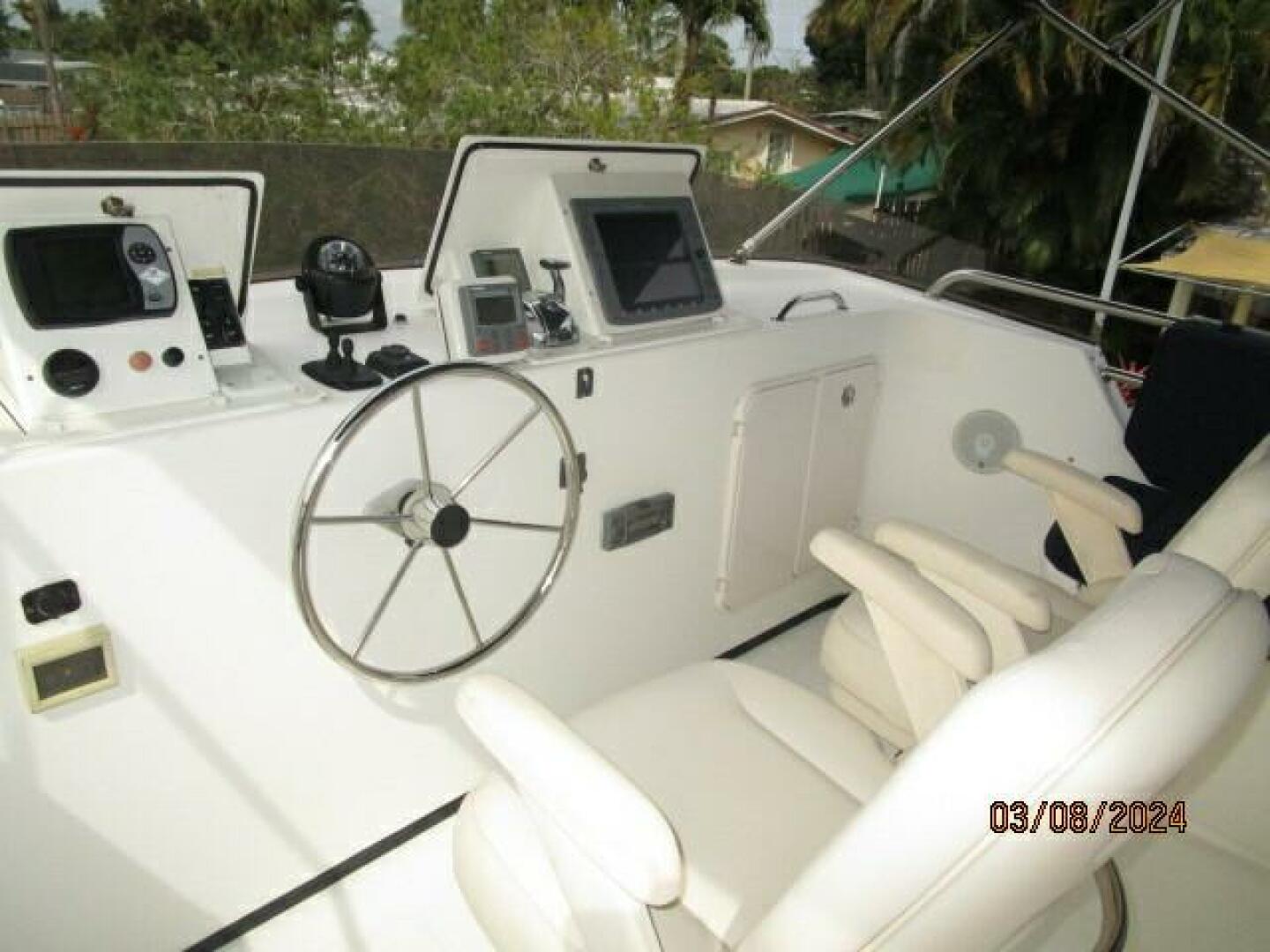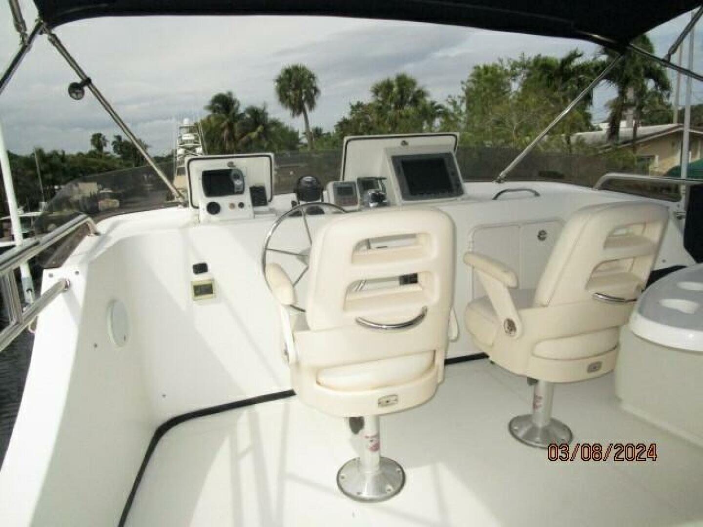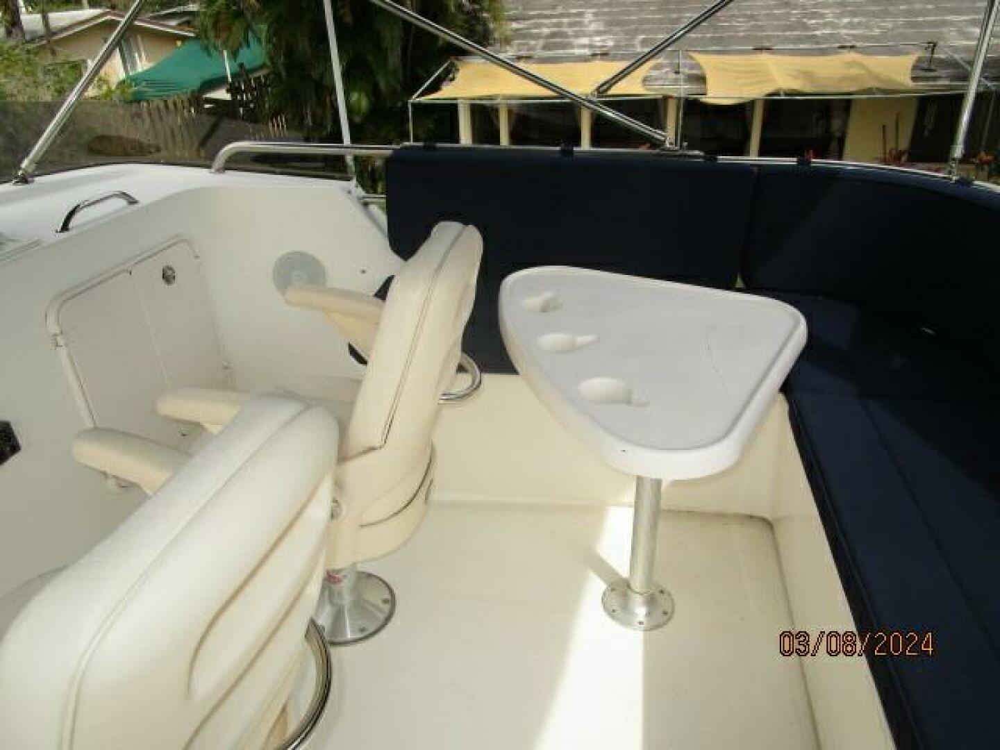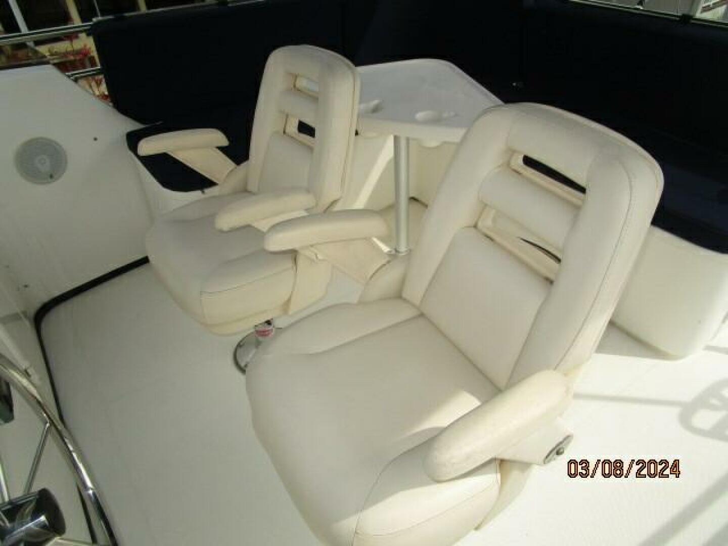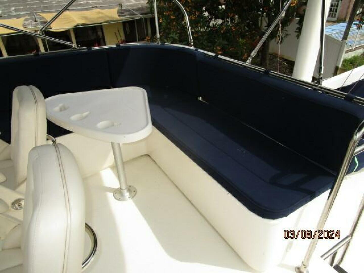 The flybridge offers a bimini, non-skid deck, wrap-around seating with storage and a removable table starboard and aft, 2 Pompanette helmseats and a full helm.