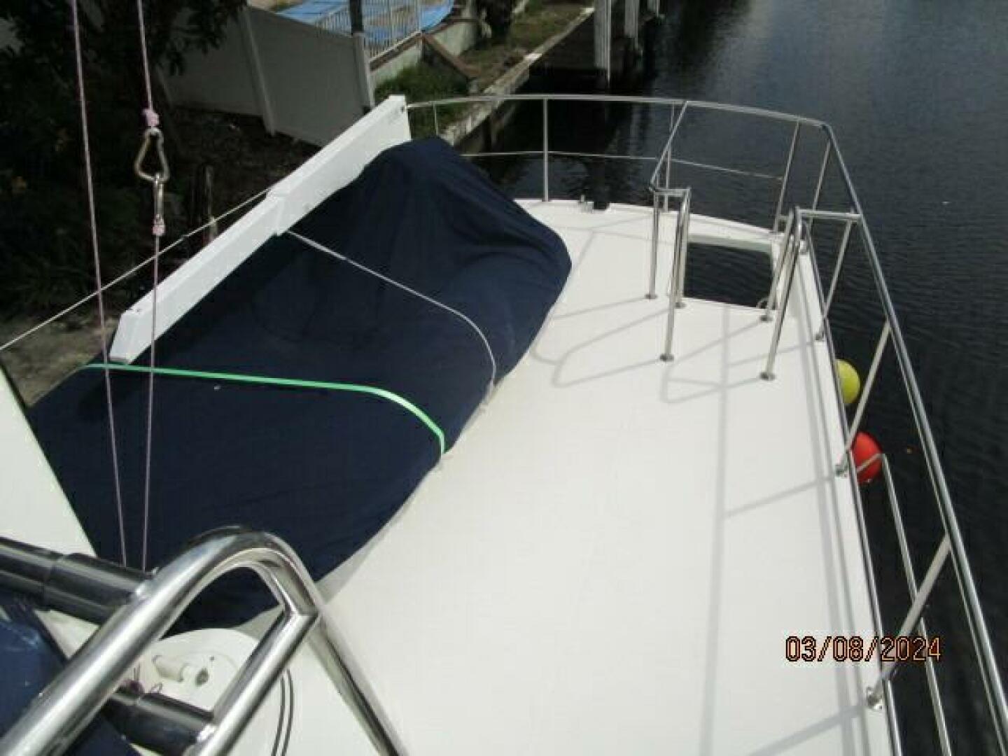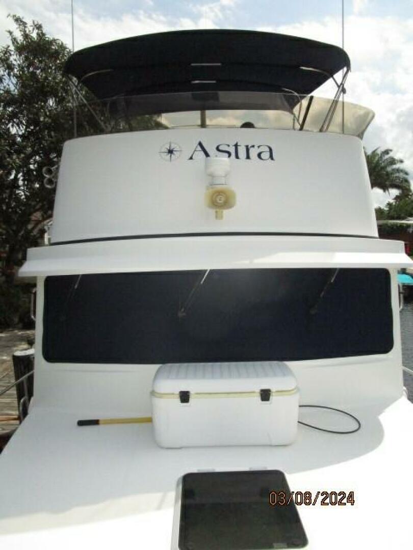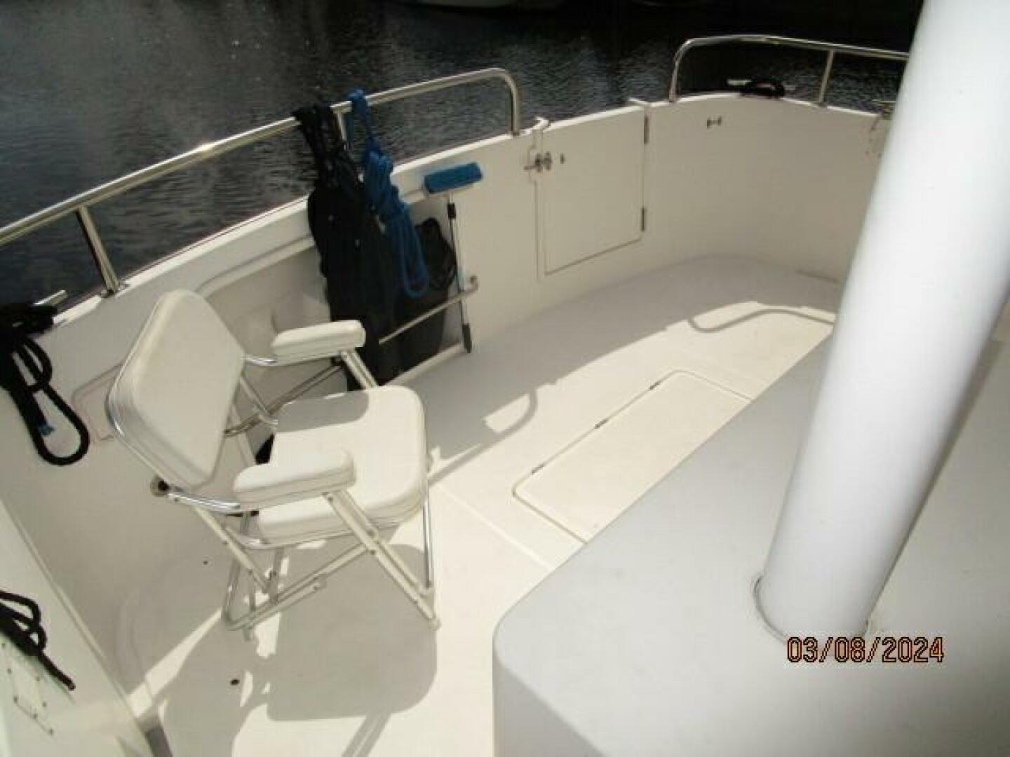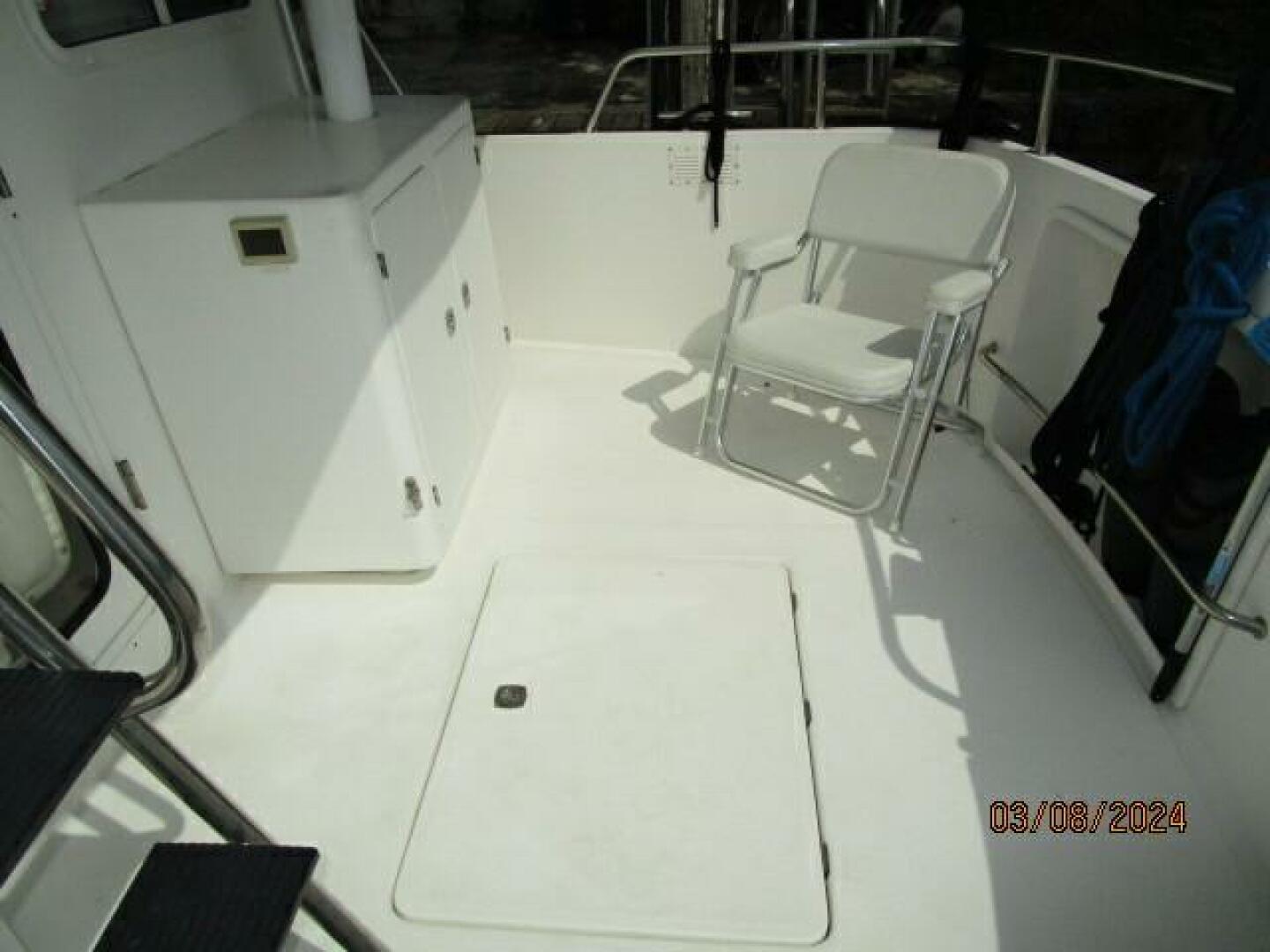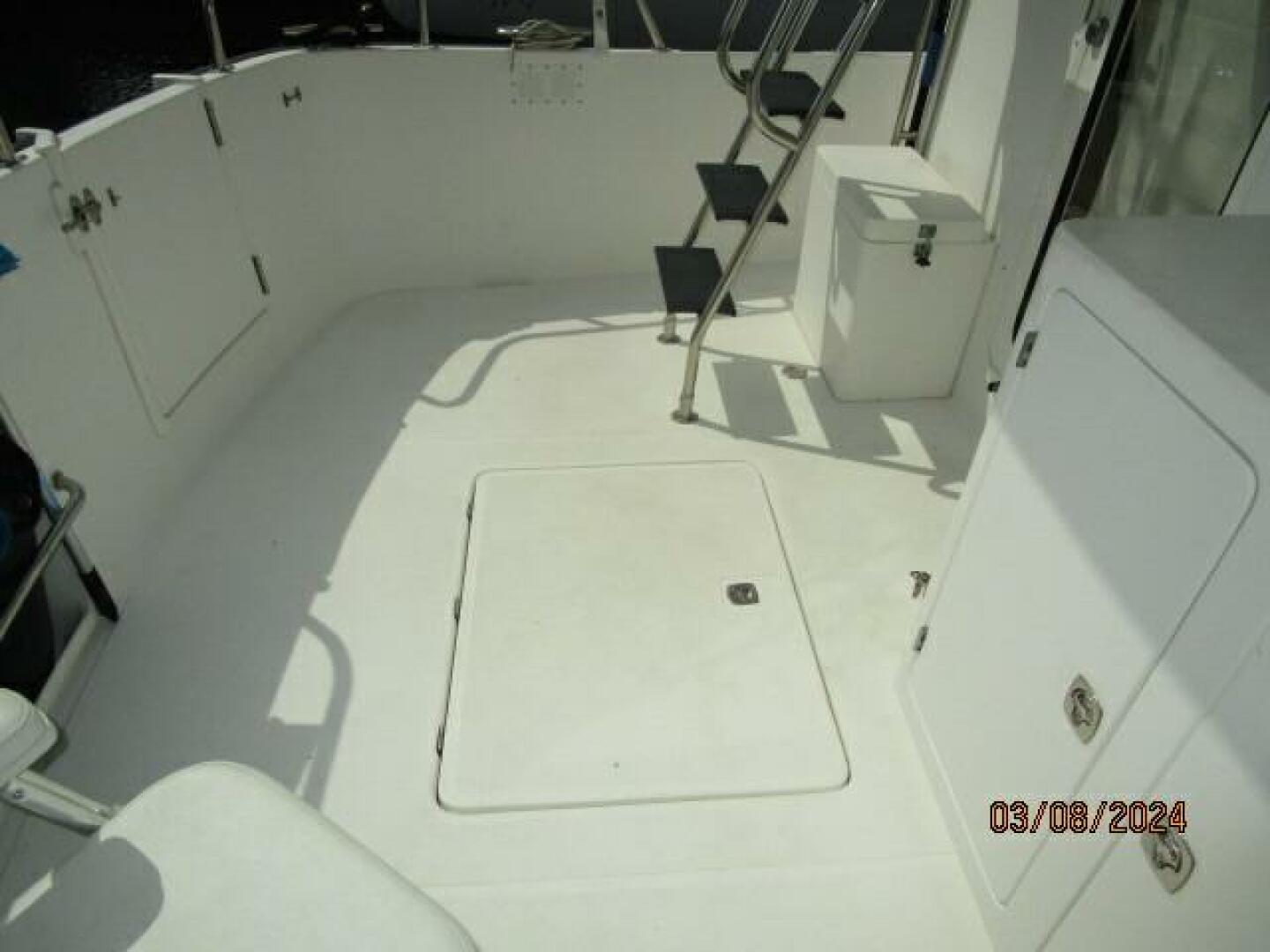 The aftdeck offers a transom gate to the fiberglass swimplatform, stainless steel rails on a solid bulwark, transom fender storage, deck chair, hot/cold, fresh water shower, molded-in steps to each side deck, stainless steel ladder to the flybridge, Lazarette access, propane locker, storage locker and a Diamond Seaglaze aluminum & glass door to the salon.
