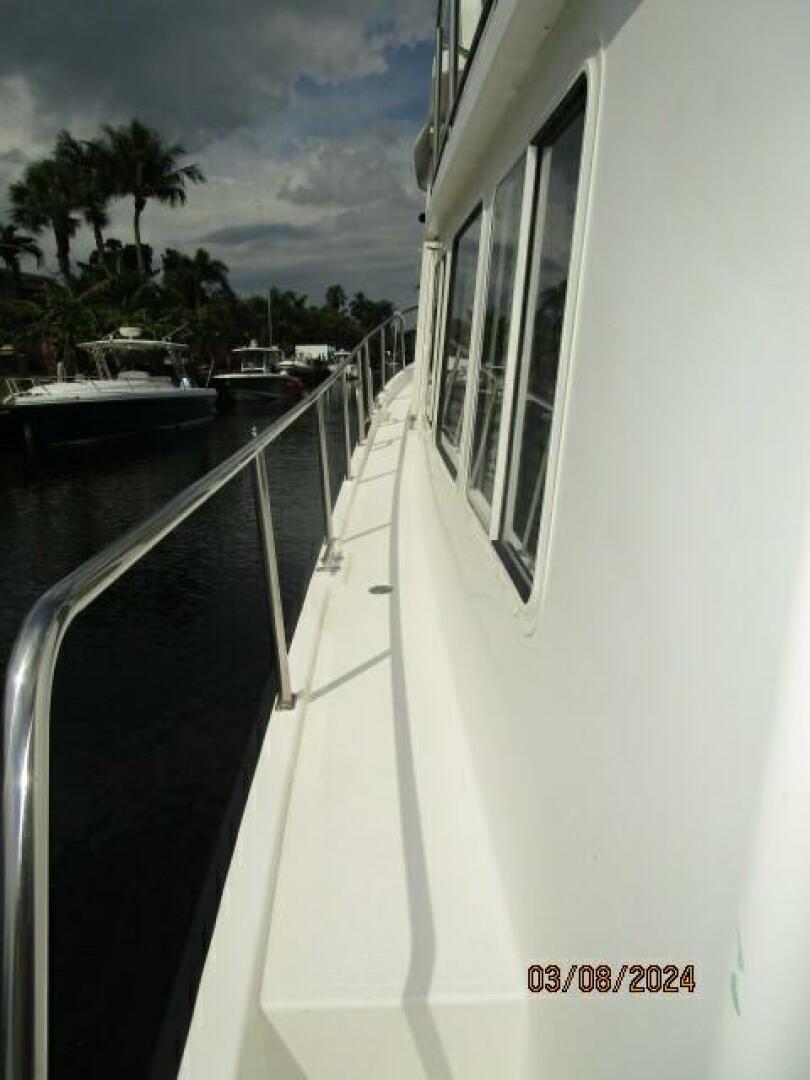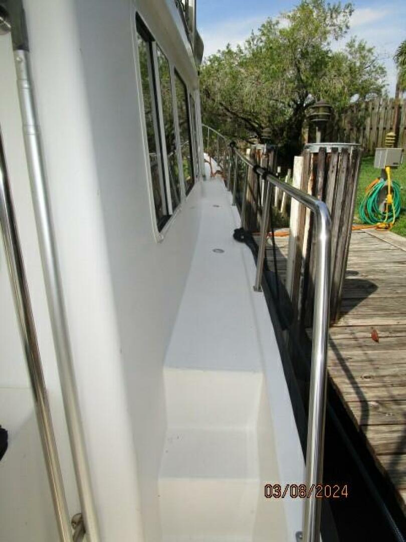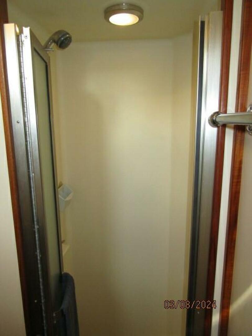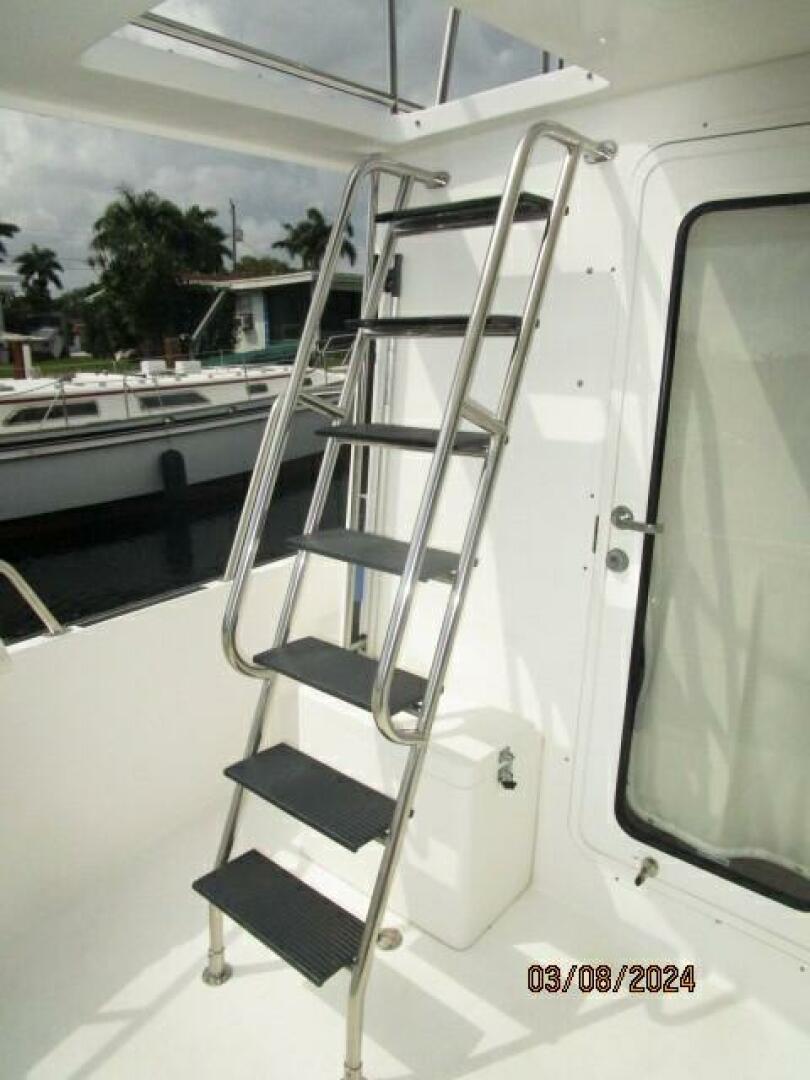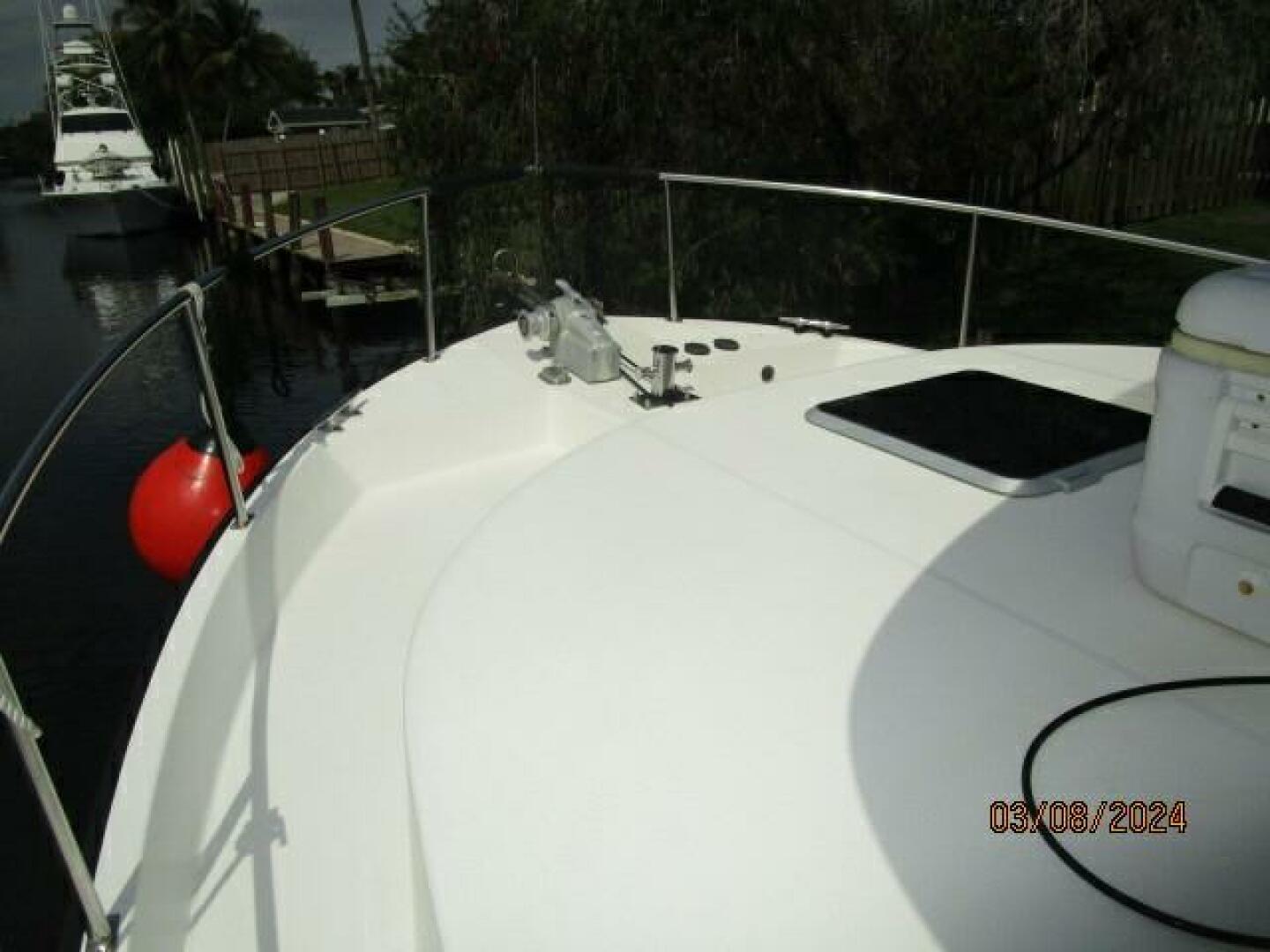 The aftdeck offers a transom gate to the fiberglass swimplatform, stainless steel rails on a solid bulwark, transom fender storage, deck chair, hot/cold, fresh water shower, molded-in steps to each side deck, stainless steel ladder to the flybridge, Lazarette access, propane locker, storage locker and a Diamond Seaglaze aluminum & glass door to the salon.