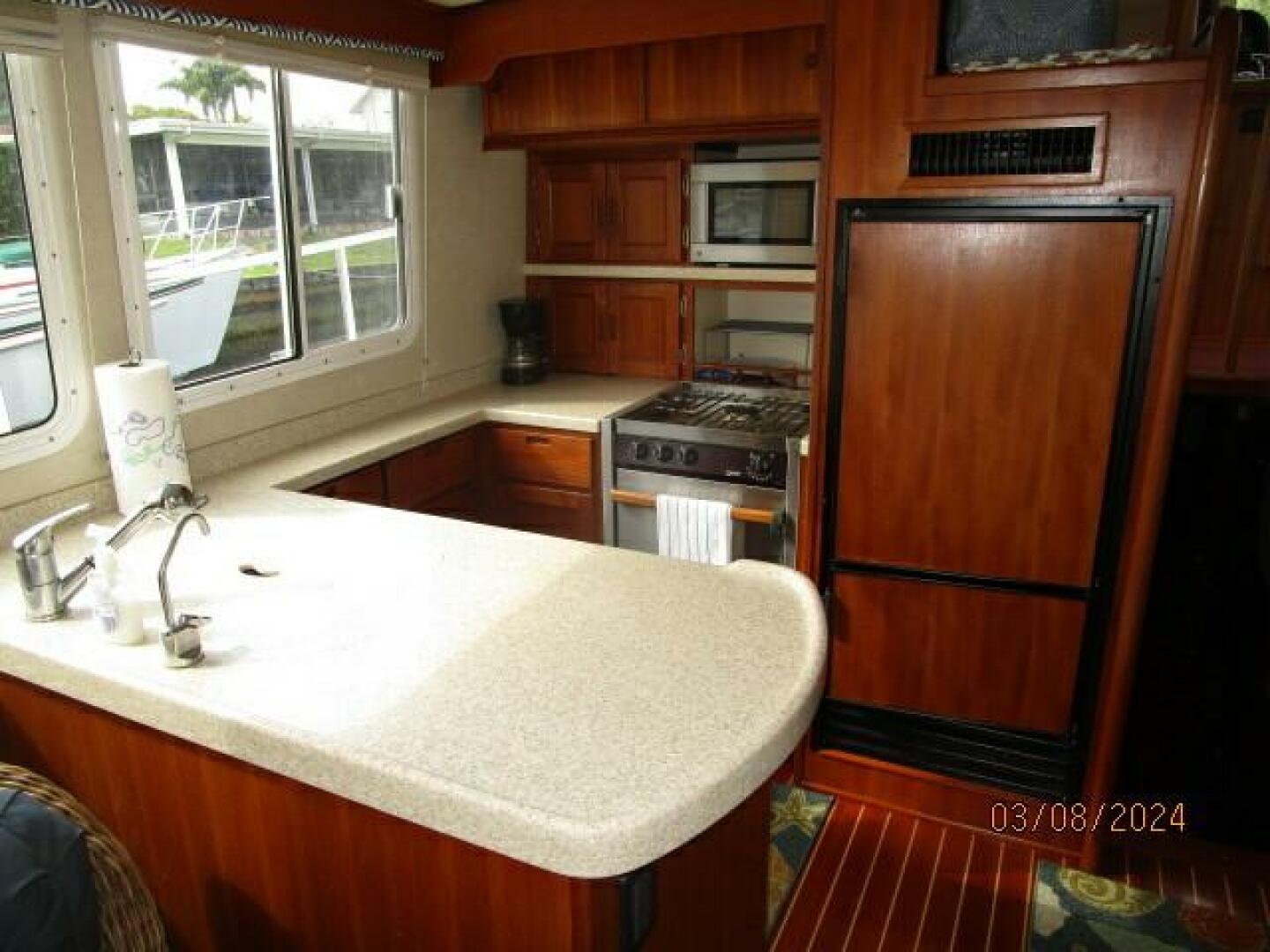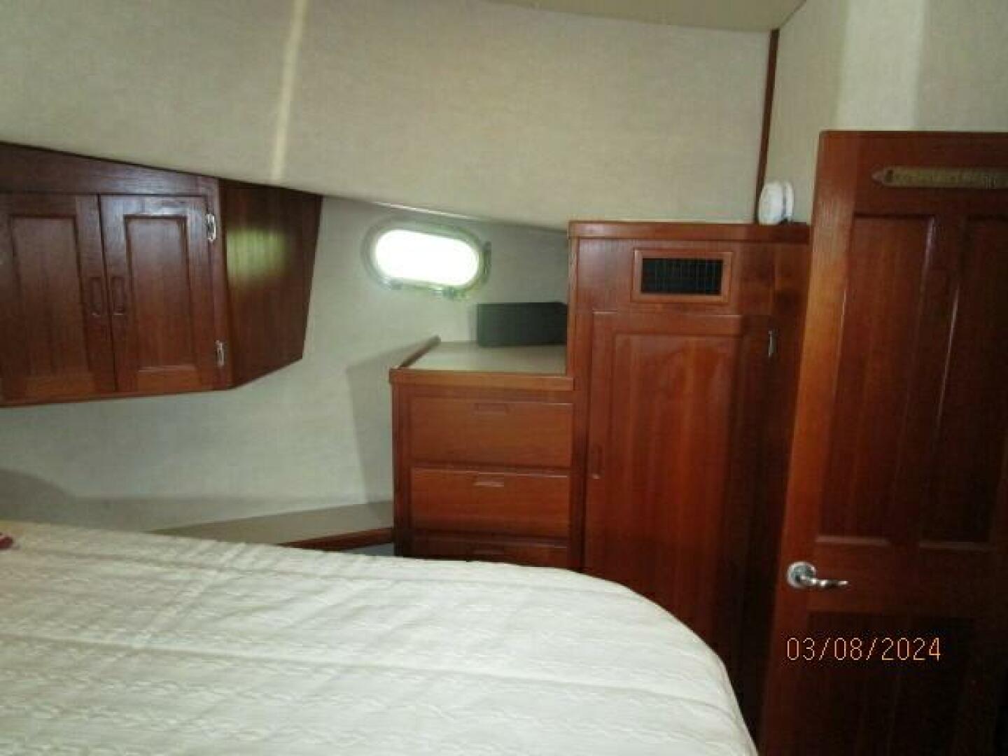 From the fiberglass swimplatform, you enter the aftdeck via the transom gate and can then step up molded-in steps to each side deck, step up the stainless steel ladder to the tender deck and flybridge or step into the salon via the Diamond Seaglaze aluminum & glass door. Once inside the salon, you will find an entertainment center and storage cabinetry port aft, lounge chair and ottoman with storage to port, galley port forward, L-shaped seating with storage and a high/low folding teak table starboard aft, icemaker and storage cabinet to starboard and companionways to the pilothouse and staterooms starboard forward. Walk forward and step down to find an office desk to starboard, guest stateroom to port, guest head with enclosed shower starboard forward and the master stateroom with ensuite head and enclosed shower all the way forward. Back in the forward salon, step up the companionway to the raised pilothouse and you will find a side deck access door on each side, Lebroc helmseat, seating and table port aft and a seat starboard forward. Engine room access is via a salon sole hatch.