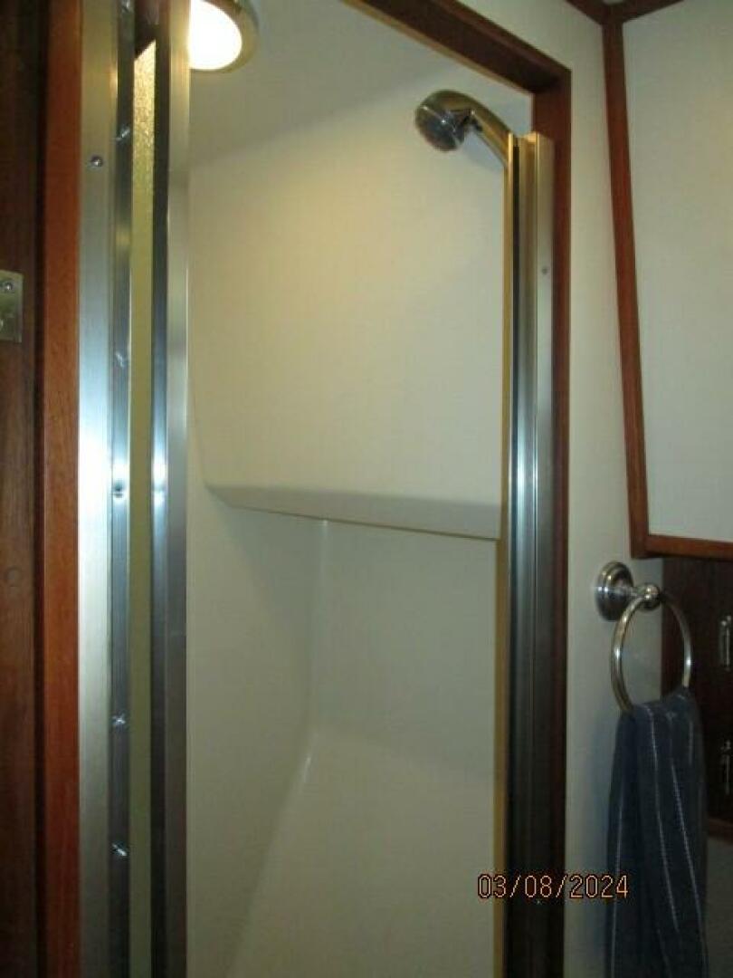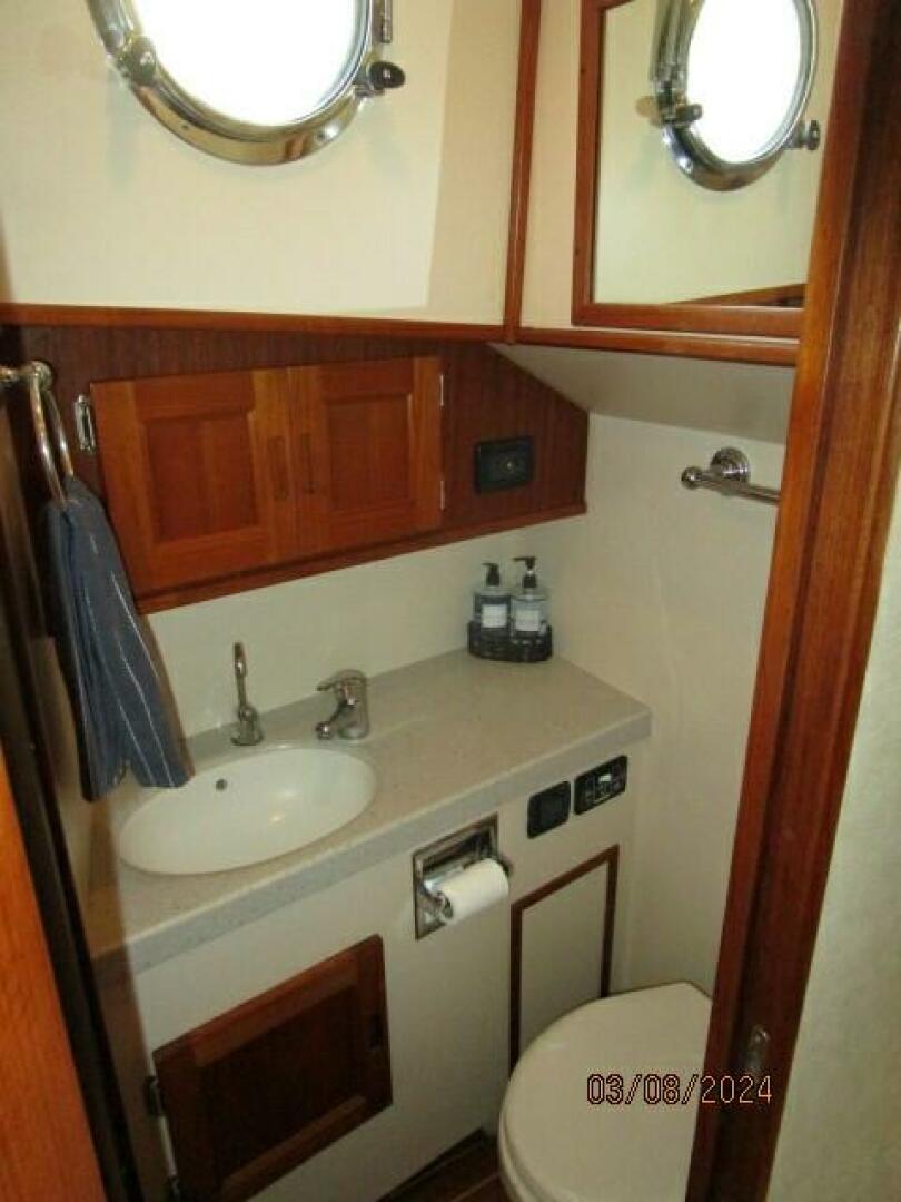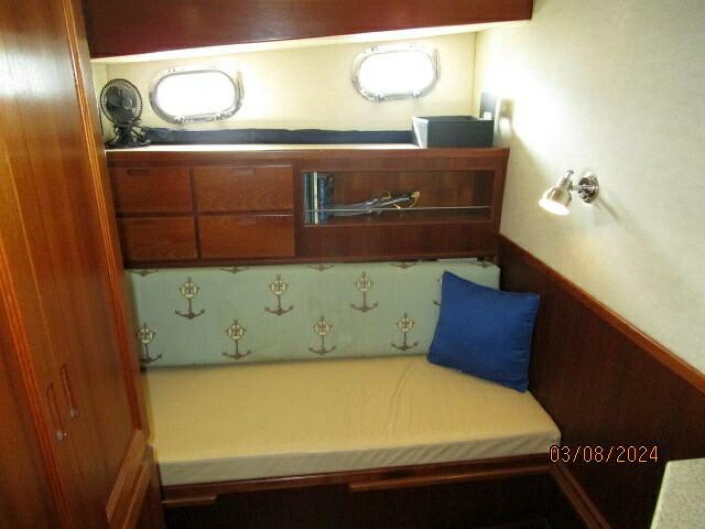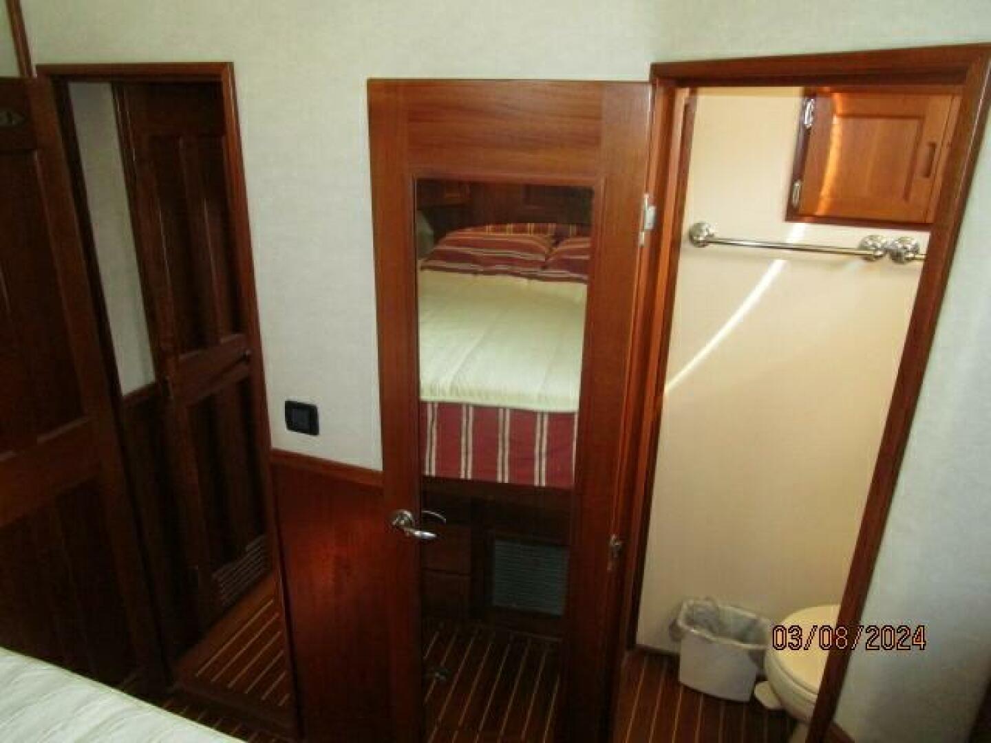 The guest stateroom is to port and offers a single size berth that converts into a double size berth, storage drawers and cabinet, hanging locker, shelf, 2 portlights, reading lights and a teak & holly sole. The guest head with enclosed shower, Vacuflush head, portlight and Corian countertop is across the companionway and slightly forward.