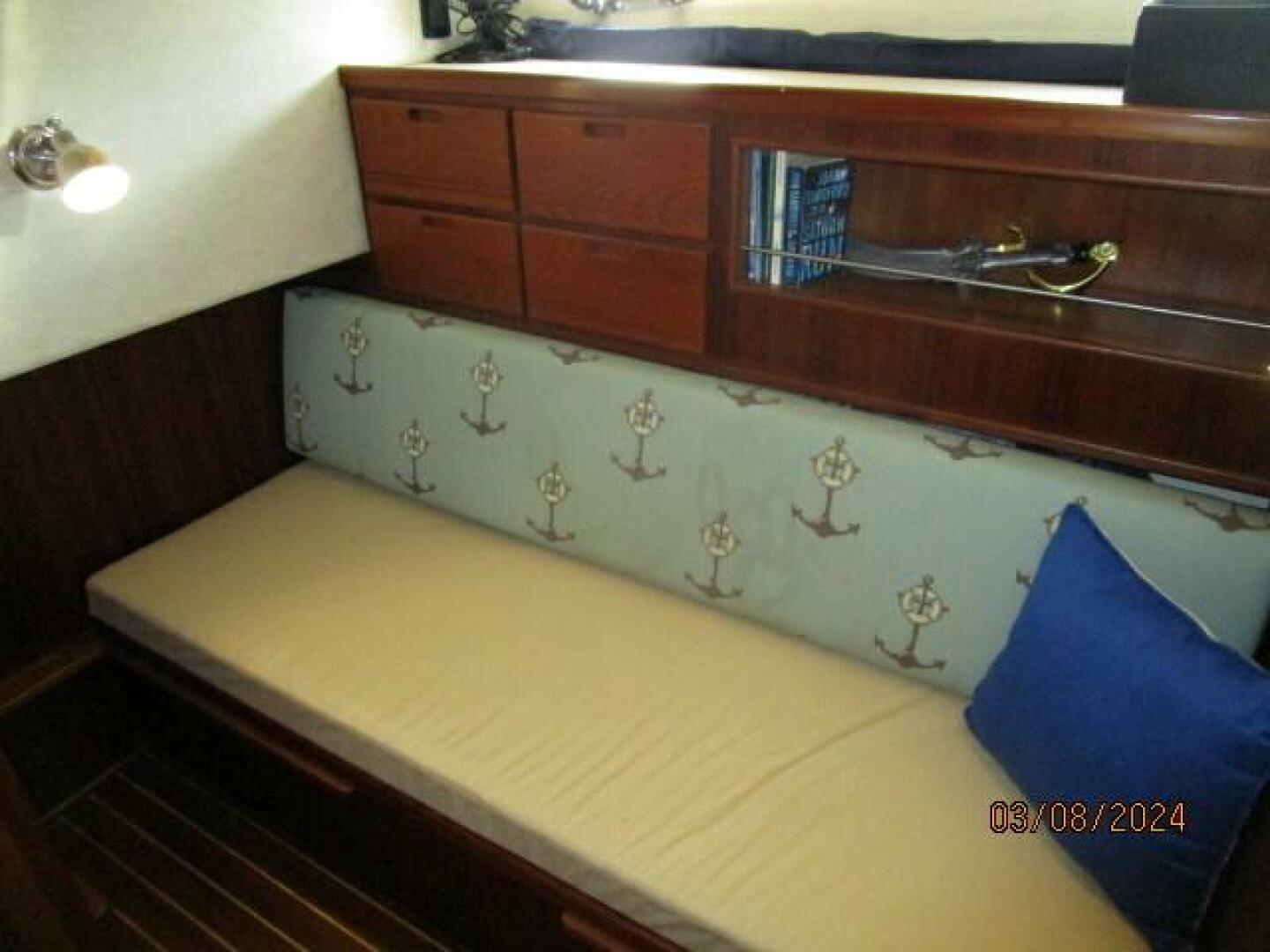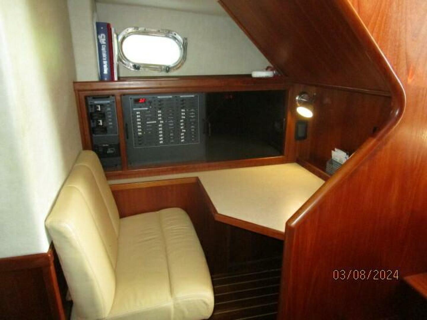The office is on the lower deck across from the guest stateroom and offers a benchseat with storage, desk, portlight, electrical panels, reading light and assorted gauges.