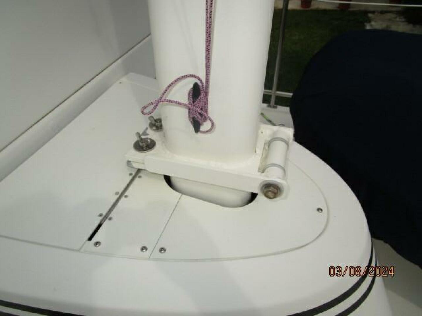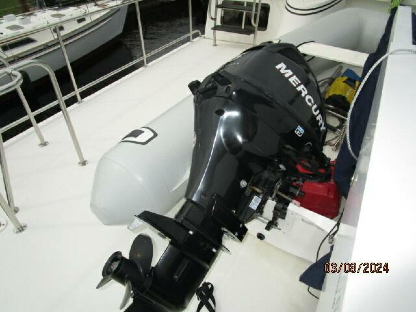 The tender deck offers a hinged mast base, spreader light, stainless steel rails, stainless steel ladder to the aftdeck, tender storage, tender crane and a non-skid deck.