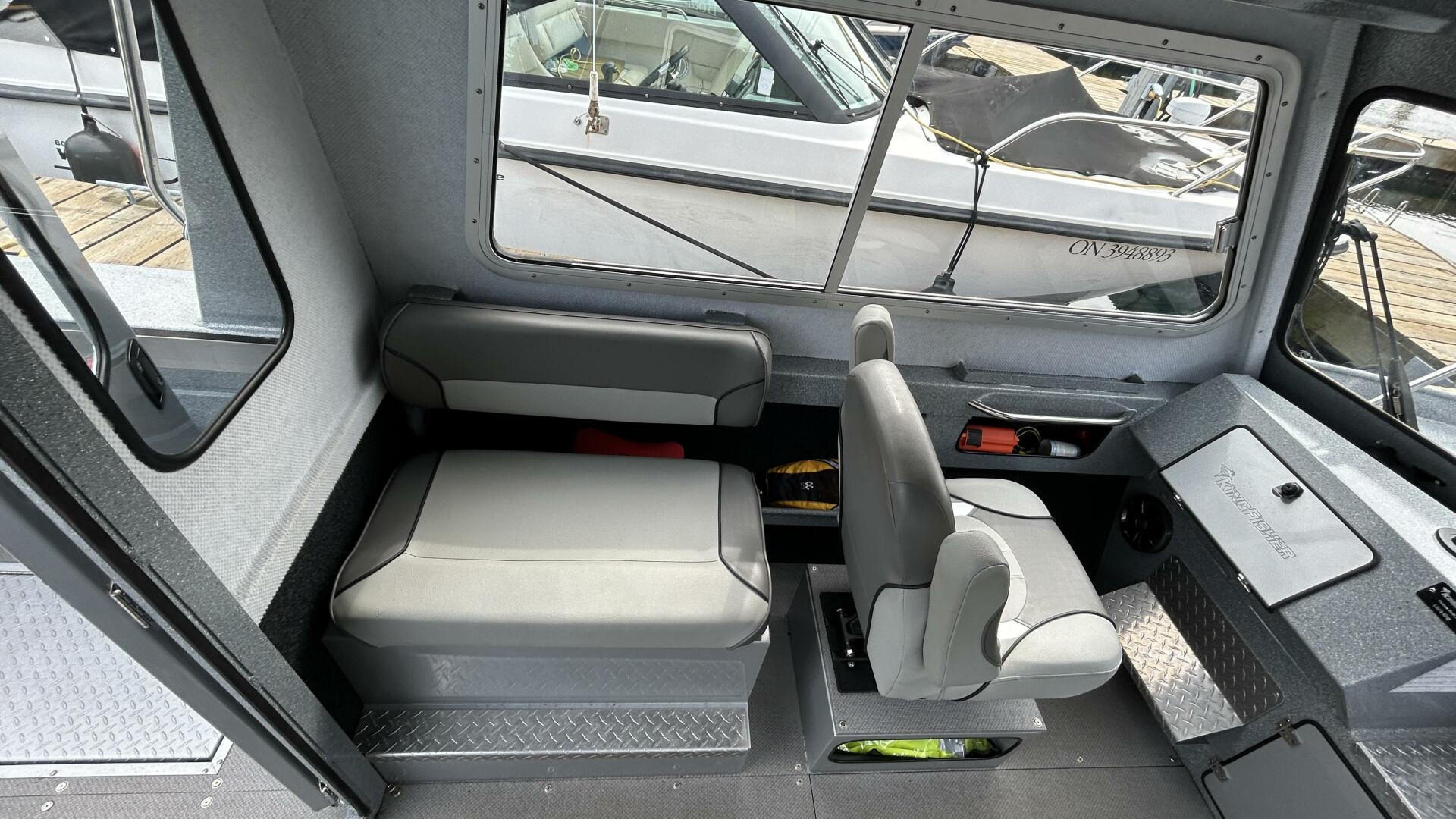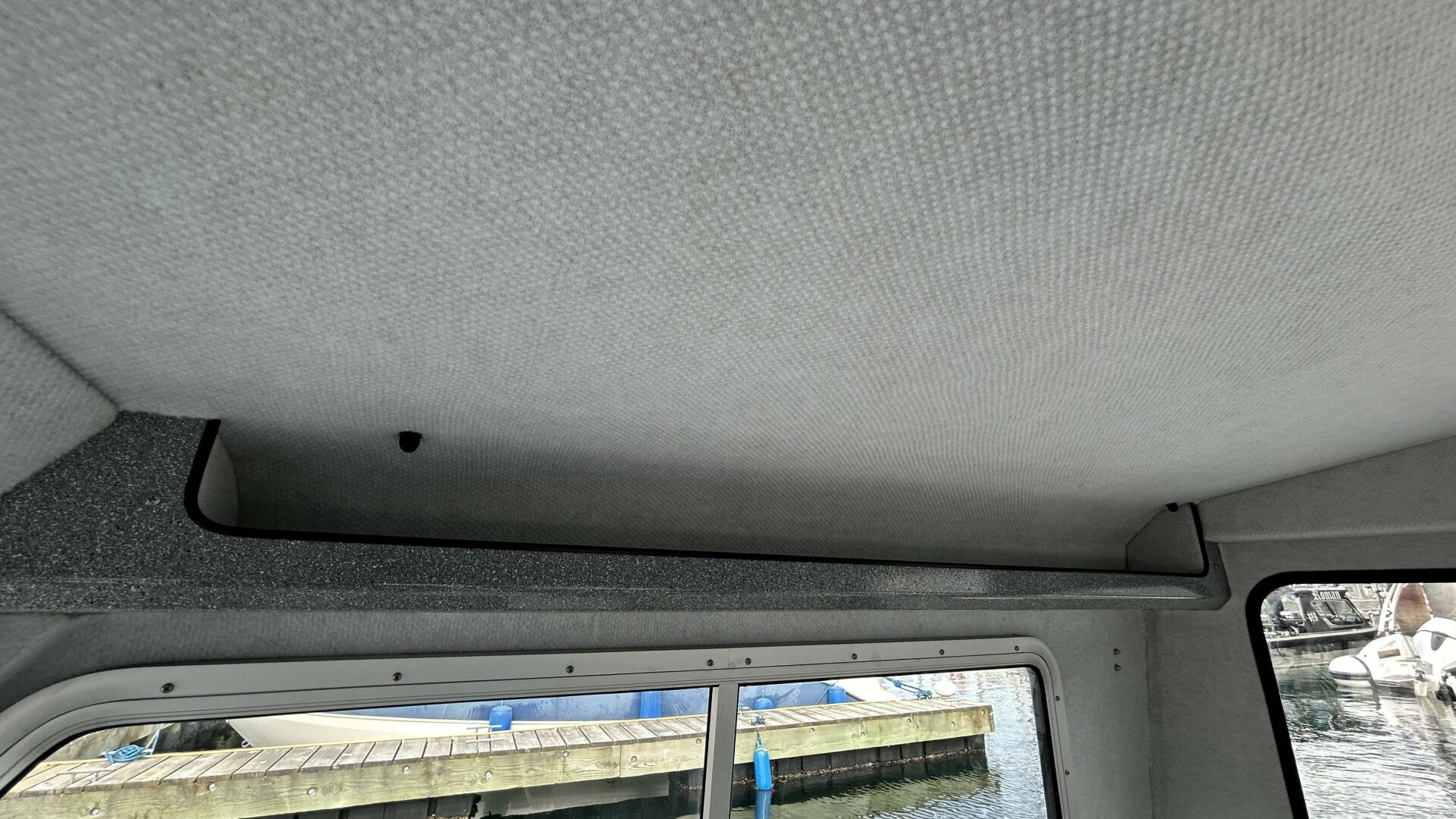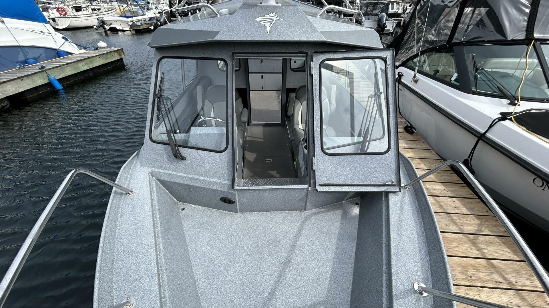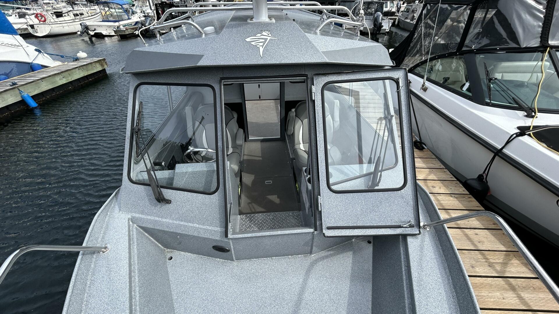 Aft sloping windshield with tempered glass front windows and 2 aluminum framed sliding side windows