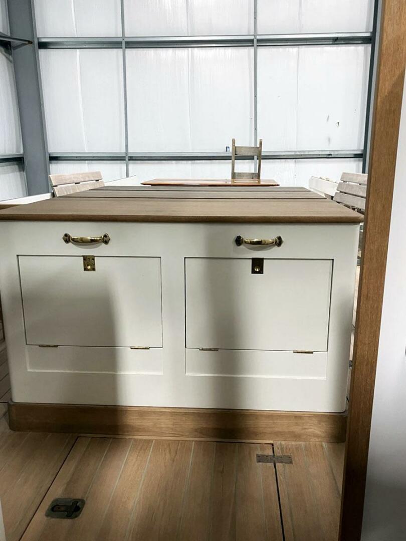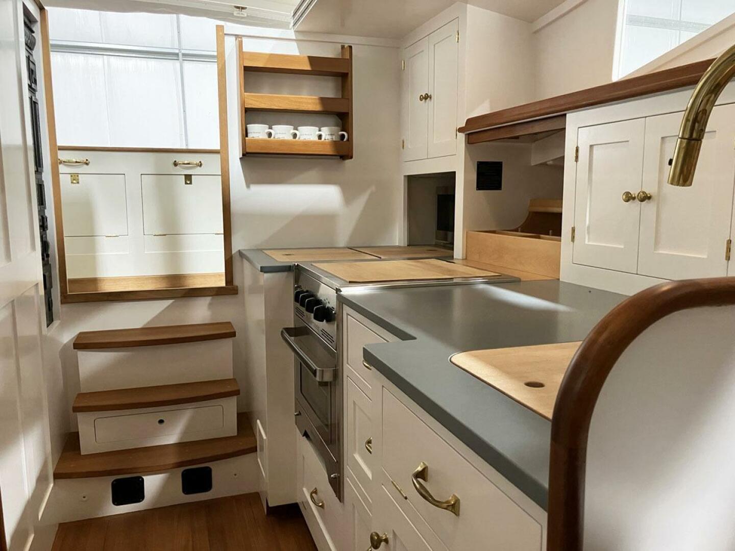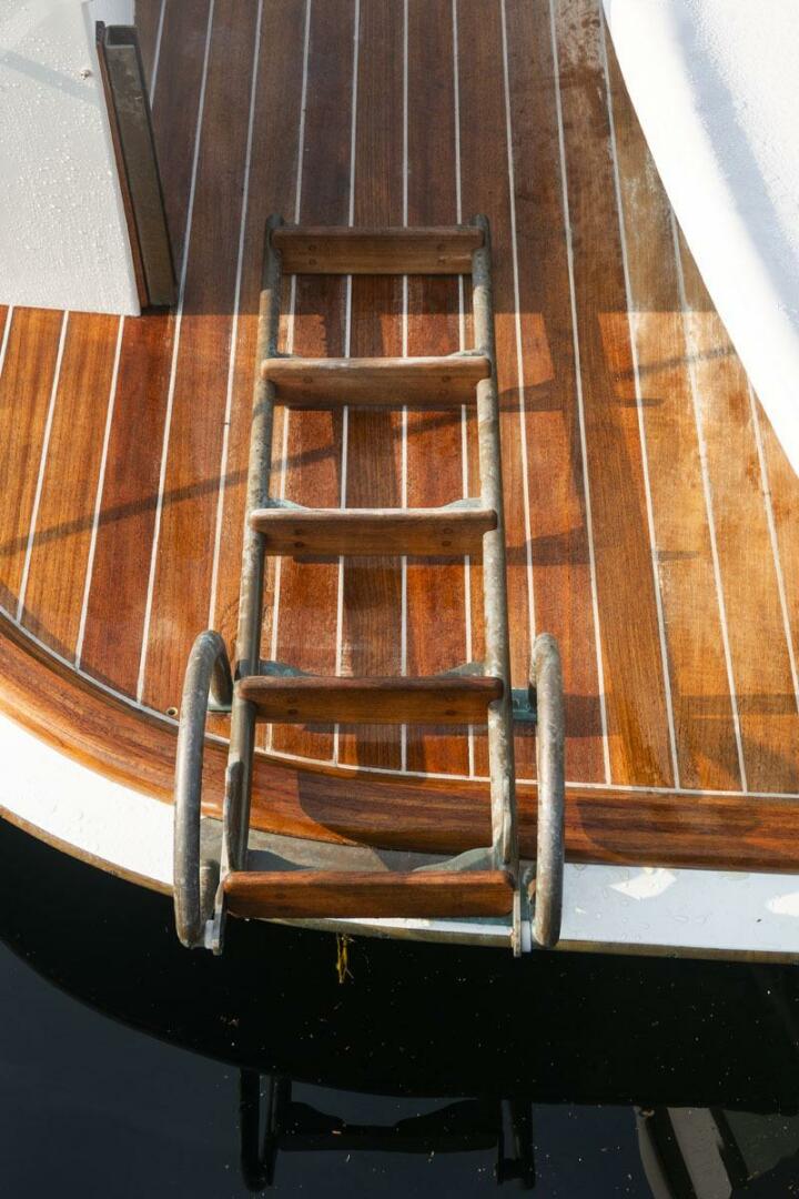 - Transom tailgate – Fir planks that double as fender boards and stow on cabin top