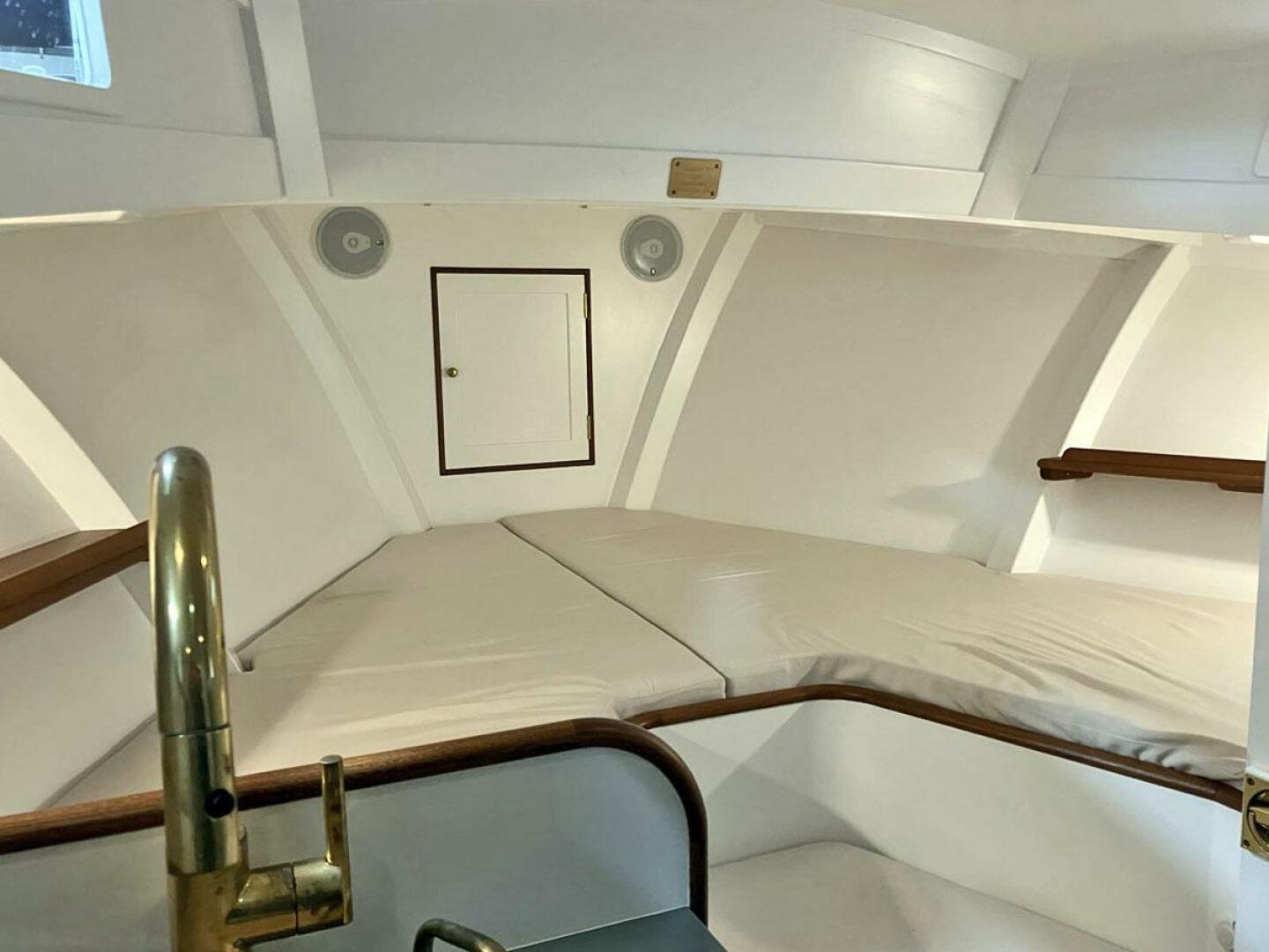 Furthest forward is the anchor chain locker with access door through the fwd bulkhead. Next aft is the Vee-berth sleeping platform with storage bins below the platform, shelf storage above and outboard of the berthing space. Between the separate berths is a cushioned seat with drawer storage underneath. Continuing aft you’ll find the galley area to port with sink basin, gimbaled stove / oven, a 12V DC under-counter fridge / freezer, Silestone countertop, and generous storage for galleyware. Aft and to starboard is the head area with a Groco bronze marine toilet, sink basin, Silestone countertop and plenty of storage for towels and toiletries. There is a generous stall shower separated from the head area with a glass door. The stall is fitted with a custom teak seat, teak floor, and wet locker.