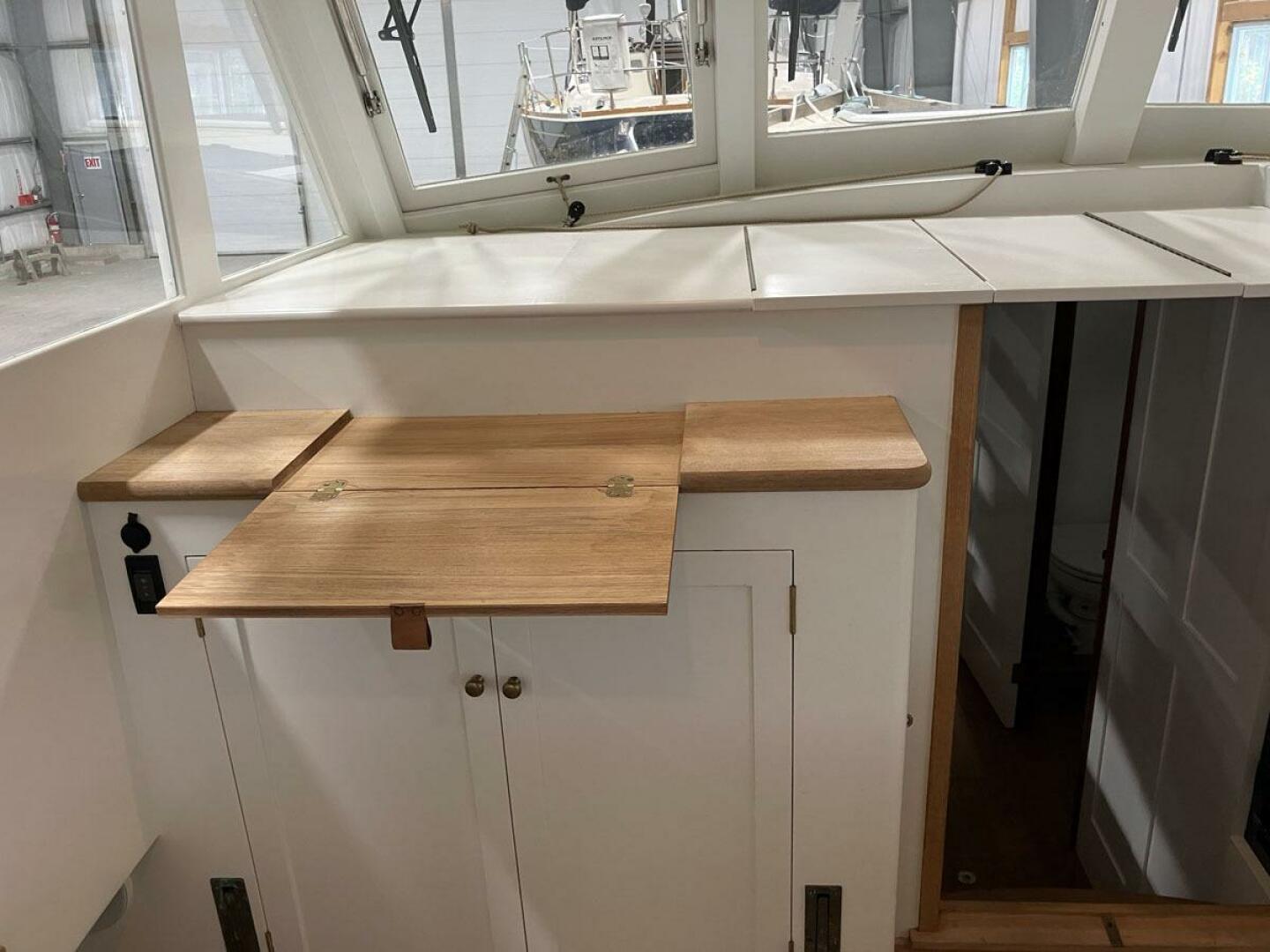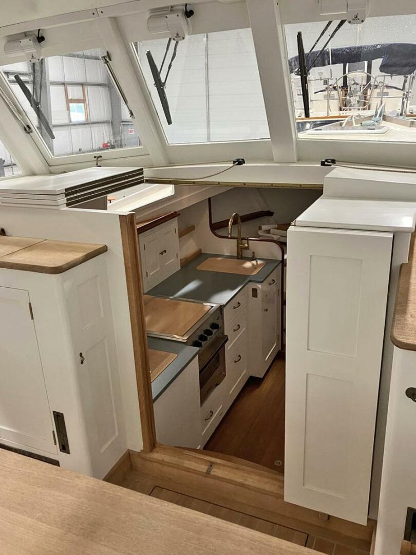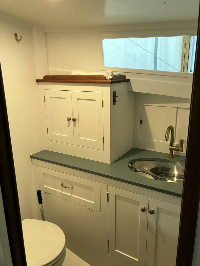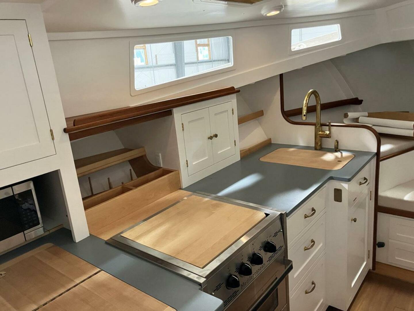 Interior spaces are finished in the classically timeless Herreshoff style of white painted hull interior, bulkheads, partitions, cabin sides, overheads, locker doors and drawer fronts accented by varnished trim, polished brass hardware, polished stainless steel sink basins and solid color counter tops with simple bare teak used for cabin sole and companionway stairs. Ample storage is provided throughout by way of simple but clever drawers, shelves, and cabinets.