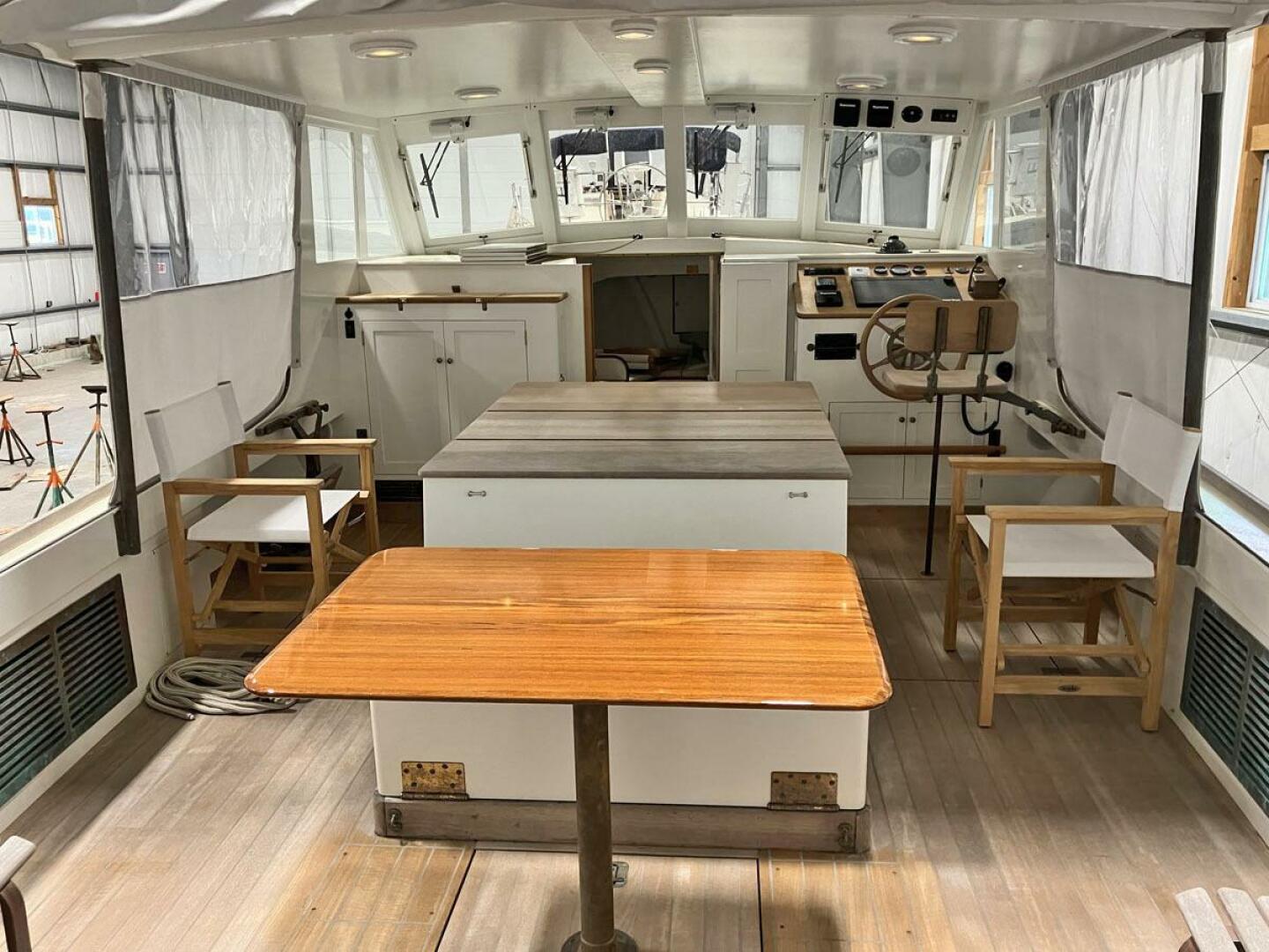 The hull construction consists of Alaskan Yellow Cedar, Western Red Cedar, and Sipo fastened with #10 silicon bronze flathead wood screws. The exterior is sheathed with two layers of 1208 fiberglass cloth infused with epoxy. The keel is of laminated African Mahogany while the chine logs, frames, and sheer clamp are from Laminated Douglas Fir. The engine beds are laminated African Mahogany. All structural bulkheads and stringers are made of marine-grade ply. Silicon bronze was used for all structural fasteners. The deckhouse is made from laminated Spruce and Okoume ply, sheathed in fiberglass. The working deck and cockpit beams are made from Douglas Fir which supports a marine plywood sub-deck overlaid with 3/8” teak surface deck.